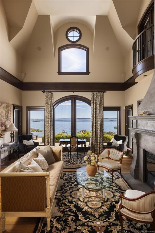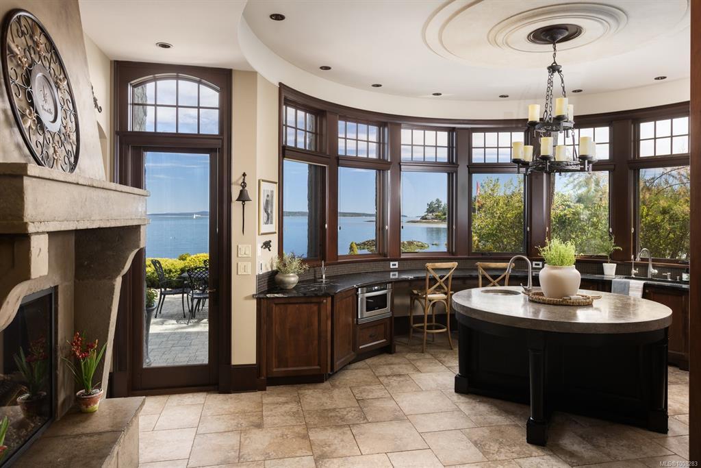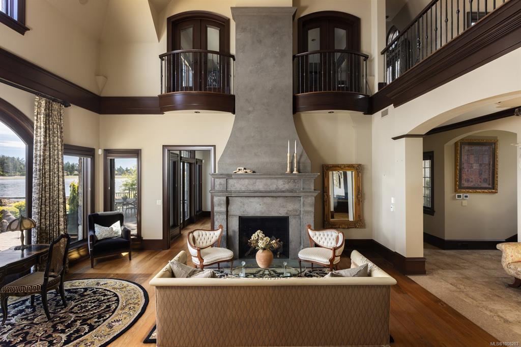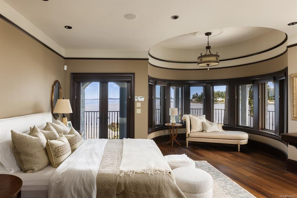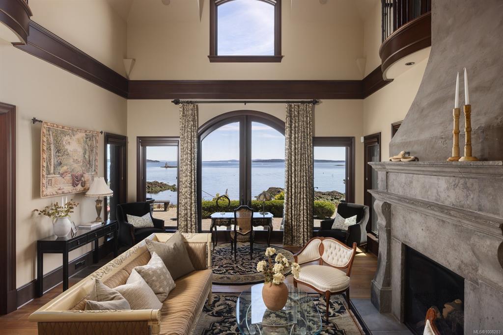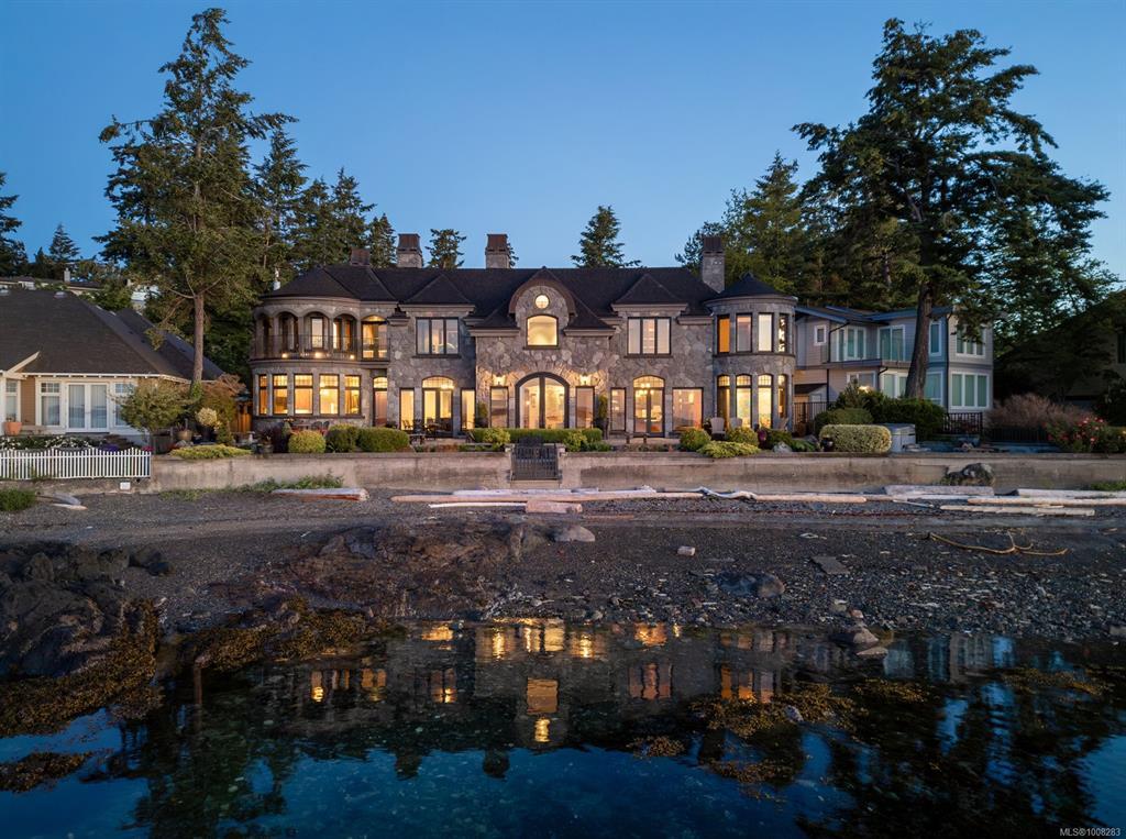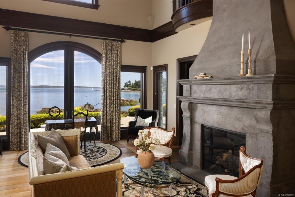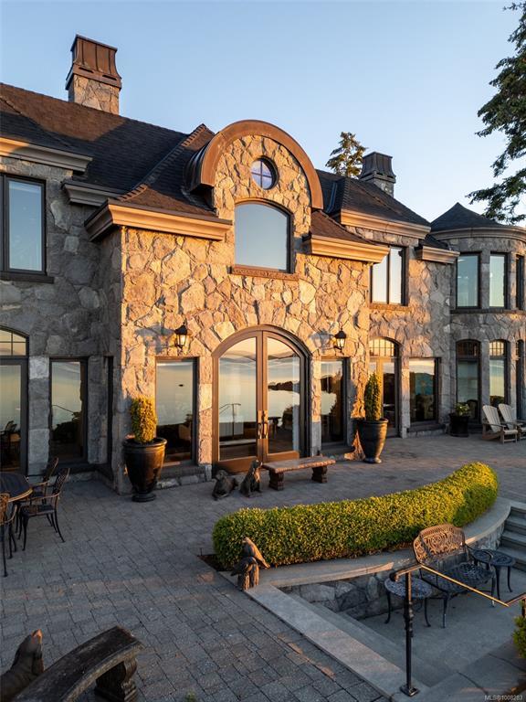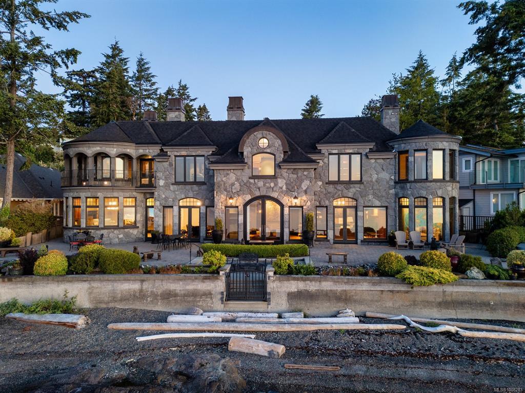 Welcome to this sophisticated West Coast waterfront retreat w/ sweeping views of the Gulf Islands & Mount Baker. This stunning stone residence features soaring ceilings & expansive windows, immersing you in the breathtaking surroundings. Designed for elegance & accessibility, it includes ground-level entry, main-floor guest suite & elevator. Main level boasts a circular kitchen w/ high-end appliances, butler's pantry, dining room & great room w/ 21-ft ceilings. A charming study w/ built-in shelves & coffered ceiling provides an ideal home office. The spiral staircase leads to a luxurious primary suite w/ circular balcony, reading nook, sauna & fireplace. From the WIC, access the enclosed sunroom w/ fireplace & balconies. The media room & family room w/ kitchenette offer additional leisure spaces. Outside, enjoy expansive terraces,private hot tub & direct access to a sandy beach. Fully fenced and gated, this prime location offers easy access to amenities, Airport, BC Ferries & marinas.