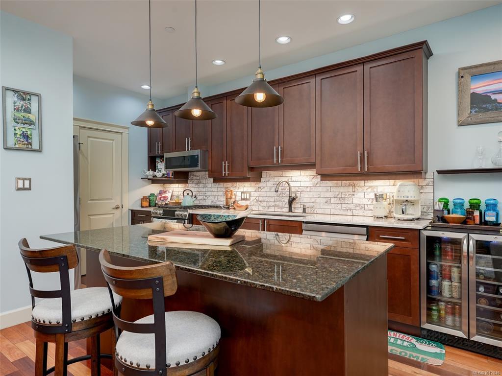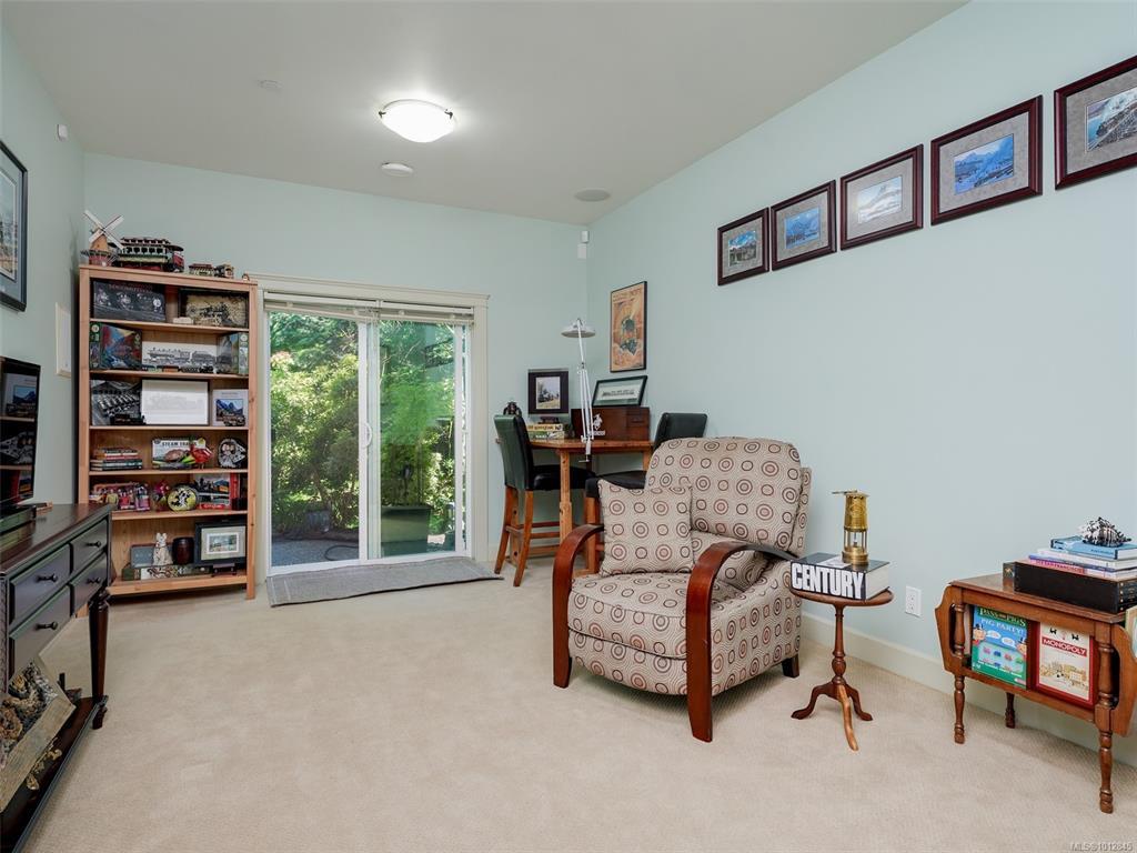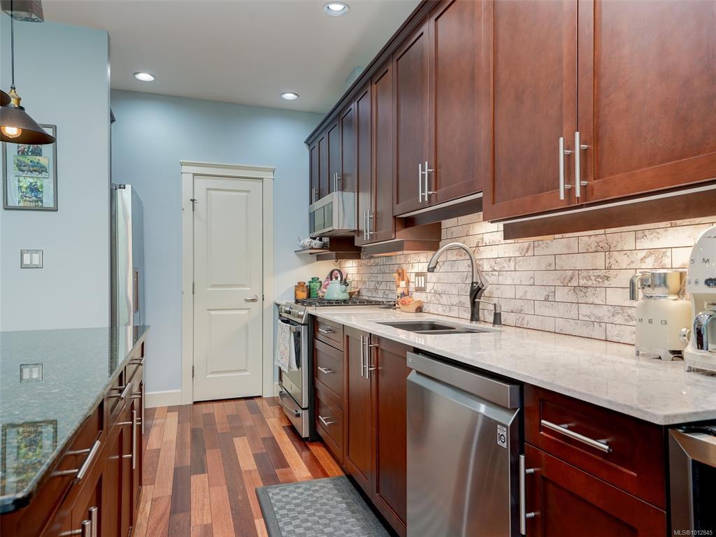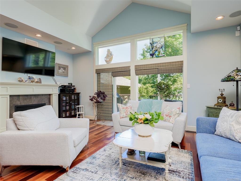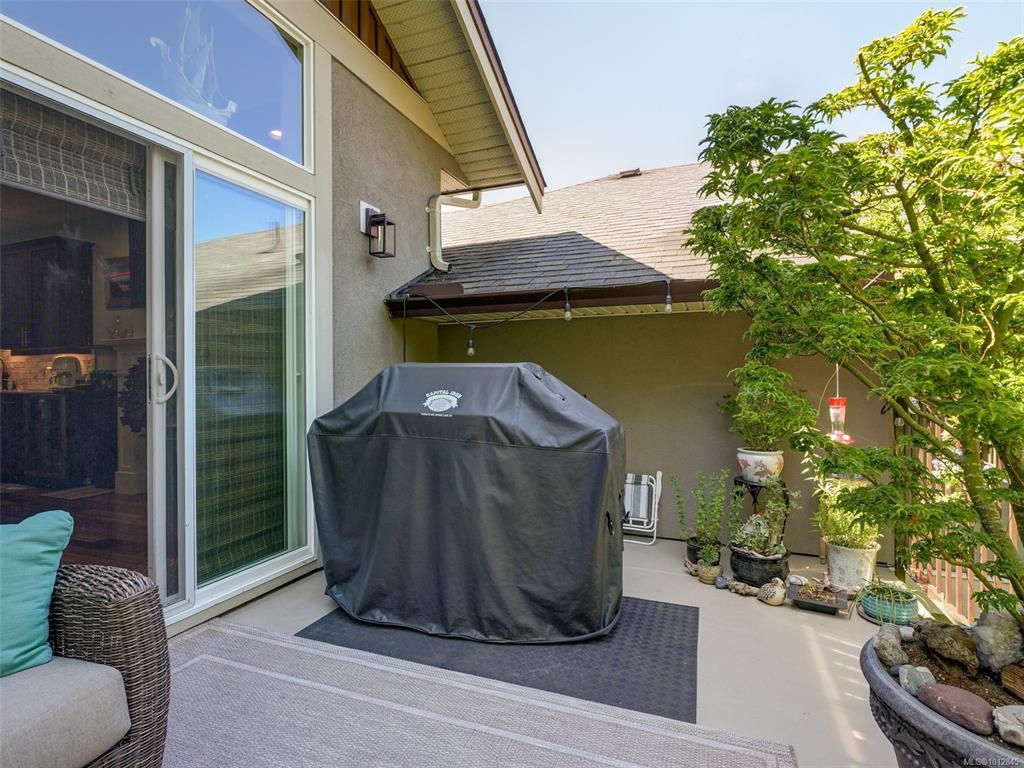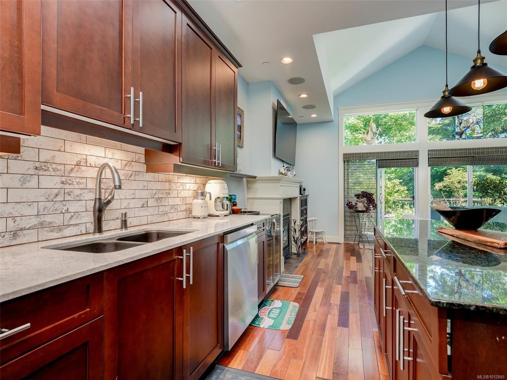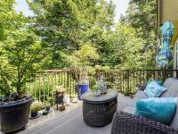 Discover the beauty of Madrona Creek, a stunning gated community backing onto a park-like oasis. This beautifully updated 2,242 sq ft end unit townhouse features true main floor living along with a full walk-out lower level. You'll love the open floor plan with bright kitchen & living room, floor-to-ceiling windows & large sliding glass doors that lead to a huge deck surrounded by greenery. Recent updates include a modern kitchen with SS appliances including a gas range, all new light fixtures & paint throughout. The main floor also includes a graciously appointed primary bedroom & ensuite, a no-step entry from a double garage, laundry & an office at the entrance. The lower floor boasts two large bedrooms, a huge Family Room & a separate Yoga space & steps out to a large patio with footpaths through the foliage. Additional laundry and sink hookups downstairs. Madrona Creek is a short walk from trails, biking routes, golf courses & beautiful beaches.