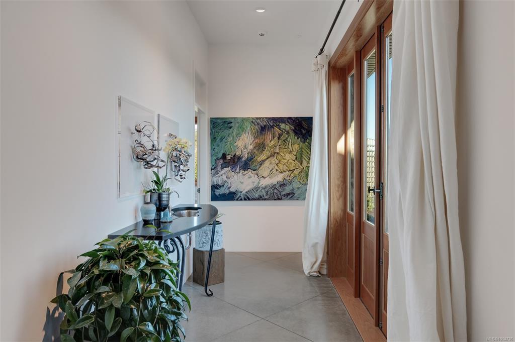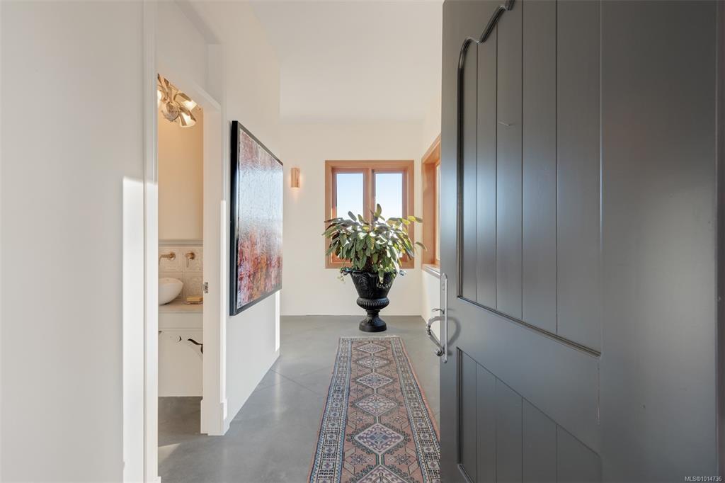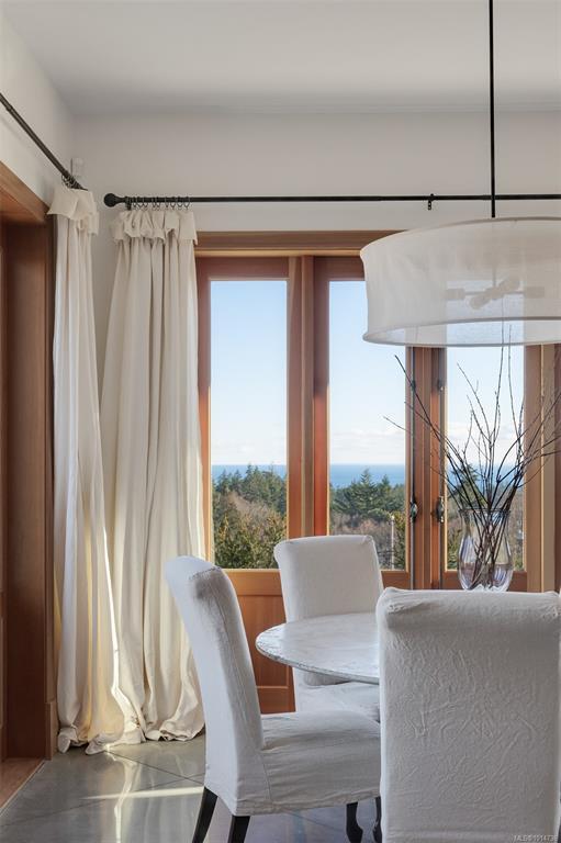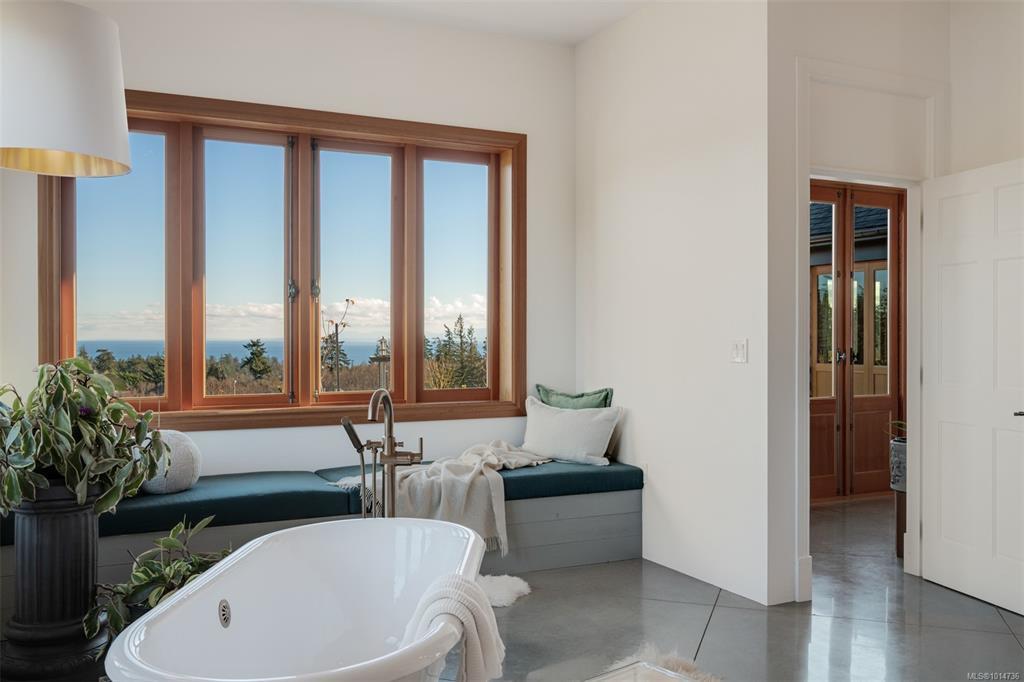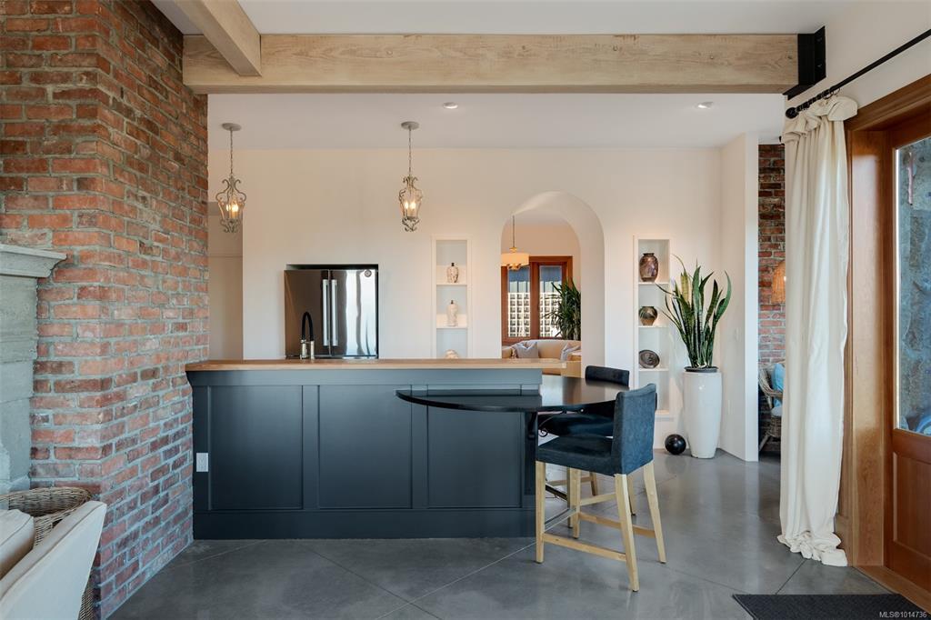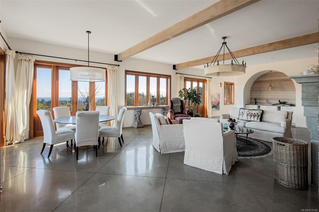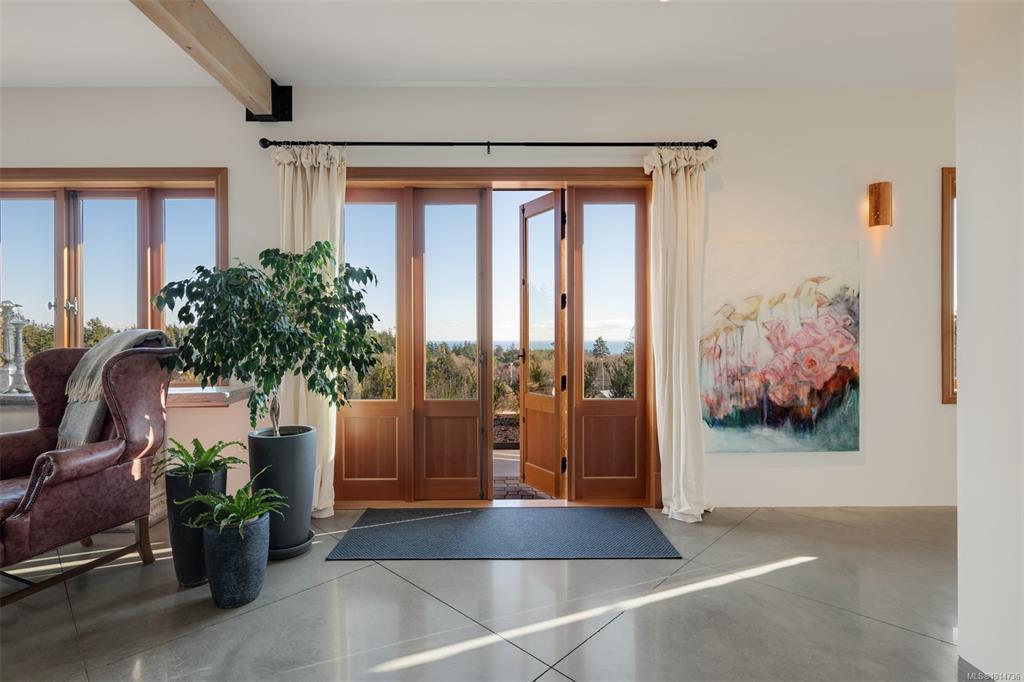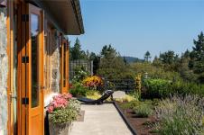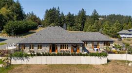 Open House: Sat 1-3. Metchosin Artistic Treasure. This outstanding 4,000+ sq ft one-level home is fashioned to withstand the passage of time. The imposing granite exterior with wrought iron embellishment & concrete water feature heralds the quality & distinctiveness of the interior of this French provincial inspired residence. Polished concrete floors, exposed beams, in-laid wood feature floors & reclaimed brick accents make it warm & inviting with refreshing originality & artistic flourish rarely seen in new builds. The spacious great room boasts a magnificent bespoke fireplace & multiple custom French doors give access to the patio. A sep. prep area is a feature of the well-laid out kitchen. The primary retreat will satisfy any discerning buyer. Geo-thermal heating reduces the carbon footprint. An auxiliary building includes a 1,380 sq ft art studio w/ bathroom, workshop & garage. Nestled in the rolling hillside, on 2.4 acres with views across Haro Strait to the Olympic mountains