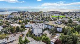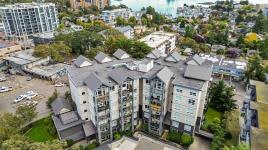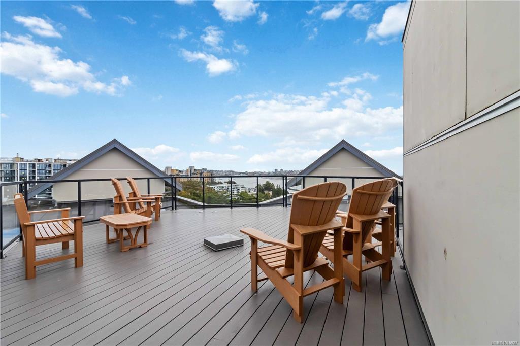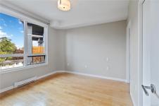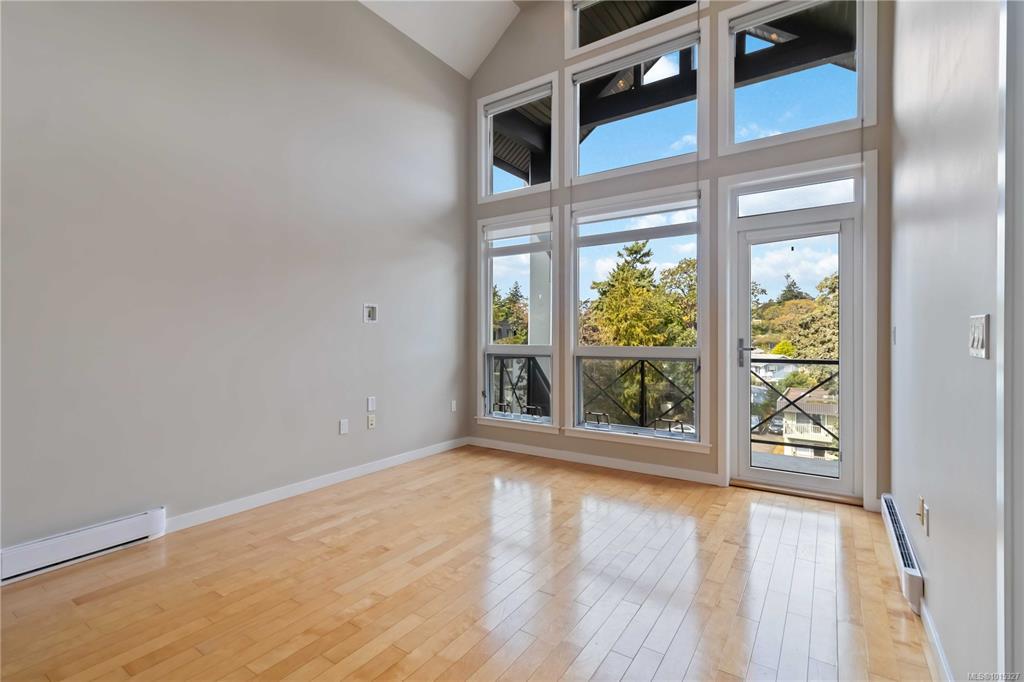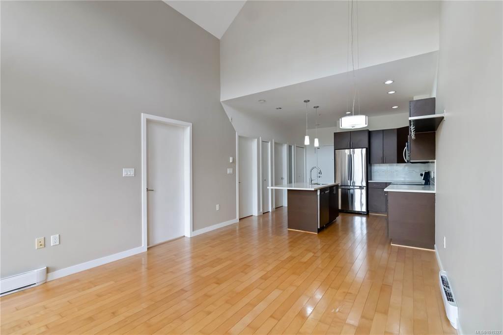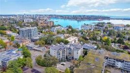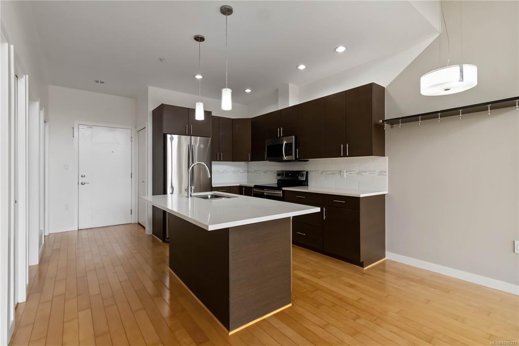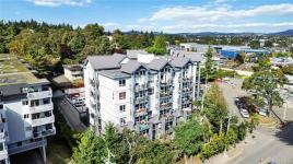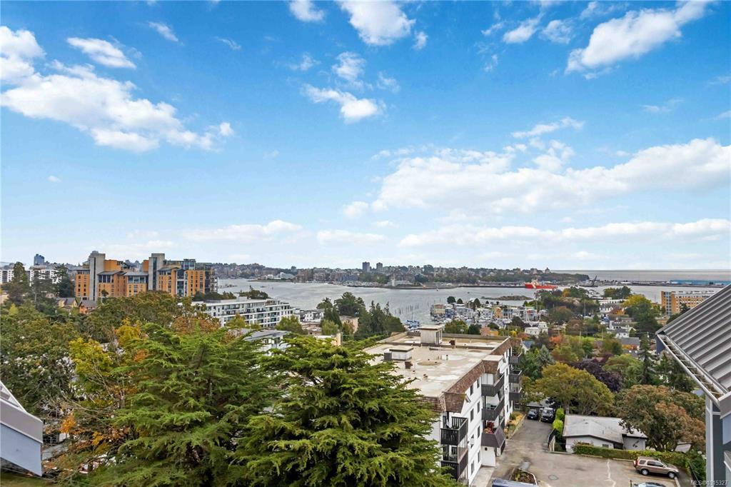 Soaring above buildings and treetops is this beautiful 2 bedroom, top floor unit in Skyline Residences. This condo is uniquely designed and offers a wonderful open-concept floor plan with modern kitchen, quartz countertops, stainless steel appliances and kitchen island which blends modern living with functionality. Natural light pours through the floor to ceilings windows in the living room featuring 16ft vaulted ceilings. Large primary bedroom with an abundance of light with ensuite, second bedroom with second bathroom and laundry round out this well designed condo. Located on the quiet side of the building and including secured underground parking spot as well as a storage locker. Bonus - roof top patio with inner harbour views for your enjoyment with a location that is perfectly located just minutes to downtown Victoria, shops, parks, military base, école Victor-Brodeur and buses. Rentals permitted and pets allowed! Vacant with quick possession!