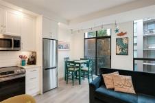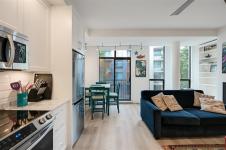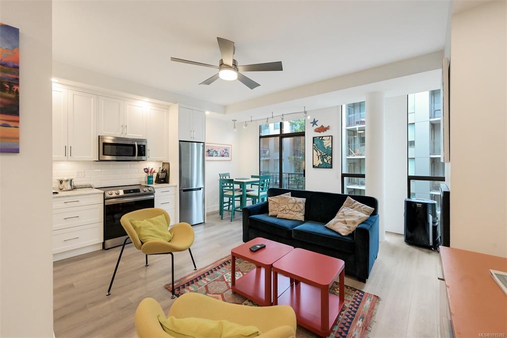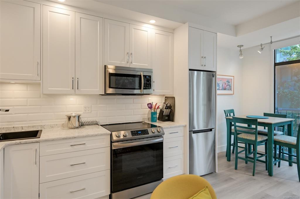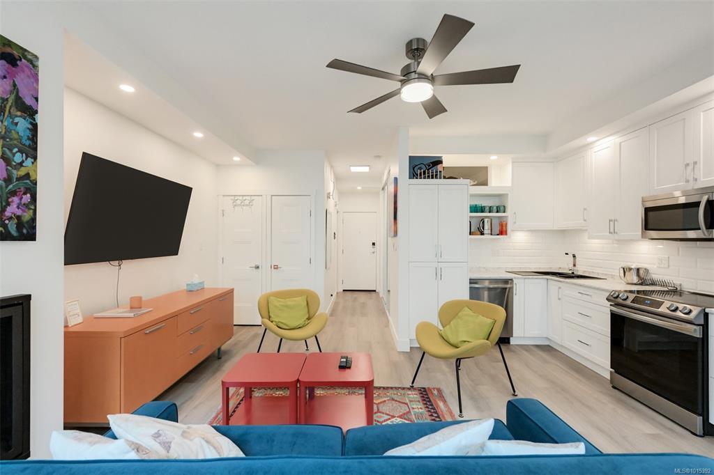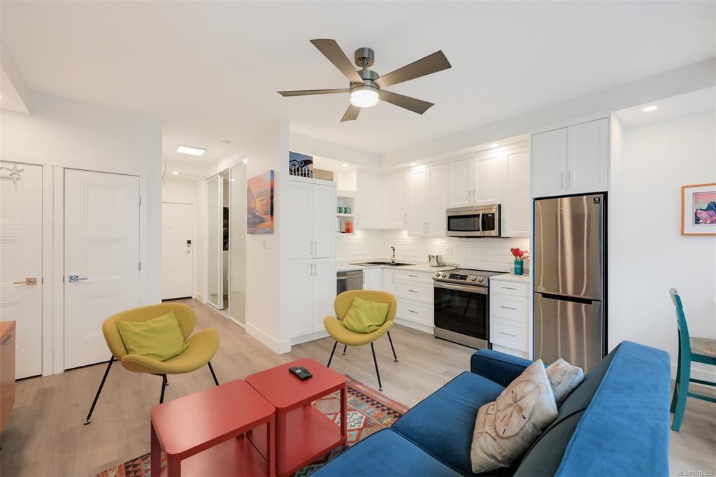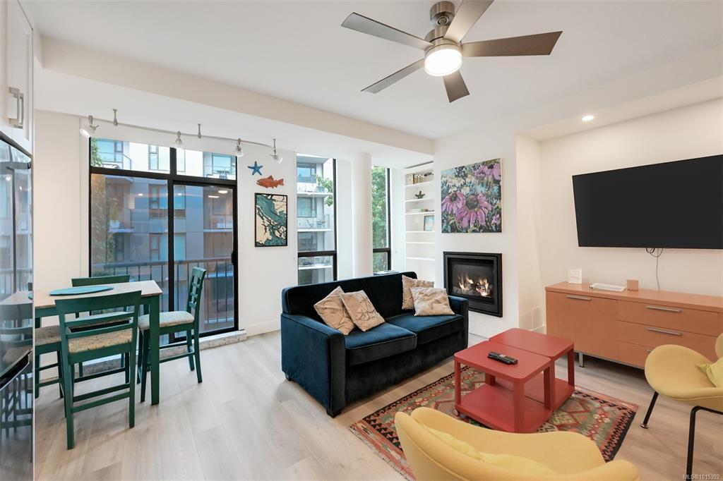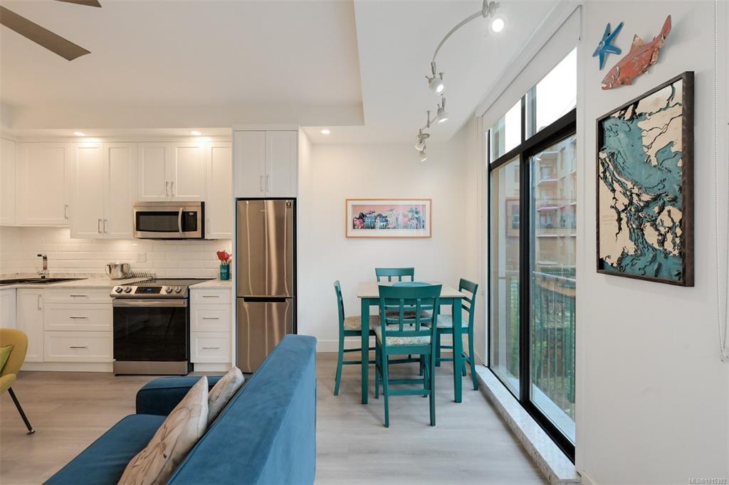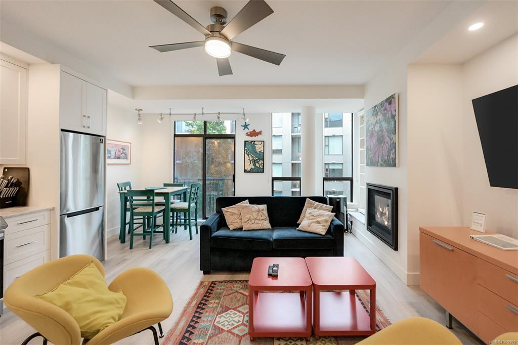 Newly remodled unit with an actual bedroom in this waterfront condo with parking lot! The unit comes with cozy gas fireplace, a 4pc bathroom, and an in-suite washer/dryer. The building also has rooftop patio with BBQ, and a storage locker in the basement, also included. The LOCATION can't be beat in the heart of downtown Victoria. Just a few steps and you'll get to pretty much anywhere in downtown. Water taxi and kayaking are also just downstairs. The whole strata is pet friendly, it is also a great investment opportunity for convenient living or an excellent affordable rental property. Low Monthly strata fee that Includes Gas, Hot Water, Insurance, Management etc.