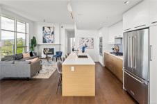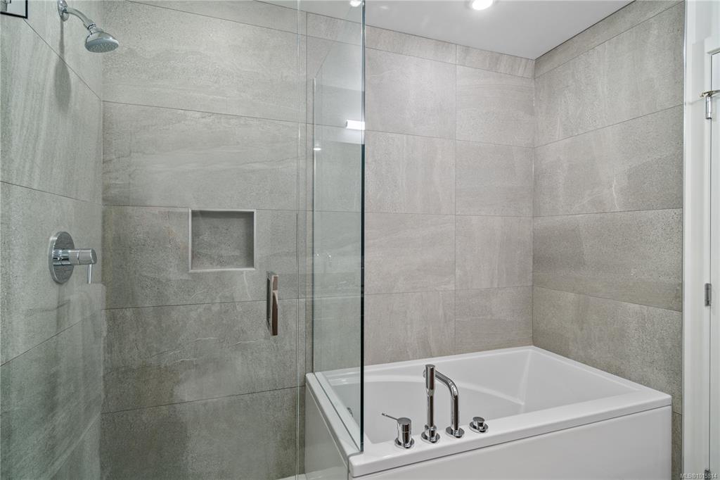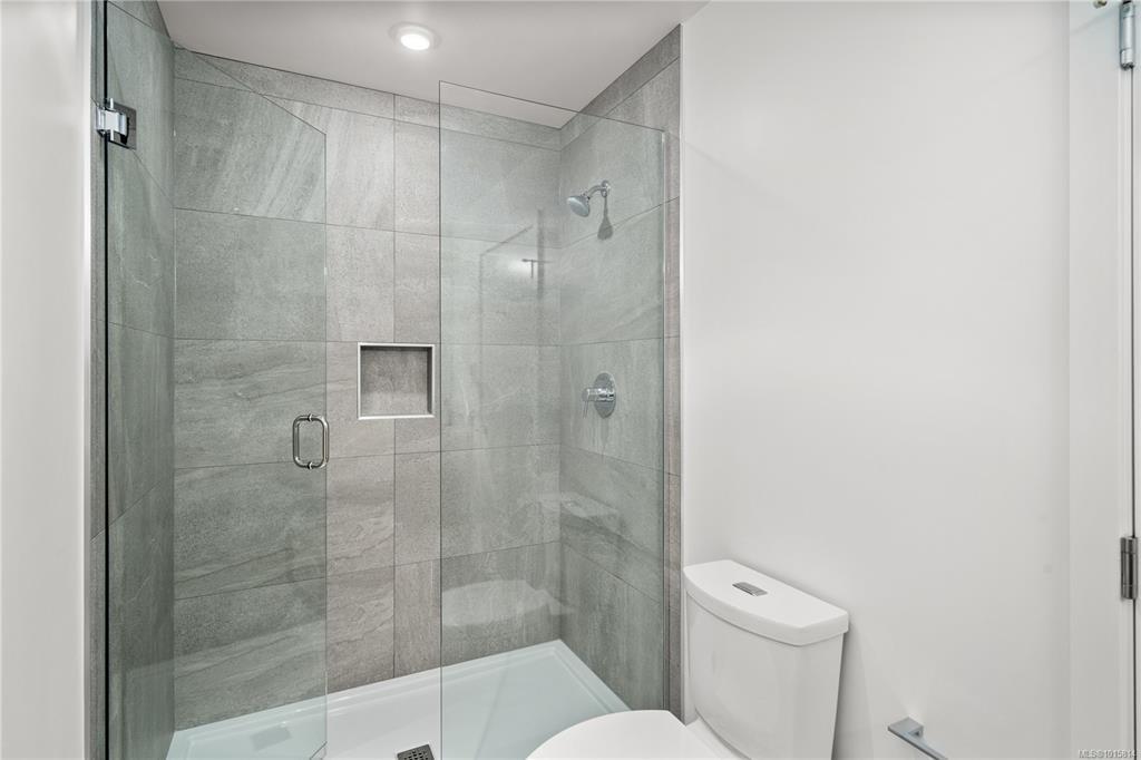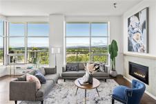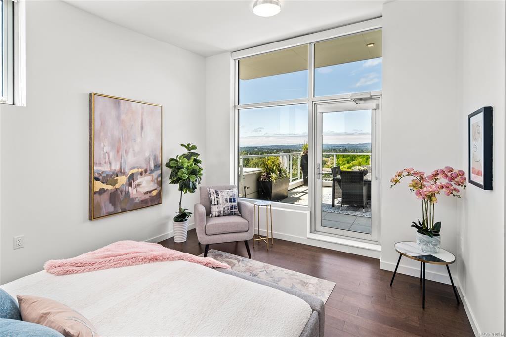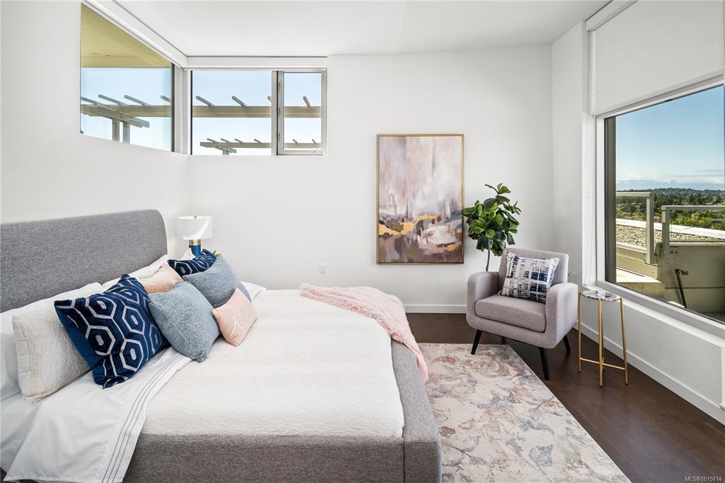 A Rare Penthouse Offering. The premier residence in this steel & concrete development and one of only two on its floor, this home is truly without equal. Nearly 1,600 sq.ft. of private terraces showcase 300° views from downtown Victoria to the Sooke Hills & Olympic Mountains. Inside, 1,568 sq.ft. of light-filled space features vaulted ceilings, expansive windows, built-in valences & heat pumps found only in penthouse homes. A split-bedroom layout ensures privacy, each with a deluxe ensuite, while most rooms enjoy private outlooks. The kitchen highlights quartz surfaces, premium cabinetry & bar seating, flowing to open living & dining with a gas fireplace. Outdoor living is unrivalled - oversized balcony with hot tub, three lighted arbours & fire pit create a retreat unmatched by any other unit. Two parking stalls closest to the elevator plus oversized storage add convenience. Pets welcome! Just 20 mins to Sidney or downtown, plus easy access to nearby trails.