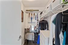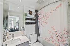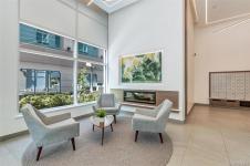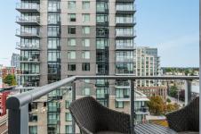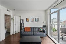The inviting living area flows to a private covered balcony—perfect for enjoying the urban backdrop year-round. The spacious bedroom features a generous walk-in closet, while the elegant bathroom includes in-floor heating. Additional highlights: in-suite laundry and an A/C heat pump.