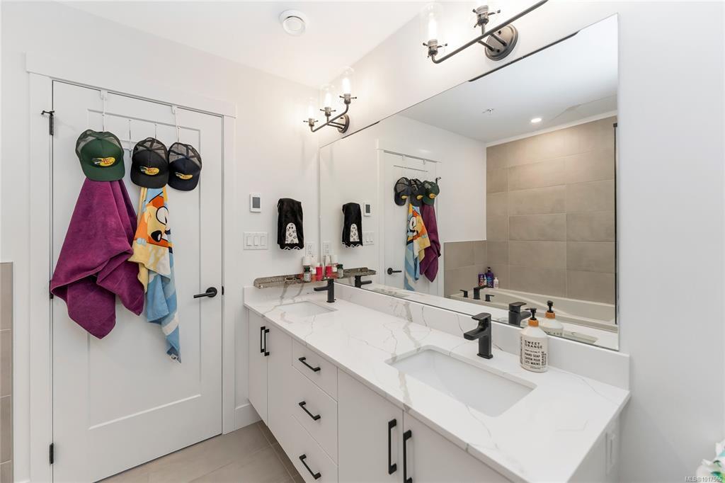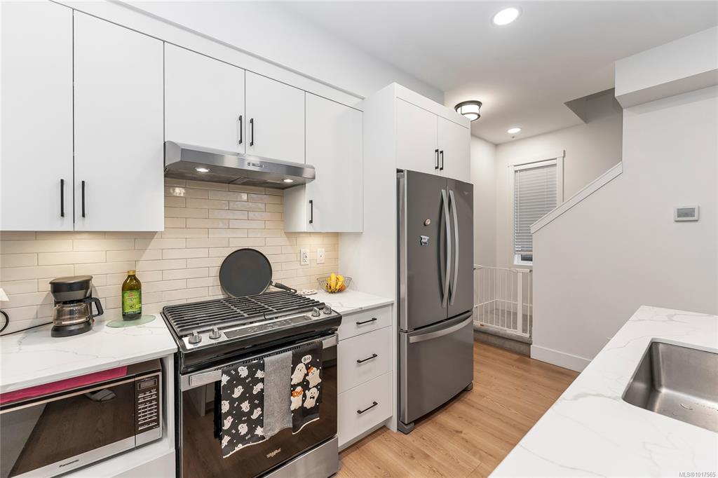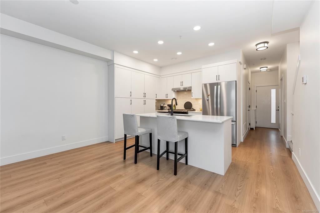 Open House: Sat Nov 8, 2:00-4:00 PM. Welcome to your new home in Royal Bay! This 3-bed, 3-bath corner-unit townhome is in one of Colwood's most sought-after seaside communities. Built in 2023, it still feels brand new with a 2-5-10 new home warranty and move-in-ready condition. Open-concept layout with 9-foot ceilings and upgraded laminate flooring. Modern Kitchen features quartz countertops and stainless steel Whirlpool appliances (including a natural gas stove). High-efficiency gas furnace, and on-demand hot water. Garage + driveway parking, with a Level 2 EV Charger ready for your EV.