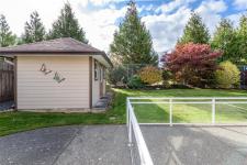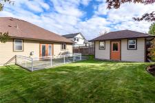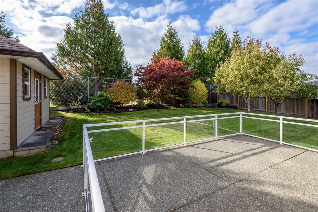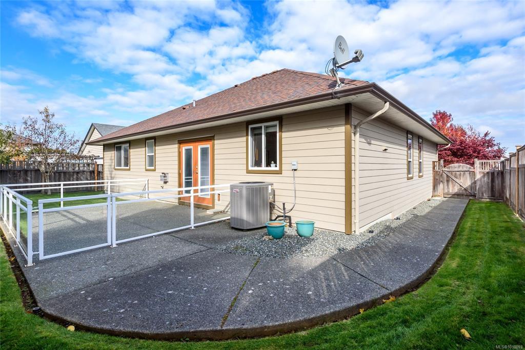 Beautiful Comox rancher with double garage and exceptional storage. This spacious 1,850 sq. ft. rancher in a quiet Comox neighbourhood, just a short walk to nearby shopping. This well-designed home offers three bedrooms plus a den/office—all on one convenient level. The interior features hardwood floors and maple shaker cabinetry, creating a warm and inviting atmosphere throughout. The open-concept kitchen and family room are perfect for entertaining, with a corner gas fireplace, French doors leading to the private back patio, and a separate island providing workspace and additional seating. Built-in cabinetry for ample storage, and privacy blinds are installed on all windows. The primary suite includes a walk-in closet and an ensuite with a walk-in shower. Two additional bedrooms are near the main four-piece bathroom. Practicality meets comfort with a heat pump for efficient year-round heating and cooling, hardi plank siding and a backyard shed for even more storage or workshop space.
