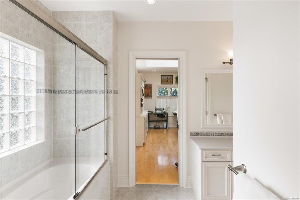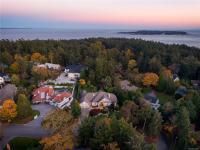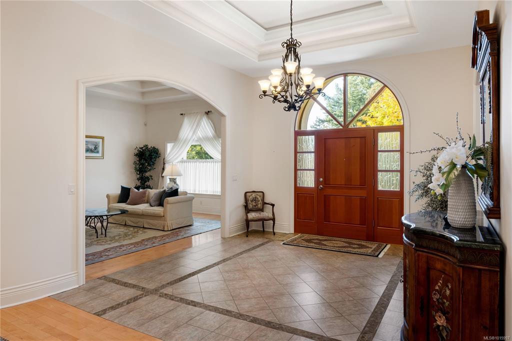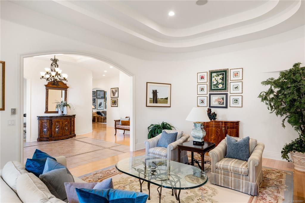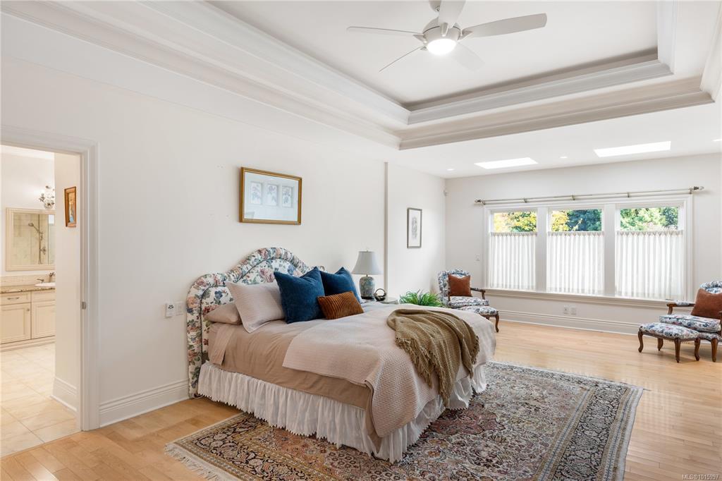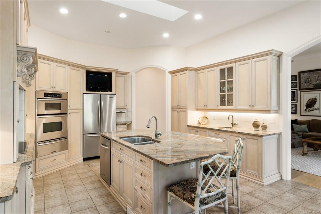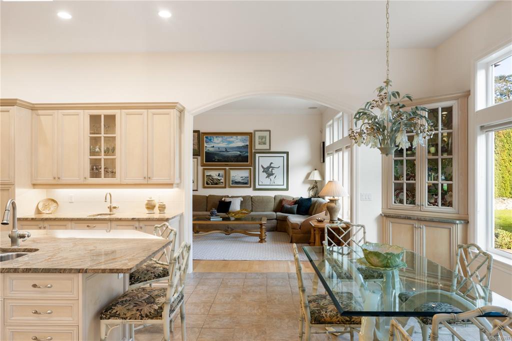Elegant Custom-Built Rancher on Ten Mile Point! Situated on a gently sloping 0.44-acre lot with lush gardens, this sprawling, custom-built home impresses at every turn. Inspired architectural details: tray and coffered ceilings up to 12'4", gentle curves, and well-placed skylights communicate grandeur throughout. With 4,200 sq. ft. on the main level, the layout provides exceptional single-level living, with bonus space downstairs for guests or large gatherings. The kitchen, positioned at the heart of the plan, is flanked by the family room, dining area, and private patio. The spacious primary bedroom, featuring a 6-piece ensuite and WIC, forms a private retreat at the north end, while 2 additional beds complete the main level wing. This peaceful setting, on a no-through street, connects seamlessly with local parks and trails and is steps from some of Victoria's most pristine shoreline. All just a short drive from the convenience of Cadboro Bay, UVIC, RVYC, and more.
