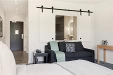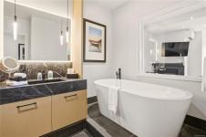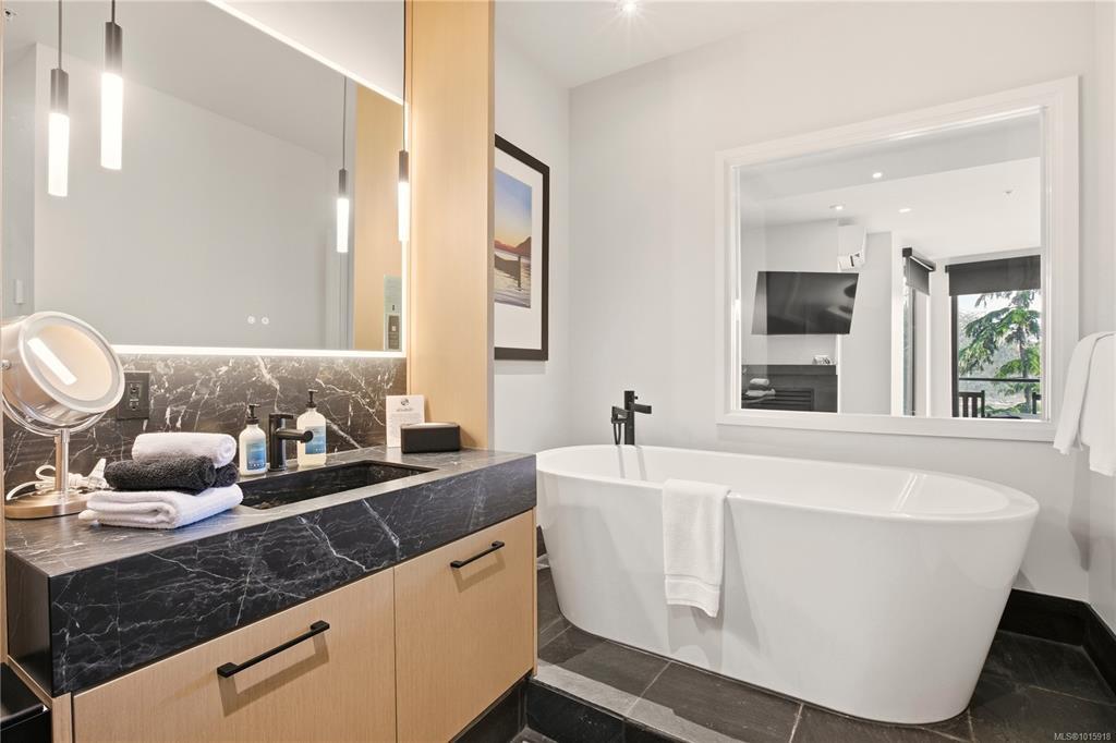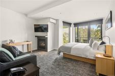 Luxury Studio Suite with Water Views at Black Rock Oceanfront Resort. This upgraded main-lodge studio offers refined coastal living with enhanced privacy and southwest exposure. The custom kitchen expansion includes quartz countertops, extended base cabinetry with oversized drawer and shelving, Wolf induction cooktop, and Whirlpool full-height fridge, convection oven/microwave, and dishwasher. The spacious spa-inspired bathroom features a Riobel rain-head shower, designer sink, pendant lighting, a backlit mirror with adjustable settings, and heated floors. Stay comfortable year-round with a heat pump for heating and cooling plus a cozy gas fireplace. Positioned on the 3rd floor, the suite is easily accessible by elevator and enjoys tree-framed water views and natural light. A premium studio retreat in a sought-after oceanfront resort.
