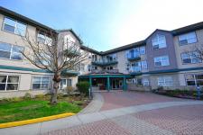 Enjoy comfort, privacy, and independence in this bright, private corner Suite at 55+ Rosebank Gardens. This garden-level home juts out from the main building, so no one lives above you, and it features a lockable patio entrance for added convenience. The kitchen has upgraded wood cabinetry and a double sink on an open-concept counter overlooking the living area. The bathroom is has been updated w/ a walk-in tub & shower head, complemented by ceramic tile flooring. A large in-suite storage/utility room w/ an outlet provides extra functionality. Step outside to your private walk-out patio, complete w/ wrought iron window planters & lattice fencing, overlooking the beautifully maintained common garden green space. Rose Bank Gardens offers 1 meal/day, weekly cleaning & linen service, 24-hour staff, First Alert response, coinless laundry on every floor, lounge/dining areas, activity room, guest suite & beautifully landscaped grounds. Just a short walk to groceries, library, and amenities.