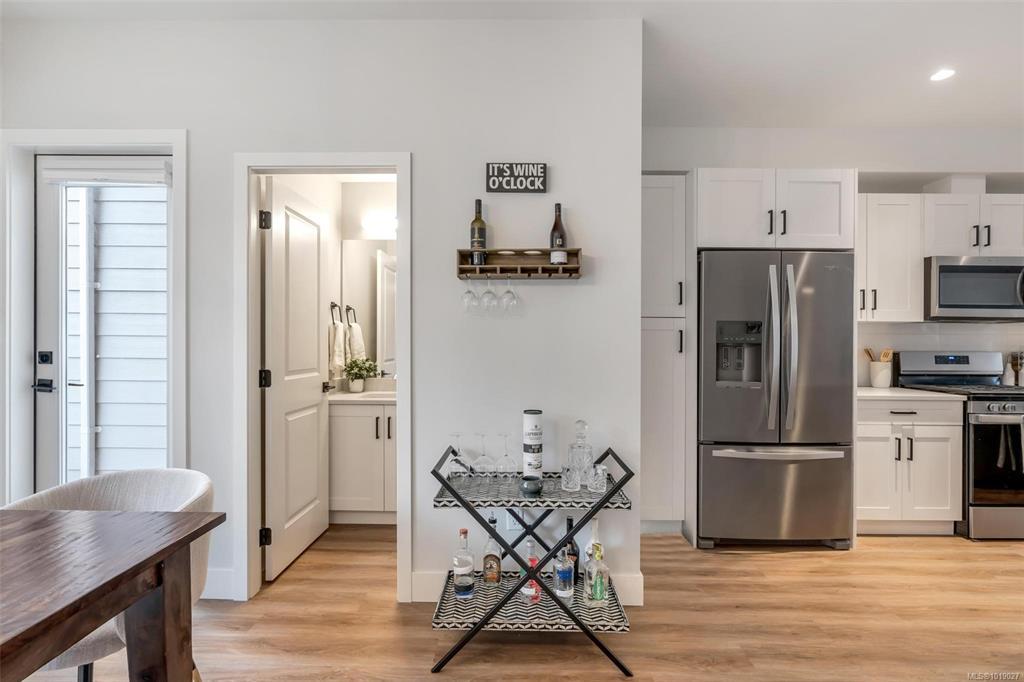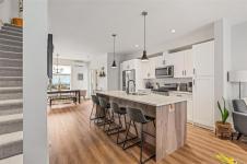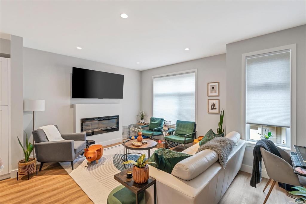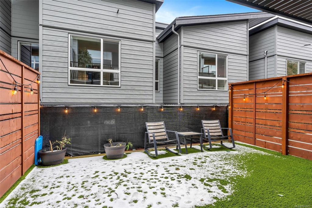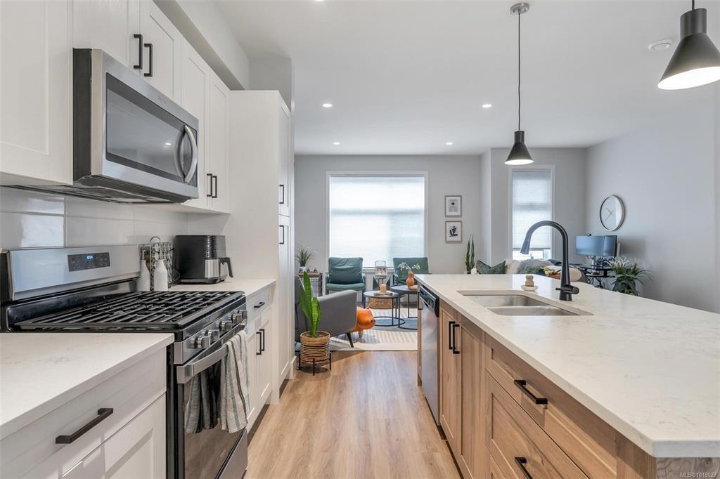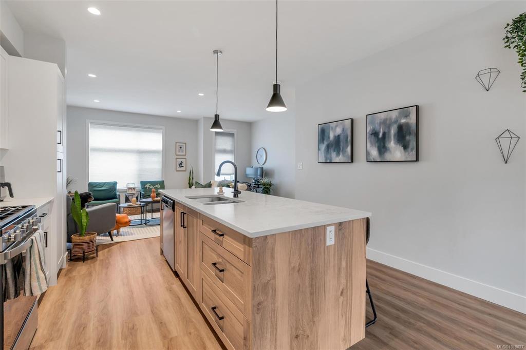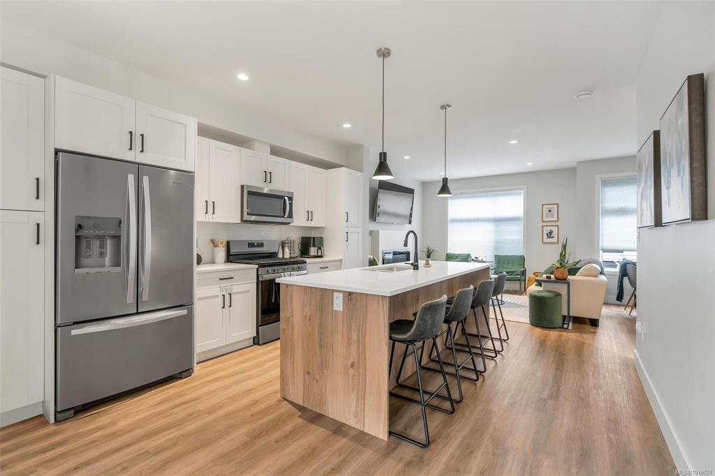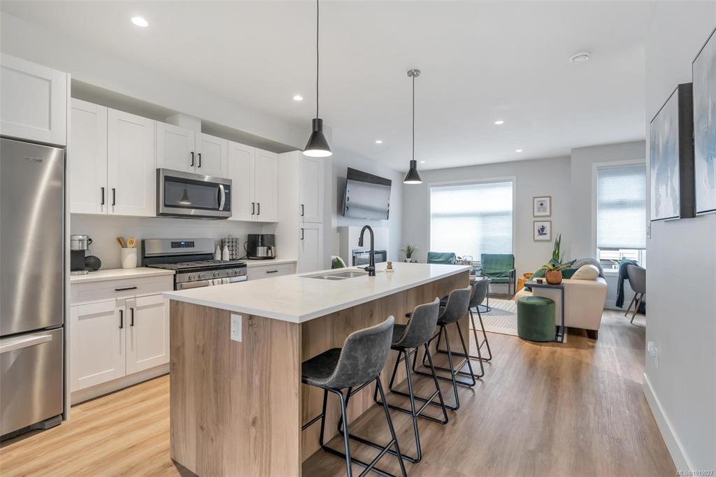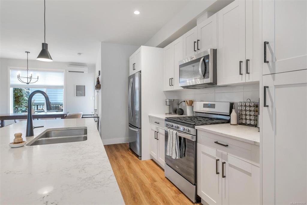 This well designed 1450 sqft home offers 3 bedrooms on the upper level, 3 bathrooms in total, & an oversized 532 sqft garage. The main floor has a bright, open concept layout with a chef inspired kitchen at the centre of the space. It features stainless appliances with a gas range, soft close drawers, a floor to ceiling pantry, tile backsplash & a massive island that connects the dining & living rooms. Enjoy 9ft ceilings, an electric fireplace, cordless blinds, AC, on demand hot water, & quartz countertops throughout the home. Upstairs, the primary bedroom includes a four piece ensuite & a walk-in closet. Outside, you’ll find a south facing deck & a fully fenced yard — perfect for kids, pets or entertaining. The location is incredibly convenient & close to Red Barn Market, Olympic View golf course & access to the Galloping Goose Trail. This property has so many thoughtful finishing touches, plus comes with the 2-5-10 warranty. Pets with no weight restriction & rentals allowed.
