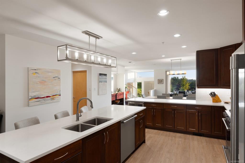 Experience the epitome of west coast living in this luxurious 3BD/4BA Sayward Hill townhome with breathtaking views of the ocean, Mt. Baker, and The Ridge Golf Course. With over 3,100 sf of beautifully updated space, it features new engineered hardwood, plush carpet, fresh designer paint, updated lighting on the main level, and a refreshed chef’s kitchen with quartz counters, custom backsplash, premium fixtures, stainless steel appliances, garburator, and sleek vent hood. Two sun-drenched patios blur the line between indoors & out. The spacious primary retreat offers panoramic vistas, a spa-inspired ensuite, & a custom walk-in closet. A versatile guest room or home office with built-ins, an updated main-level bath, & a lower-level family room or private guest suite provide flexible living. Double garage plus an additional secured parking stall. Steps to Mattick’s Farm, Lochside Trail, beaches, & golf. Peaceful, refined, and simply exceptional, this is Sayward Hill living at its finest!