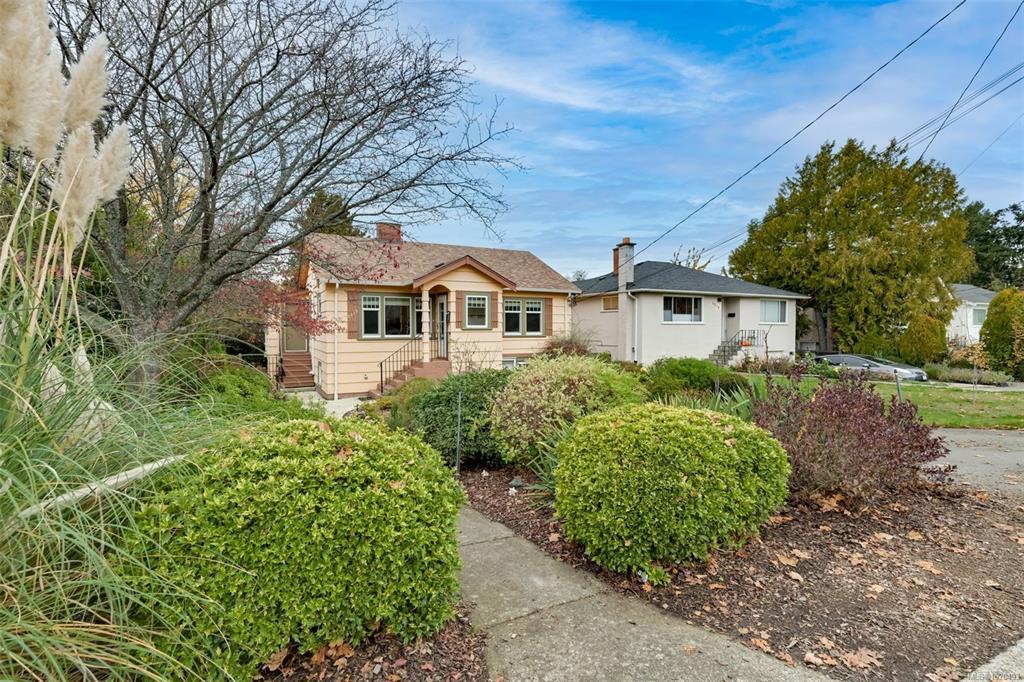 Lovingly maintained, this 1947 home blends vintage charm with modern updates. Offering just under 1,900 sq ft on a 5,550 sq ft lot in an incredible location. Updated frequently over the years, you'll love the ~4yr old roof, heat pumps (heating AND cooling) in ALL suites, 2 separate mortgage helpers, hardwood floors, updated kitchen (with island) & bathroom, updated windows and perimeter drains, and seamless main-level flow. Step onto the expansive WEST-FACING deck and enjoy fully irrigated gardens that burst into colour each Spring. The lower level includes ample storage and two SEPARATE suites—a 1-bedroom and a bachelor—ideal for income or family. Walk Score of 80, you’re steps from UVic, Hillside Mall, Mt Tolmie, and amenities. . The Official Community Plan designates this block for future redevelopment, making this a rare opportunity for lifestyle and long-term upside. Come see the possibilities!
