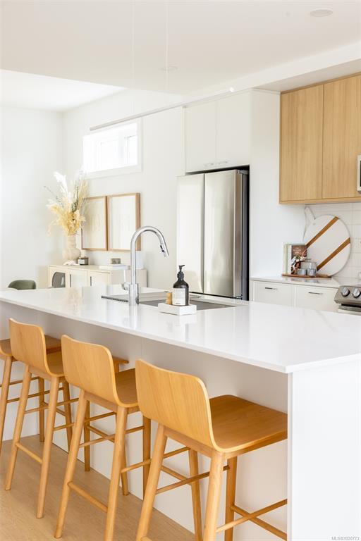 Move-in ready! Greyson is a brand-new community of naturally inspired family-sized townhomes by award-winning Abstract Developments. Located minutes from the amenity-rich Uptown Shopping District and the Galloping Goose trail, Greyson is perfectly positioned between the city’s outer limits and the downtown core for seamless connectivity within Victoria and beyond. This bright and spacious 4 Bed, 2.5 Bath home offers 1,545 sq ft of living space and an EV-ready, 2-car side-by-side garage. Interior features 9’ ceilings, generous windows and a welcoming main living area perfect for hosting friends and family. The beautiful kitchen features quartz countertops, a spacious island, shaker-style cabinets, a stainless-steel appliance package, a built-in full-height pantry and a desk. Enjoy two private outdoor spaces including patio space separated by lush landscaping and white picket fencing. Optional upgrade for AC available and a 10-year home warranty. Price + GST.