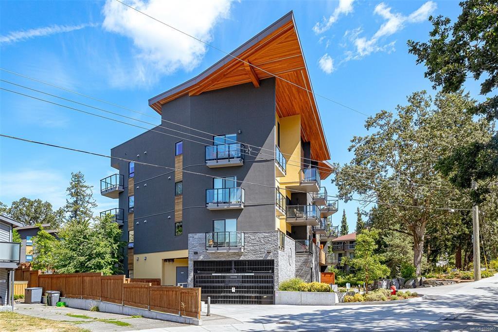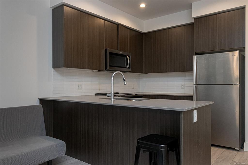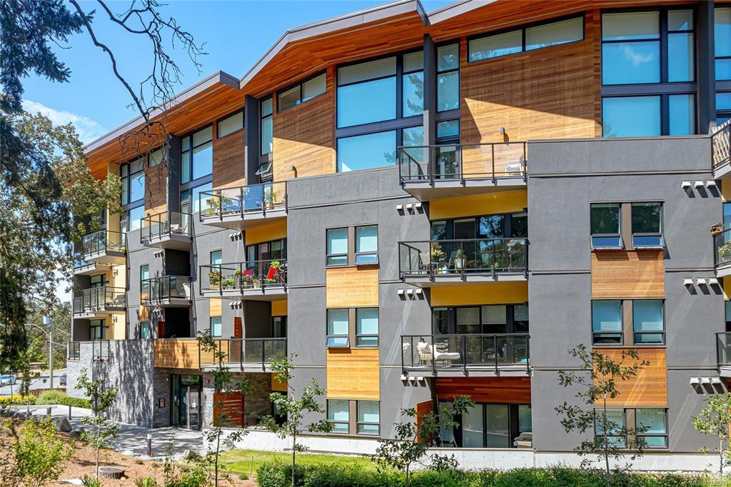 Priced to move in Today! This modern 1 BED+DEN home at OTTO—a Built Green Canada development, has shown sustainability in building materials and energy efficiency. Positioned on the quiet side of the building with peaceful treed views, this south-facing suite features an open-concept layout with 9-ft ceilings, a contemporary kitchen with SS appliances and quartz countertops, in-suite laundry, a high-efficiency heat pump for heating and cooling, a Spacious primary bedroom and a versatile den ideal for an office or storage. A rare BONUS-this unit includes a LARGE UG parking stall that is located in the parkade with additional space for a motorbike or appropriate storage, as well as a storage locker on the same level of the suite. Building perks: EV charging, courtyard, community garden, and bike storage. Short distance to UVic, Camosun, Saanich Centre, Swan Lake and everyday conveniences. Own it, Live it, and Love it!