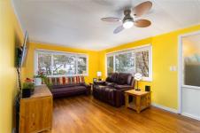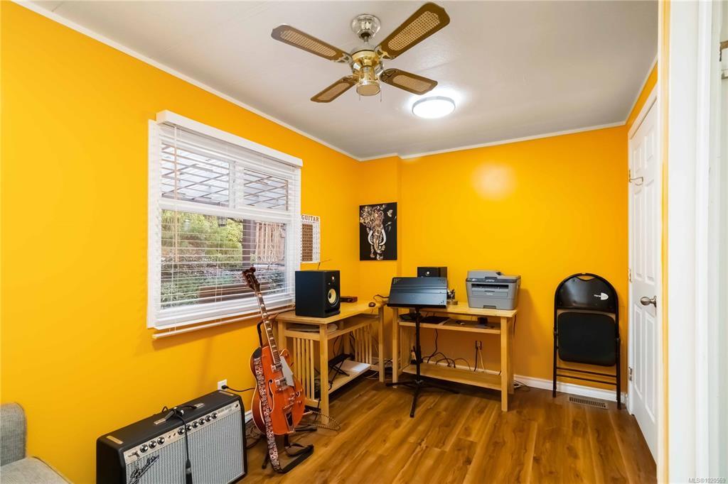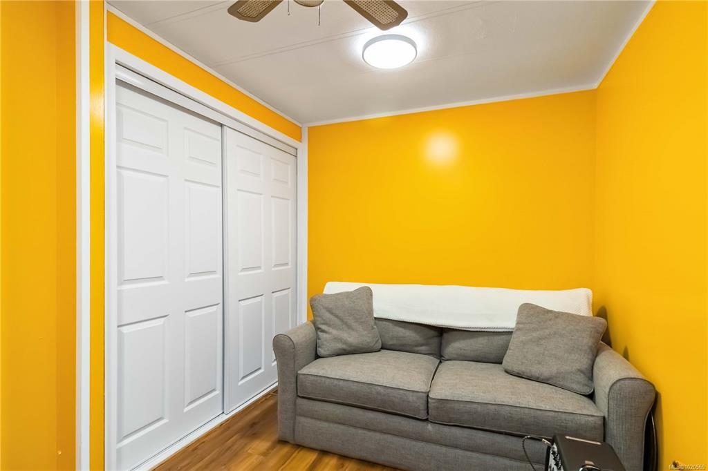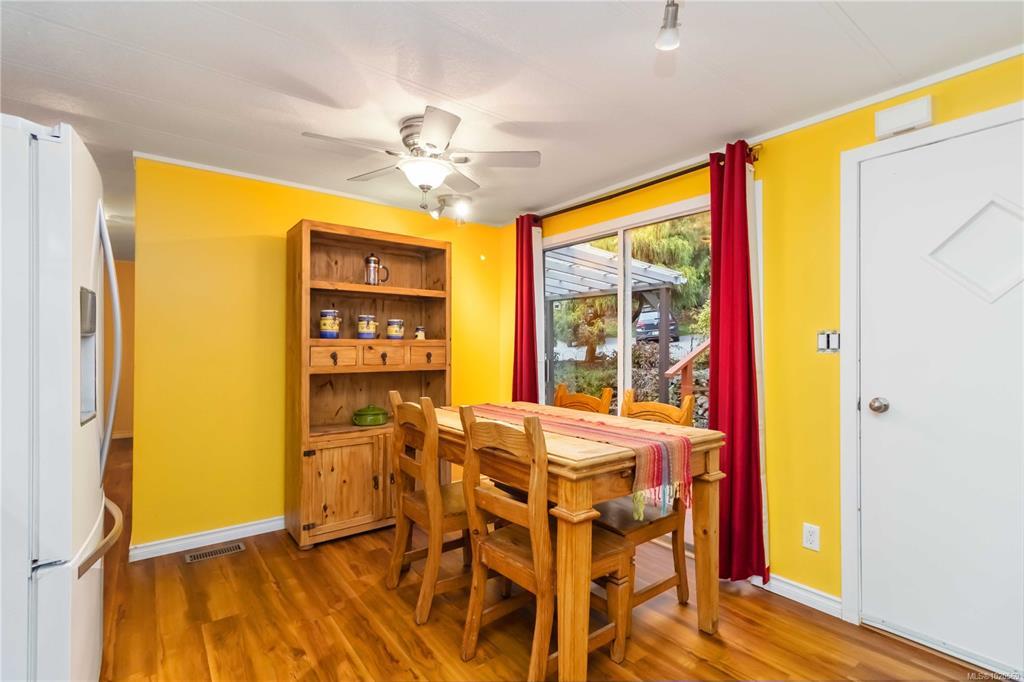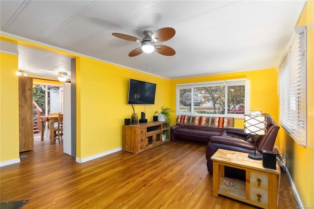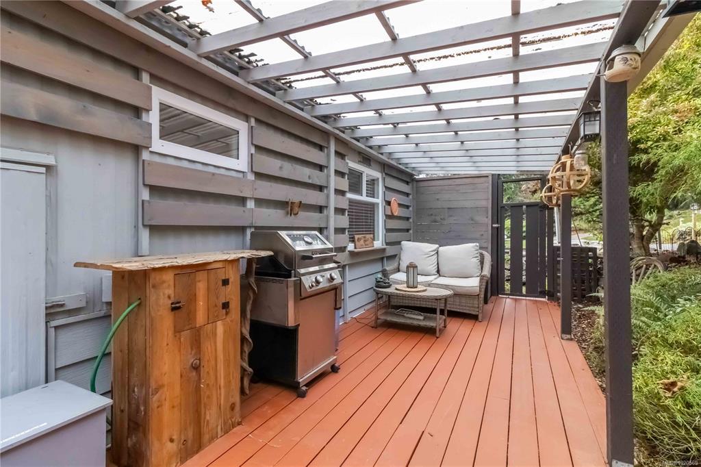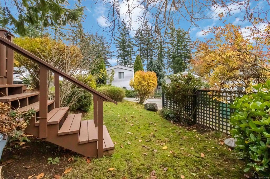 This welcoming and updated 2 bed+den, 2-bath doublewide sits on a spacious, private lot in desirable Lannon Creek Park. The home has been refreshed with new laminate flooring and vibrant paint colours that bring personality to every room. It has a new heat pump keeping things comfortable year round and a wood stove providing for cozy winter evenings. The kitchen offers plenty of storage, a skylight and a slider to a private covered patio perfect for morning coffee and summer BBQs. The large primary bedroom features a lovely ensuite with a walk-in shower and heated floor. Enjoy the beautiful views from the versatile den, office or studio with its adjoining 2nd deck. Outside you will find mature landscaping, flowering trees and even space for veggie beds. A powered workshop offers great storage or hobby space. Parking is generous and the onsite compound provides storage for your RV or boat. All of this is set in a friendly adult community just steps from the Galloping Goose Trail.