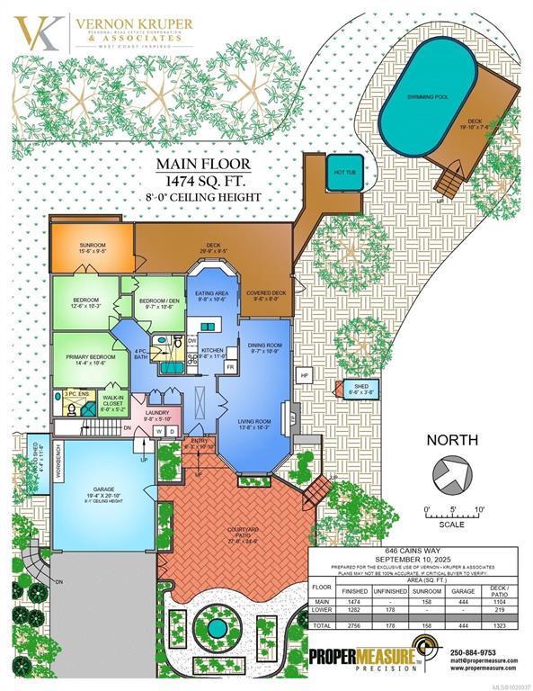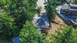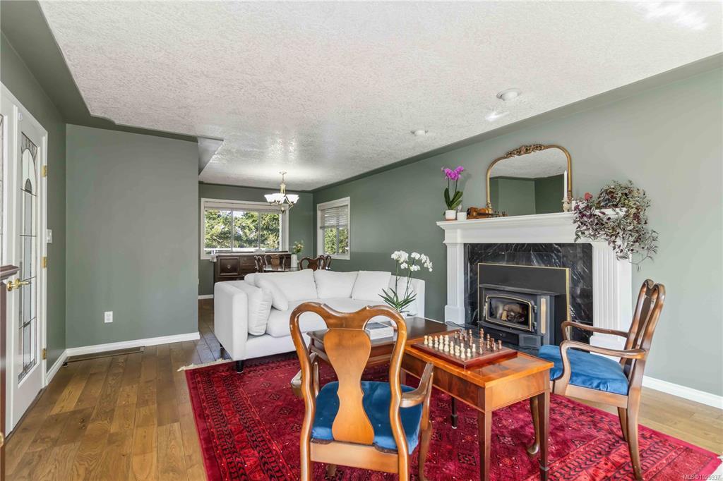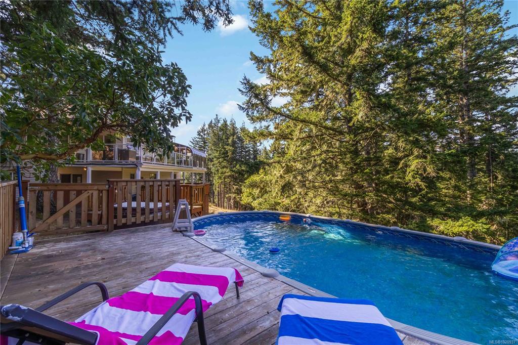 A true West Coast retreat! Set atop Mount Matheson, this private 1.26-acre property offers nearly 3,000 sq.ft. of well-designed living with main-level convenience and a versatile walk-out lower floor. The welcoming courtyard entry w/ gardens+fountain leads to bright, updated, open spaces filled with character. The living room is anchored by a wood stove and flows naturally to dining and a refreshed kitchen with quartz counters and breakfast nook, opening to a generous deck with sweeping views of nature. The main-level primary suite includes walk-in closet and ensuite, while a sunroom adds a peaceful flex space. Downstairs, a spacious family/media room with gas fireplace and bar creates the perfect gathering zone, with direct access to the pool and hot tub oasis- so perfect for entertaining! Ideal for families or guests with 5 bedrooms + office/den, plus ample parking and a double garage. This is East Sooke living at its best—quiet, scenic, and endlessly inviting.