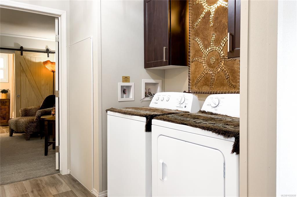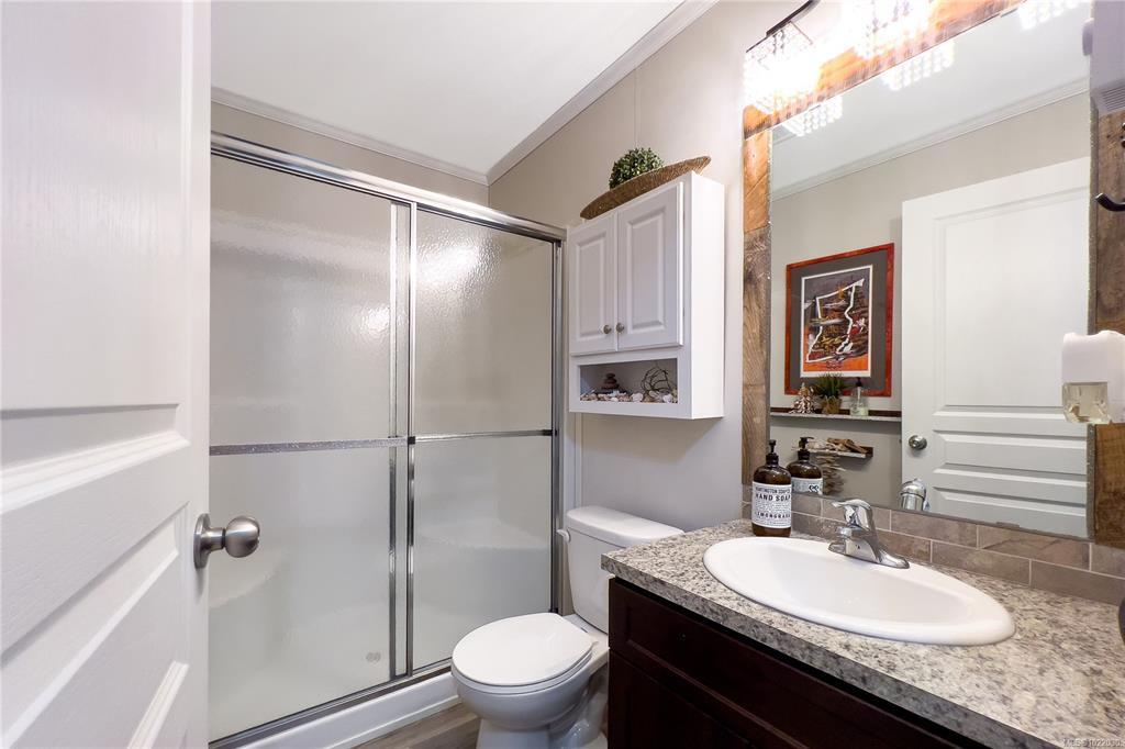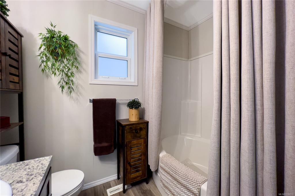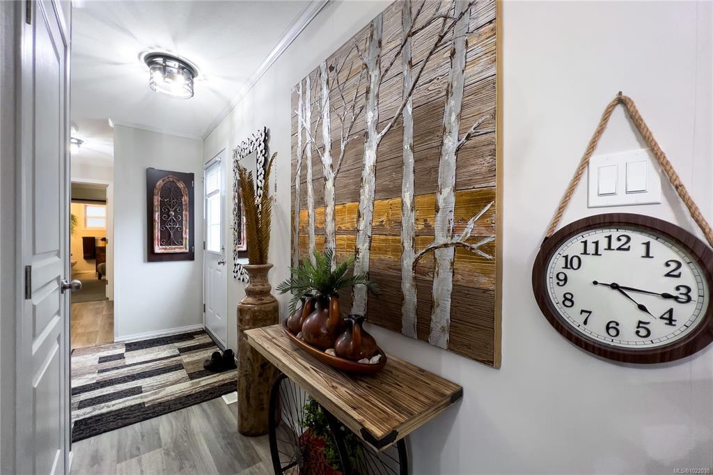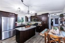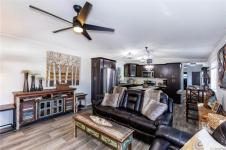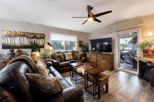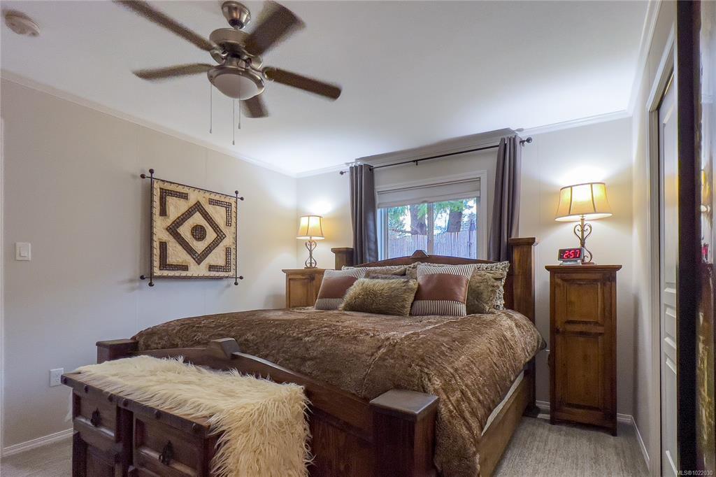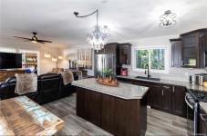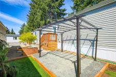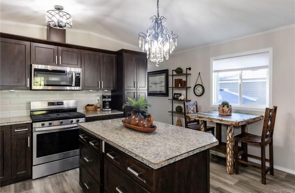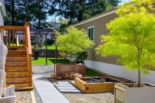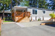 Truly exceptional 2 bedroom, 2 bathroom manufactured home in Prado Verde Park. Built in 2018 by Triple M Housing, designed with contemporary finishes and an open concept floorplan with vaulted ceilings in the great room. Beautiful kitchen with stainless appliances, gas stove and eat up center island, with sliding glass doors to the private covered, mountain view deck. The king-sized, primary bedroom features a walk-in closet and full ensuite and soaker tub. Main bath has a 5ft walk-in shower and 2nd bedroom. Set in the back corner of the park with mature trees, gorgeous oasis landscaping with entertainment spaces, new gazebo and a privacy fence, plus a mountain view! Large backyard, easy care perimeter gardens and a garden shed will satisfy a green thumb. 2 parking spaces and RV parking in the park FCFS. Bring your 1 small pet (15 inches at the shoulder) and children to this well-maintained park in an ideal location close to schools, shopping & trails.