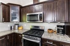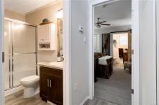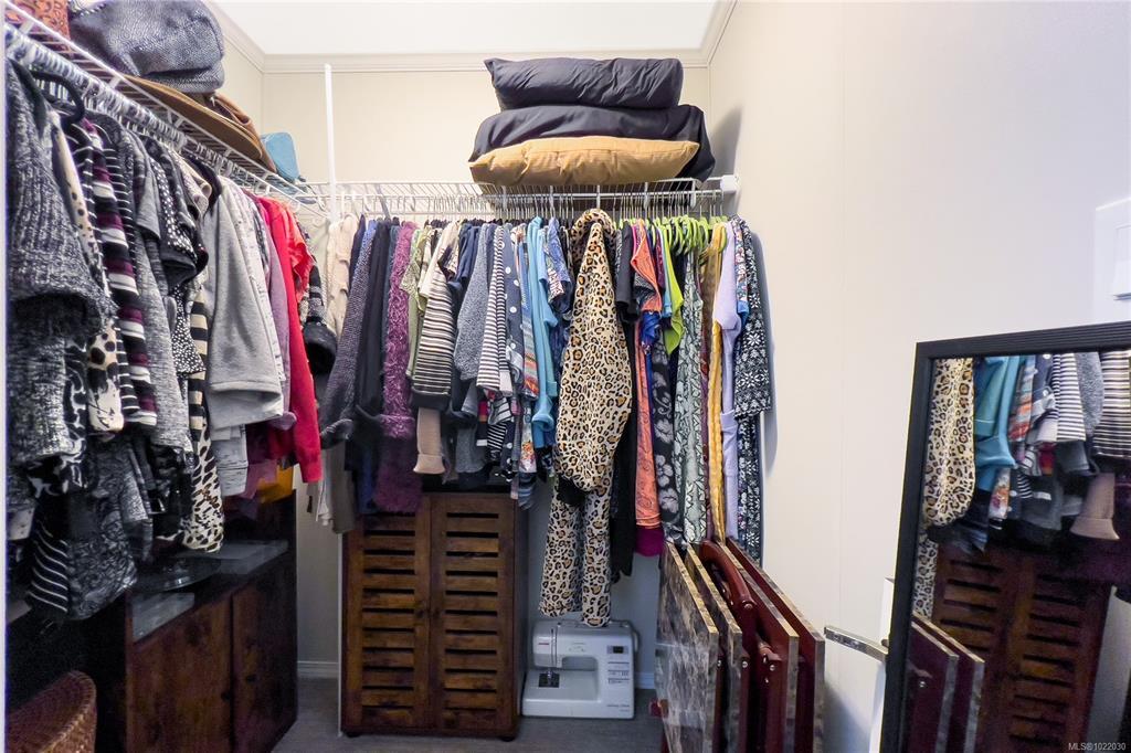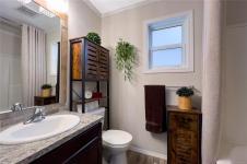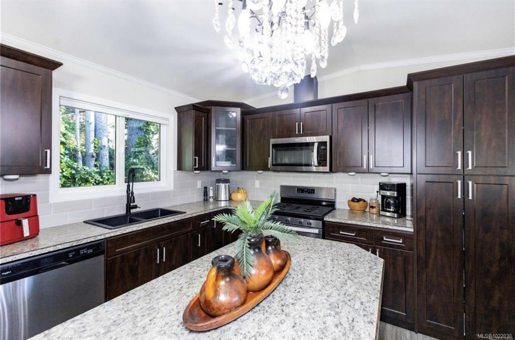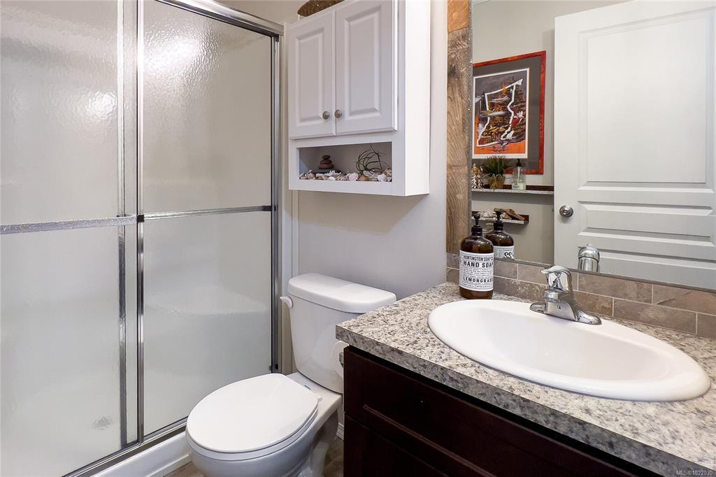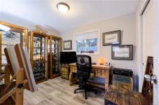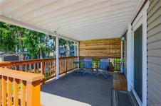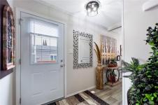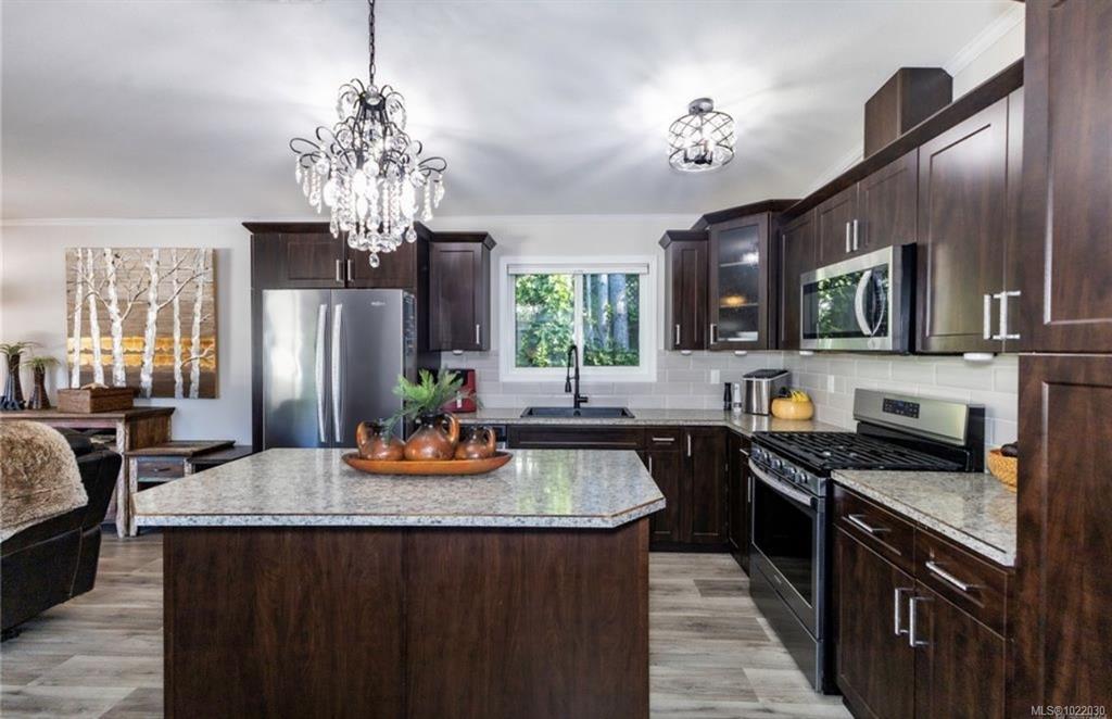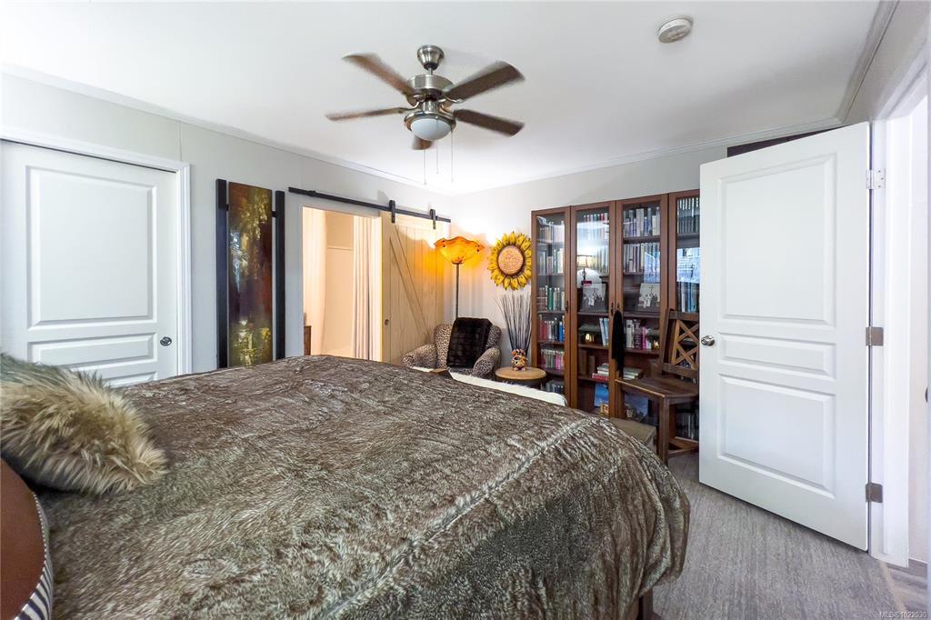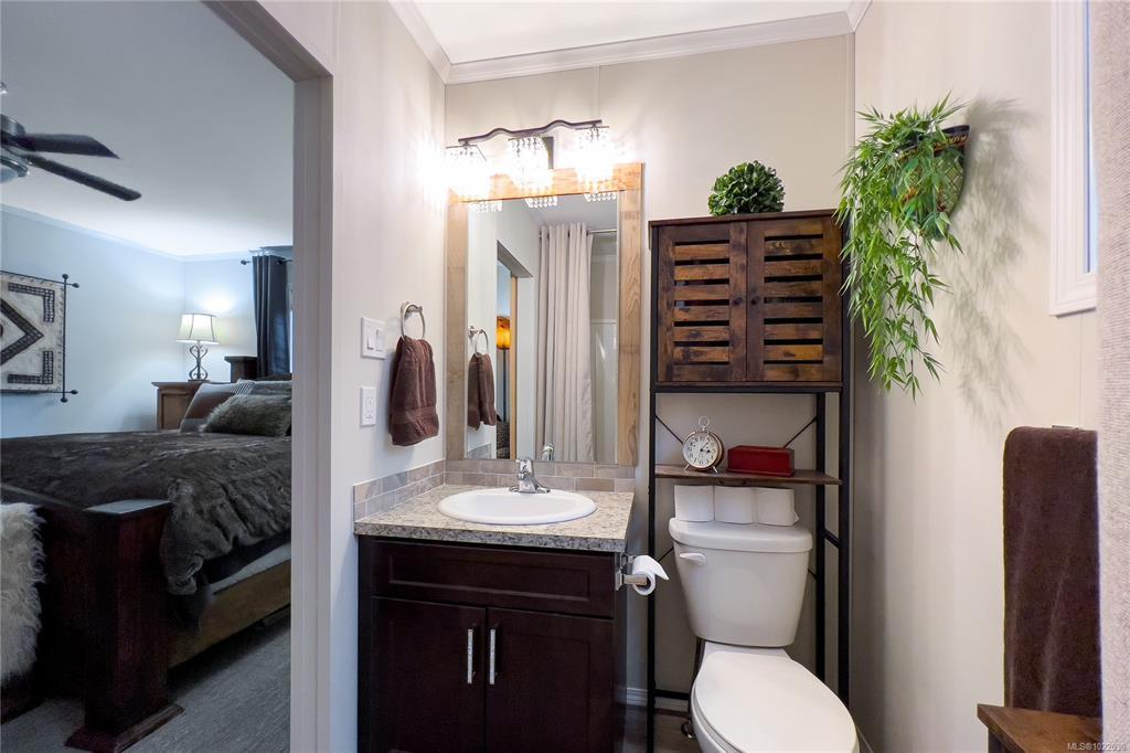 Truly exceptional 2 bedroom, 2 bathroom manufactured home in Prado Verde Park. Built in 2018 by Triple M Housing, designed with contemporary finishes and an open concept floorplan with vaulted ceilings in the great room. Beautiful kitchen with stainless appliances, gas stove and eat up center island, with sliding glass doors to the private covered, mountain view deck. The king-sized, primary bedroom features a walk-in closet and full ensuite and soaker tub. Main bath has a 5ft walk-in shower and 2nd bedroom. Set in the back corner of the park with mature trees, gorgeous oasis landscaping with entertainment spaces, new gazebo and a privacy fence, plus a mountain view! Large backyard, easy care perimeter gardens and a garden shed will satisfy a green thumb. 2 parking spaces and RV parking in the park FCFS. Bring your 1 small pet (15 inches at the shoulder) and children to this well-maintained park in an ideal location close to schools, shopping & trails.