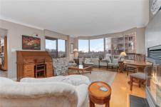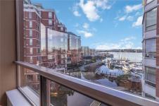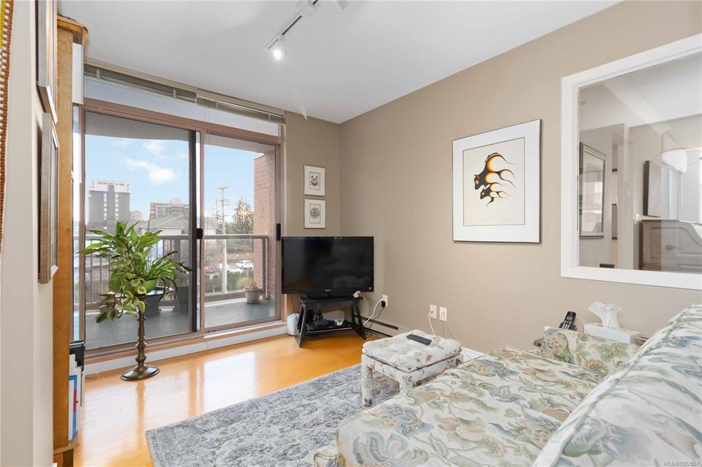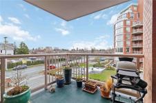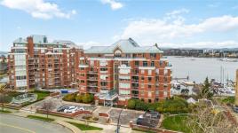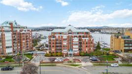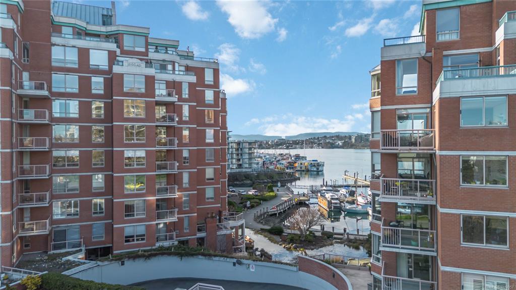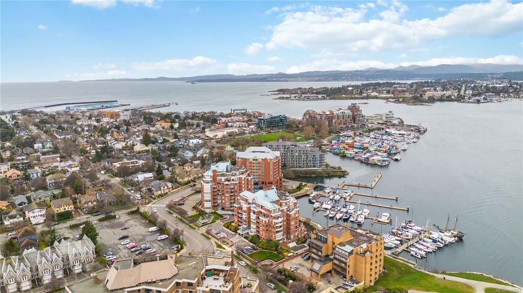 Enjoy gorgeous OCEAN views from this ideally located, spacious 2 BED & Den condo in Victoria's Harbourside. Perfectly positioned to witness spectacular sunsets & enjoy the action of the Inner Harbour, while appreciating the serenity & comfort this luxury building provides. Turn key, one level living with gleaming wood floors, a newer kitchen with quartz counters & maple cabinetry & updated bathrooms. The thoughtful floor plan includes a large dining area built to accommodate gatherings of any size, excellent separation between the primary bed & living area, a deck accessed from the kitchen & living area, separate laundry & lovely little touches throughout including; a seated vanity table in the ensuite, ample closet space & heated floors in the powder room. Underground parking & well appointed lobby & just a short stroll to all that makes the Garden City so desirable; Fisherman's Wharf, Ogden Point, The Empress and a plethora of shops & services.