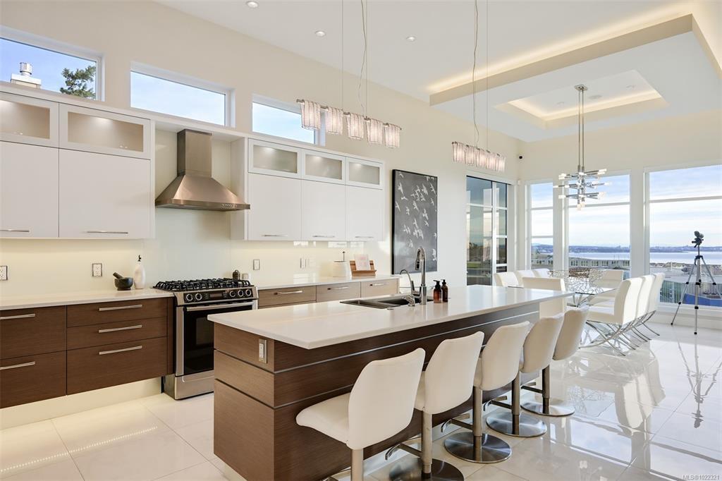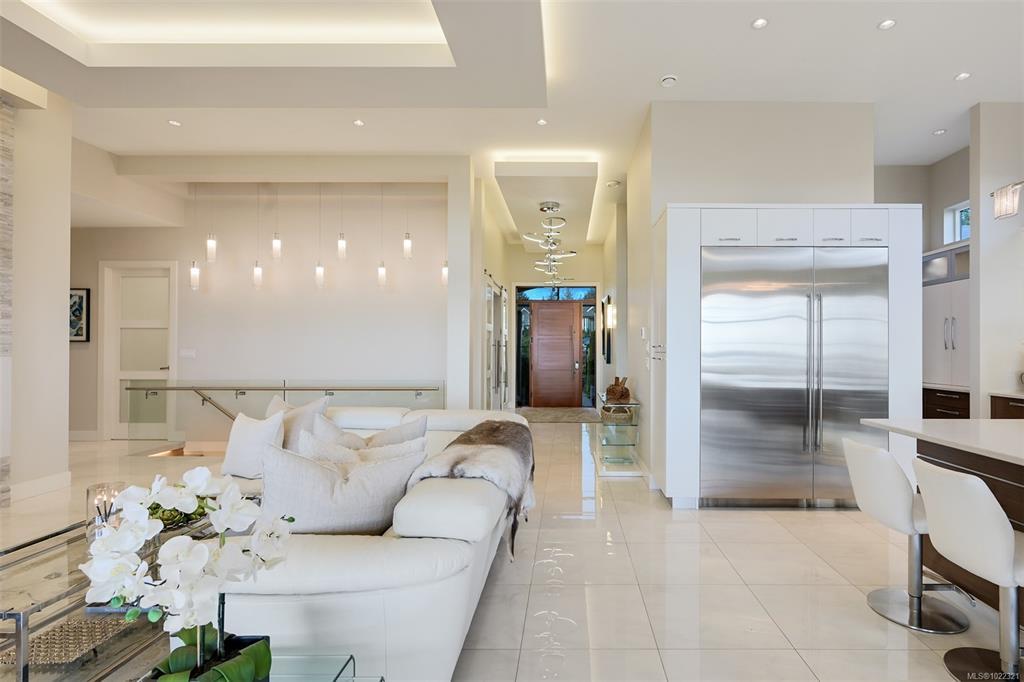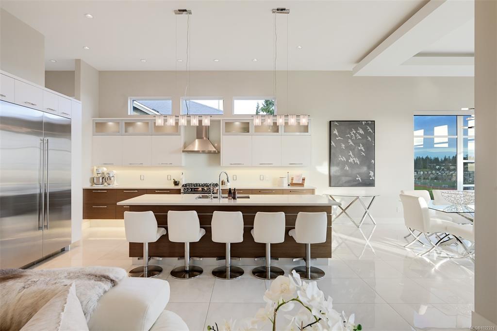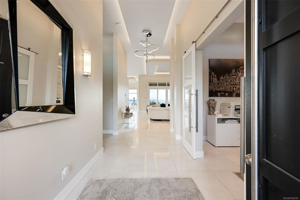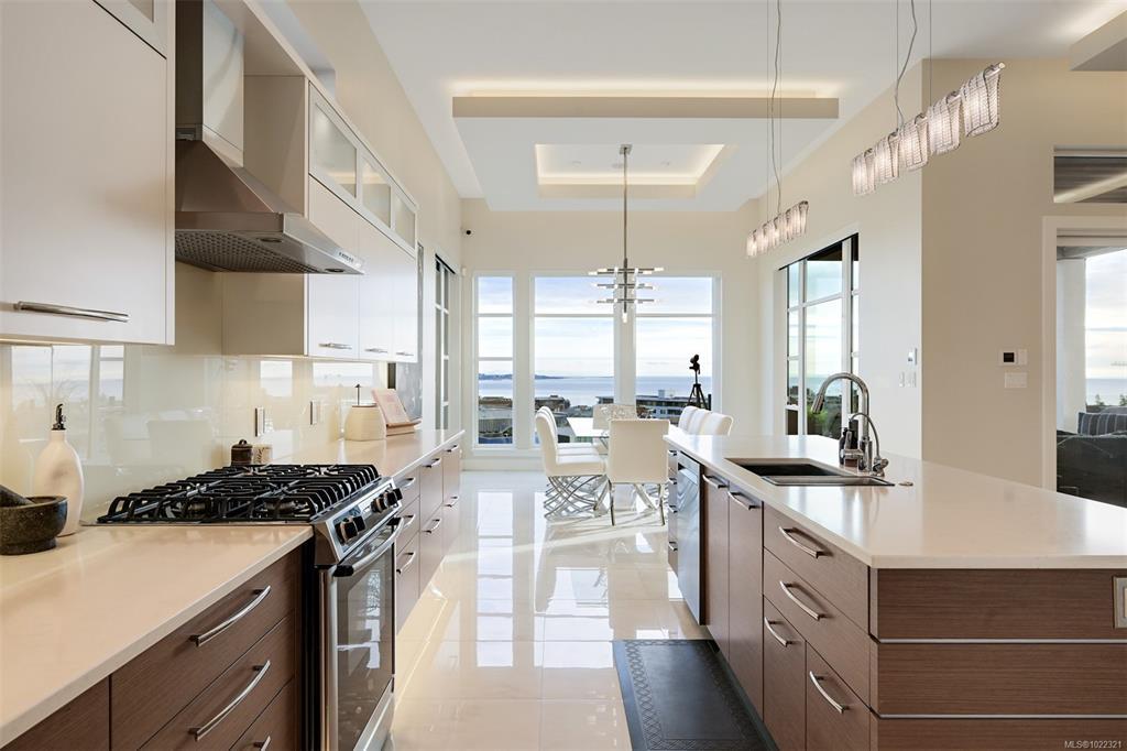 Framed by endless ocean and skyline views, this architecturally refined West Coast residence in Royal Bay offers a rare balance of serenity and sophistication. Mornings begin with radiant sunrise light spilling across marble floors with in-floor heating, while the chef’s kitchen, complete with Sub-Zero refrigeration and a generous pantry, anchors the heart of the home. Expansive living spaces flow to a covered terrace with a gas fireplace and heater, creating a year-round vantage point to watch cruise ships drift across the horizon. The master bedroom evokes a private spa retreat with steam shower and walk-in dressing area, complemented by flexible office and lounge spaces throughout the home. A beautifully designed 1-bedroom suite offers discreet accommodation for extended family or guests. Finished with lush landscaping, built-in sound, security, a double garage, and a standing-seam metal roof, this is coastal living expressed at its most refined.