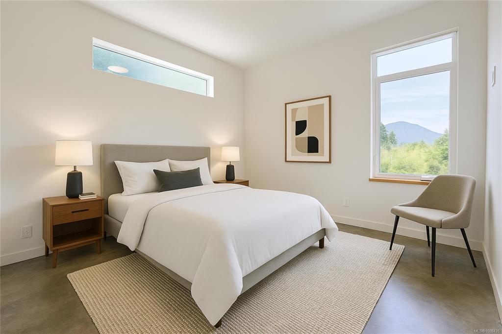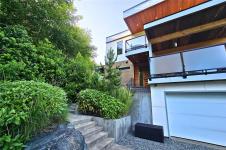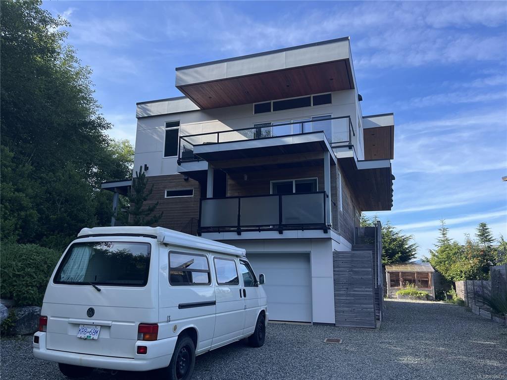 Modern contemporary design meets functionality in this stunning Tofino home. Perched on a hill, out of the tsunami zone, at the end of a quiet road & walking distance to downtown. South-facing front overlooks parkland; rear offers ocean & mountain views. Built in 2017, this 2,990 sq ft home features a 3-bed, 3-bath main residence, a 1-bed, 1-bath suite, & a garage w/access to bonus rooms. Street level garage, 2 bonus rooms & half bath. Second floor has main entry, laundry, half bath & primary bed w/ensuite & private balcony. Suite also on this level w/in-unit laundry & its own sunny deck. Top floor has 2 more beds, full bath & open-concept living area w/10-ft exposed wood ceilings, large windows & dual balconies offering exceptional views up Lemmens Inlet. Radiant-heated polished concrete floors, concrete countertops & sleek finishes throughout. Exterior features surf shower, ample parking, garden beds, greenhouse & extensive landscaping. Zoned for home occupations & short-term rentals