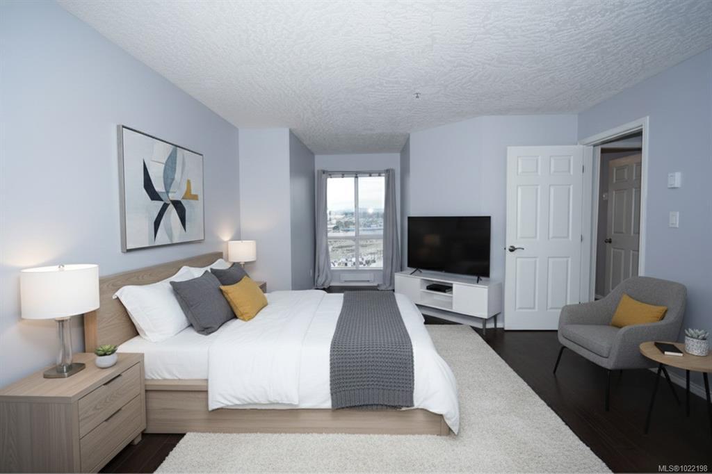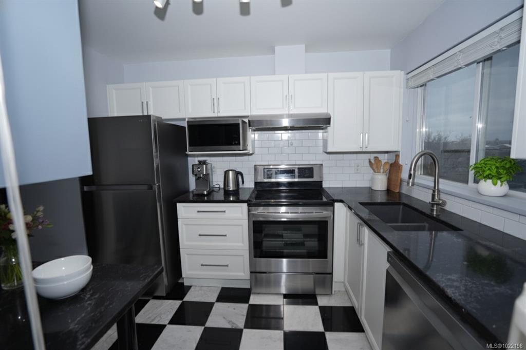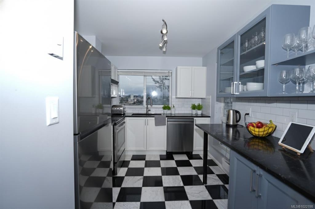 OPEN HOUSE SAT JAN 10TH 2-3pm! Enjoy bright, top-floor living with sweeping west-facing views in this beautifully updated home. Dramatic 15-foot vaulted ceilings, a skylight, and expansive windows fill the space with natural light, while engineered hardwood floors and a cozy gas fireplace create a warm, modern feel. The recently renovated kitchen features stone countertops, new appliances, and a tiled eat-in area that flows seamlessly into the formal dining space. Two generous bedrooms include a spacious primary with walk-in closet, updated ensuite, bonus office nook, and access to a covered deck, perfect for taking in the sunset views. Set in a well-managed building with a resident caretaker, secure underground parking, bike storage, and separate storage. Pet- and family-friendly, and ideally located within walking distance to downtown, Mayfair Mall, and Vic West. This move-in-ready home checks all the boxes.