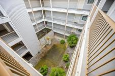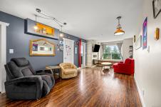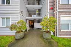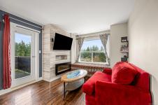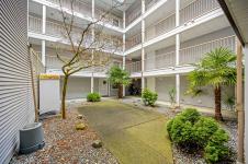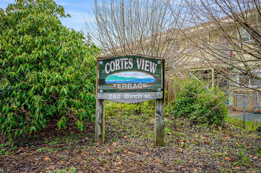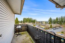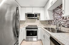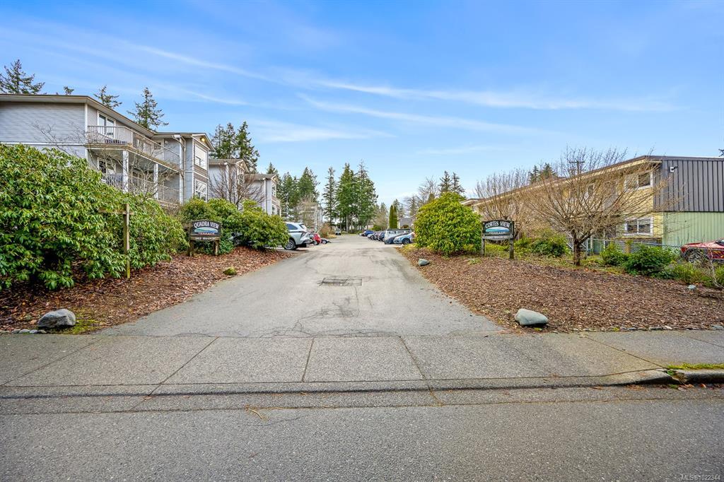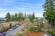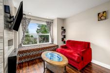 Top-floor, updated northeast corner condo with ocean and mountain views. This spacious 2-bedroom plus den home features a custom built-in electric fireplace with tiled feature wall, central vacuum system, a vanity sink within the walk-in closet, and new Washer & Dryer installed in 2025. The separate den provides ideal space for a home office or additional storage. The unit has updated flooring and trim along with lighting and plumbing fixtures. The kitchen has updated cabinetry, countertops, and appliances, and the bathroom features a modern redesign with a tiled shower. Updated interior doors and hardware complete the contemporary feel. Enjoy ocean views from the living room window seat and the private top-floor patio. The building offers elevator access, condo units also have fire sprinkler system, allows rentals, and permits one pet. Ideally located just one block from the hospital, close to shopping, schools and from downtown.