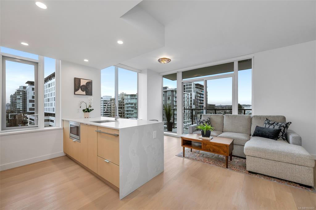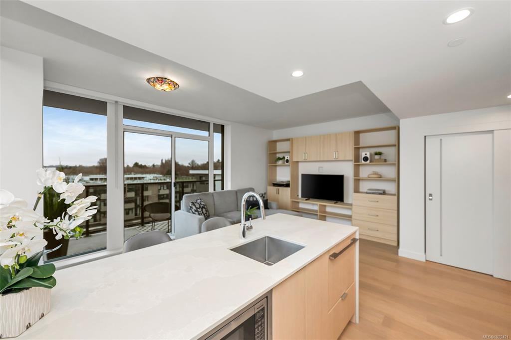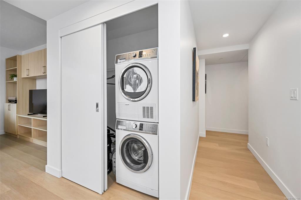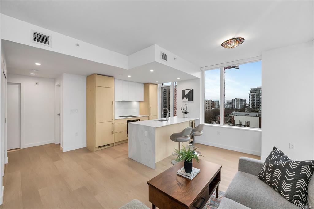 Listed below the recent BC Assessed value! Newly-built in 2024 - 675 sq ft condo - including 95 Sq Ft balcony on the 7th Floor of the Nest by Chard. Fully air conditioned 1 bed 1 bath luxury corner unit with a huge North-facing balcony. Inside, find a handy wine fridge and an amazing layout - open concept living space & floor to ceiling windows. Enjoy watching sunsets out of windows to the West. The “U” shaped kitchen has quartz counter tops/backsplash, Fisher & Paykel appliances including a panel ready refrigerator, w/separate freezer, dishwasher, induction stove stop, built-in oven, built-in microwave and ample drawer/cabinet storage. Additional $10K of upgrades including built-in closets and wall unit in the living room. There is full-sized separate storage locker (#60), underground parking (owners renting stall #61), secure bike storage - private pedestal (#57), workout gym, dog wash, MODO. Enjoy the convenience of living in Downtown Victoria and all the amenities it has to offer!