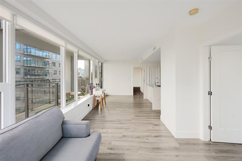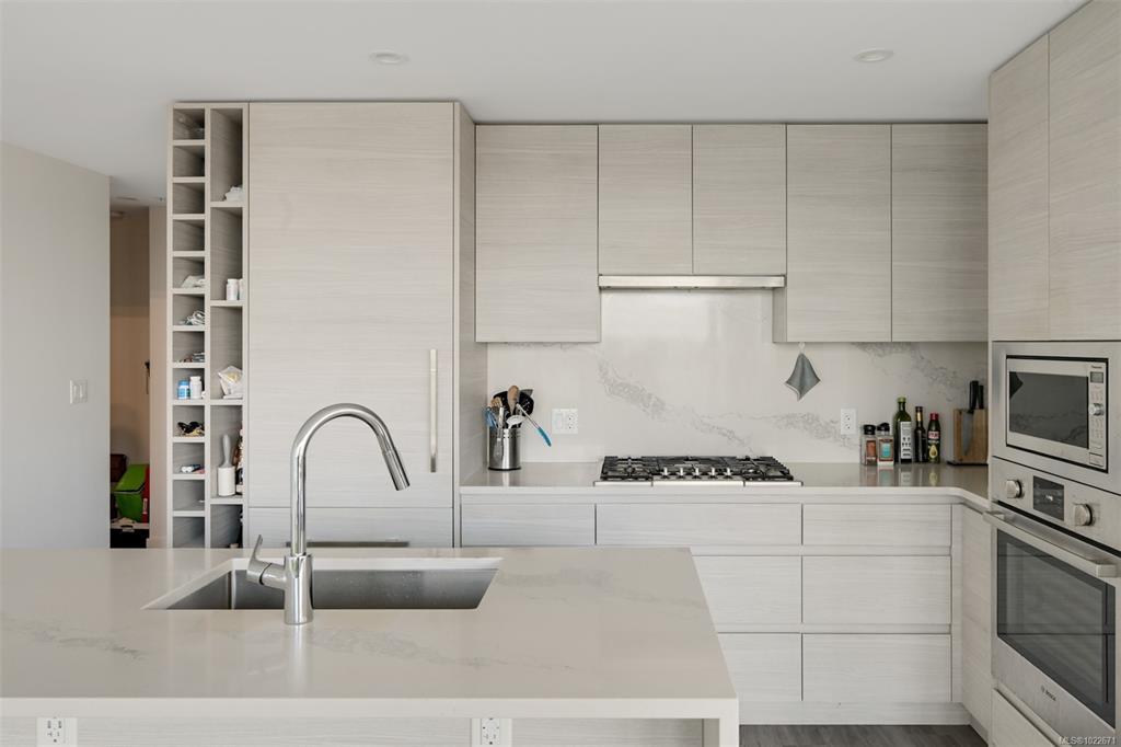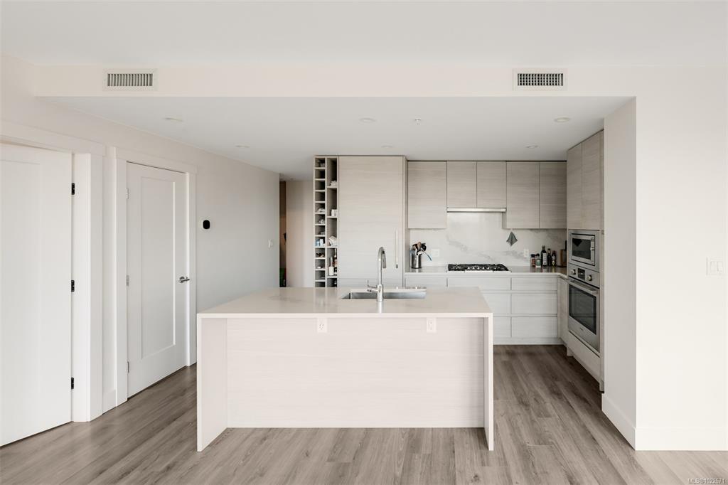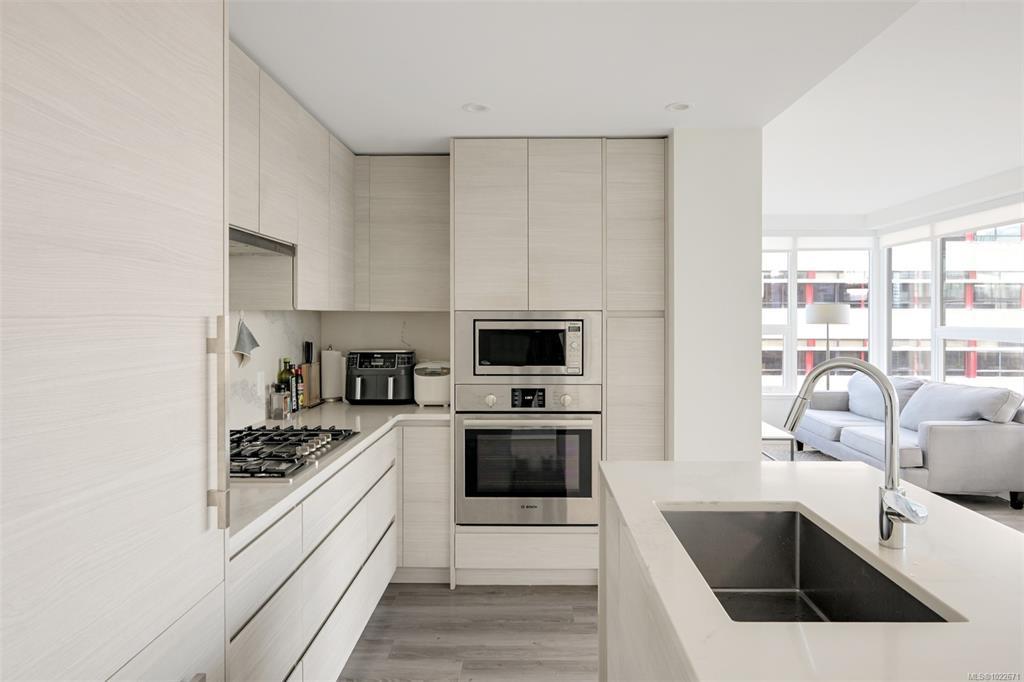 Welcome to the Hudson Place One, the centrepiece of Downtown Victoria's Skyline. Built by award winning developer Townline, this steel and concrete tower is known for its unparalleled amenities and walkability to everything Downtown has to offer. This 2 bed, 2 bath suite has high end finishings including an upscale kitchen fitted with quartz countertops, ample storage and designer Bosch appliances w/gas range. Light flooring extends into the sun filled living room with westerly ocean and city views, and dining area with access to the 24x7 deck. The primary bedroom is generous in size, and includes a luxurious ensuite with heated floors. On the opposite of the suite is the private 2nd bedroom and 4 piece bathroom. To cap it off, in-suite laundry means this home has everything you need. With amenities like concierge, gym and sauna, yoga room, lounge, billiards room, dog run, guest suite and more, Hudson Place One provides something for everybody. Upgraded EV Parking and storage included!