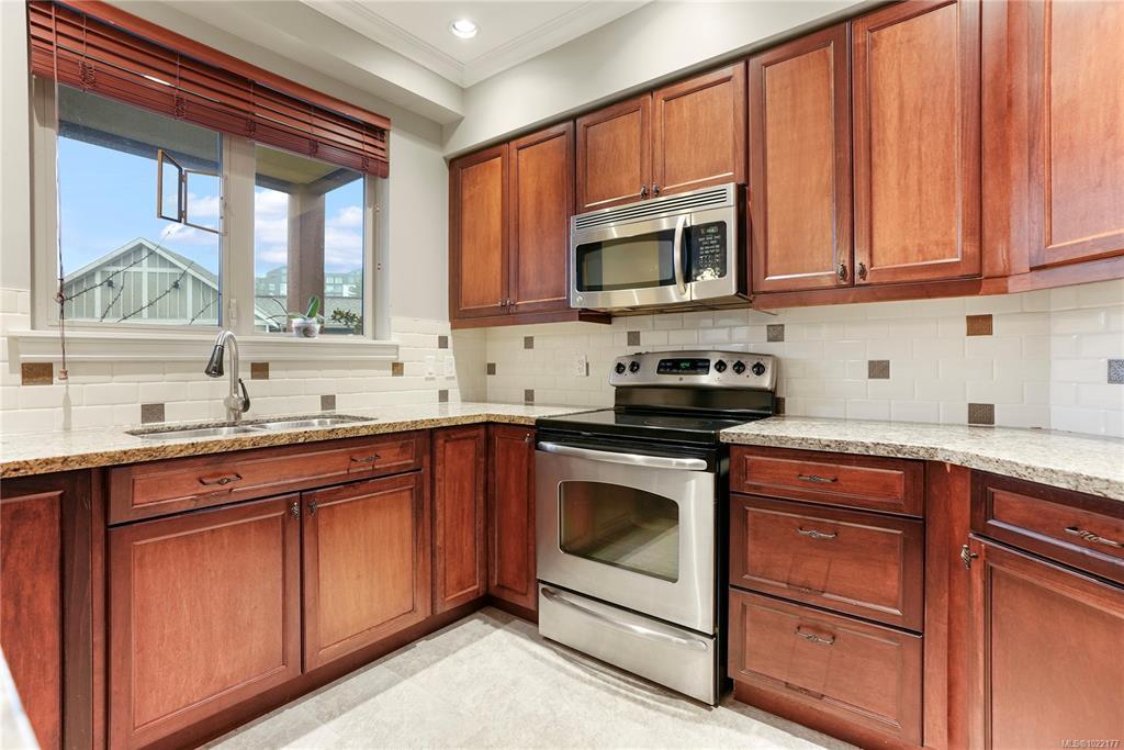 AMAZING 2 bed+DEN /2 bath SPACIOUS CORNER UNIT! "The Metro" in vibrant Goldstream Village that's walkable to stores, schools, restaurants, coffee shops, library, John Horgan Campus, RRU university & much more! Over 1240 ft of thoughtfully designed space, highlighted by an oversized living area w/cozy electric FP, & windows SW facing. Features include quality finishing throughout, 9-ft ceilings, crown molding, wood floors, stone countertops, a large dining area & laundry/storage.The primary ensuite offers a luxurious soaker tub, dual vanity & tile flrs. BONUS A heat pump has been added to keep you warm & cool! This home includes one secure underground parking spot w/ 1 storage locker directly behind it, + additional separate storage locker.Hot water is included in the monthly strata fee. Pet-friendly, see bylaws. Well cared for by the current long term owners. Close to shops, dining, and more, this condo combines comfort and convenience in a prime location!