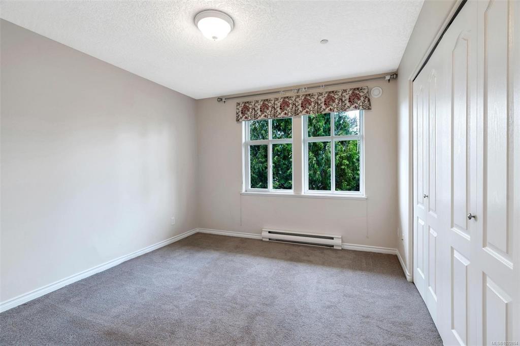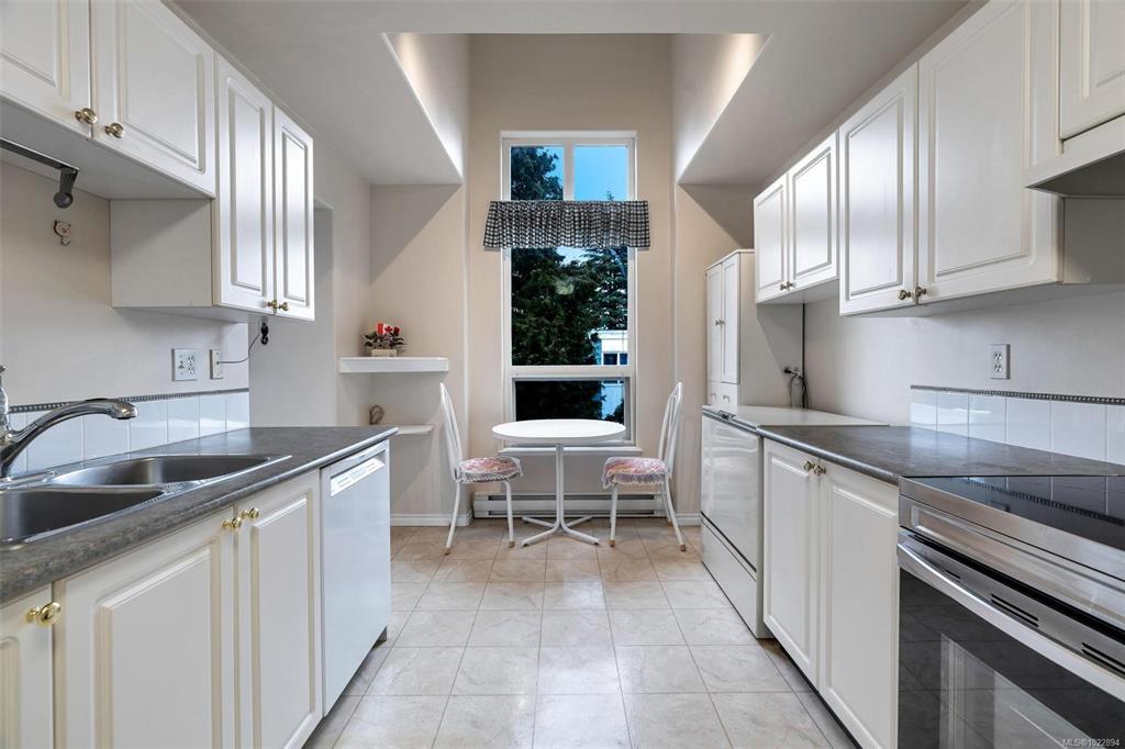Rare top-floor corner unit in a quiet 21-unit boutique building, offering exceptional privacy and natural light. This spacious 2bed &2bath home features 1,181sq.ft of open living space with a dramatic 12-ft vaulted ceiling. Excellent bedroom separation, a bright kitchen with eating nook, and a wrap-around balcony ideal for BBQs.Prime walkable location steps to UVic, Tuscany Village, University Heights shopping, transit, dining, and everyday amenities. Well maintained and move-in ready with a brand-new hot water tank, in-suite laundry, ample storage, secure underground parking, visitor parking, and an oversized heated storage locker. Gas fireplace heat included in strata fees. The building has recently completed a full roof replacement. A standout suite thanks to its size, layout, and top-floor corner position—private, quiet, and exceptionally well cared for.