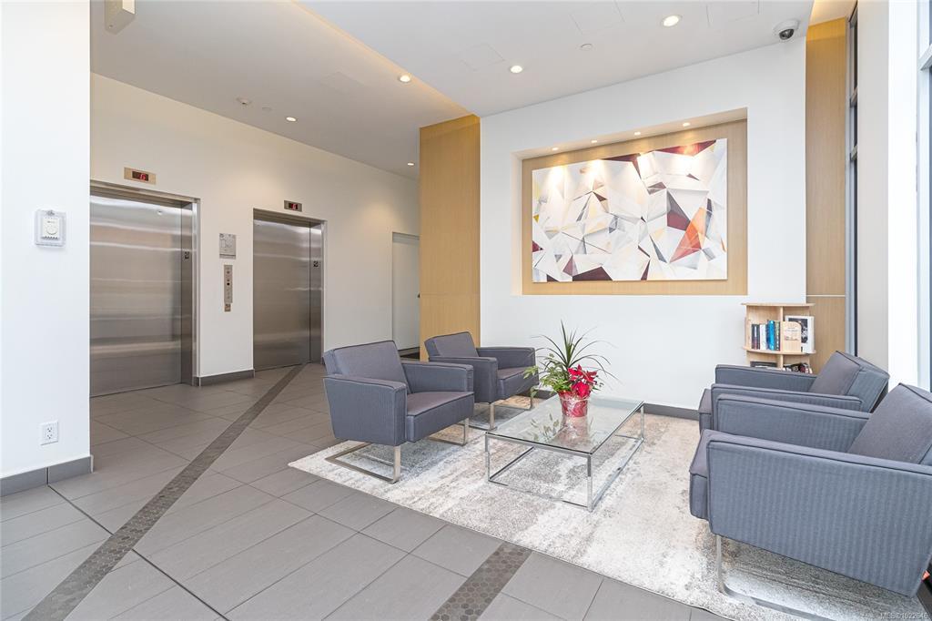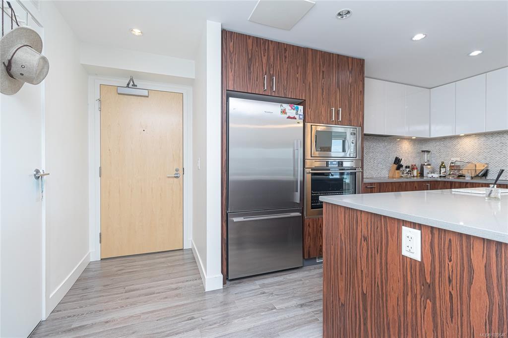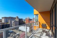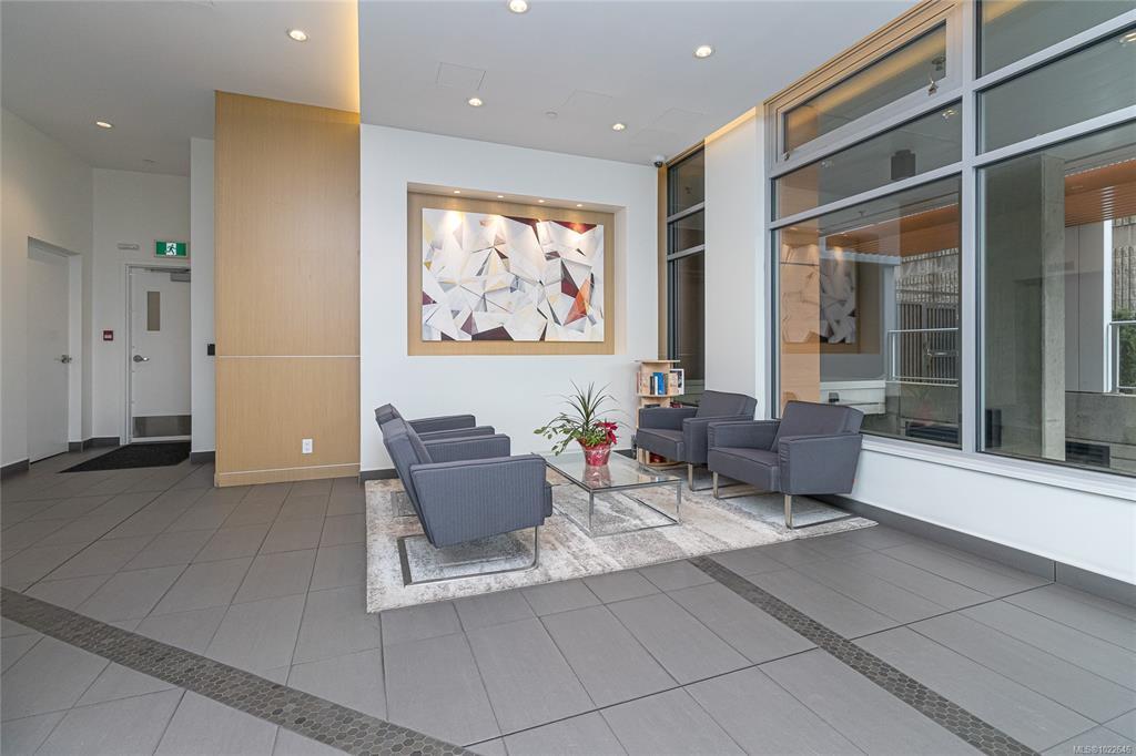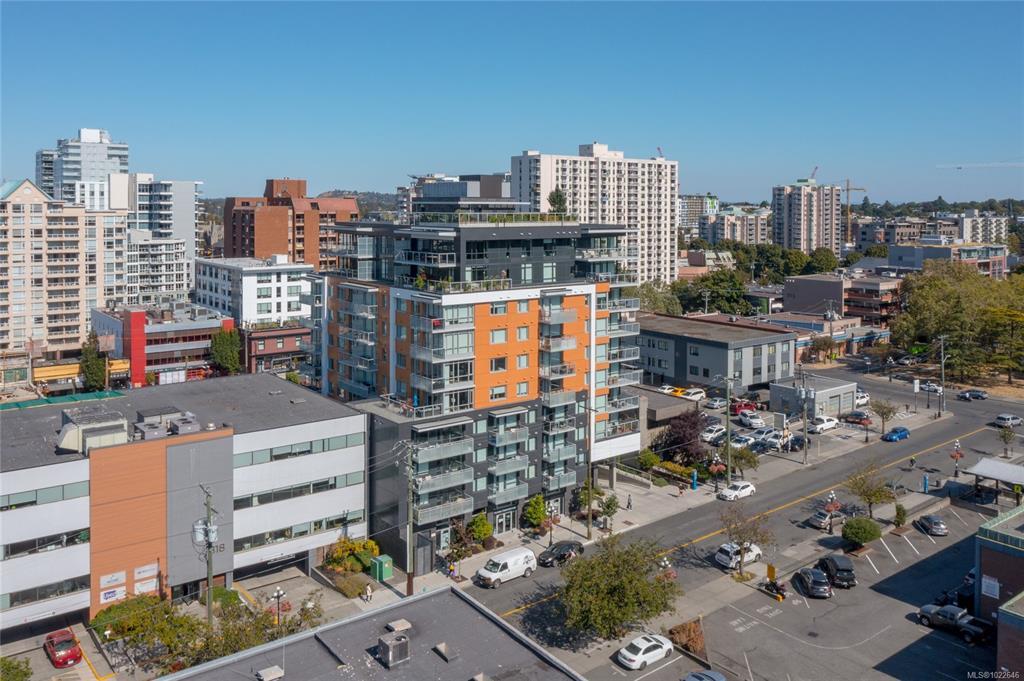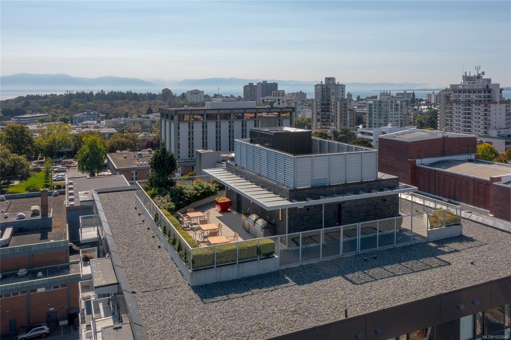 Experience refined urban living at Escher in this stunning corner residence offering over 1,000 sq. ft. of thoughtfully designed space. The bright two-bedroom, two-bathroom layout is enhanced by floor-to-ceiling windows and a desirable southeast exposure, bathing the home in natural light. The gourmet kitchen features premium appliances and sleek, modern finishes, while the primary suite is a true retreat with a spa-inspired ensuite complete with a soaker tub and glass-enclosed shower. Additional features include gleaming floors, ample in-suite storage, a built-in tech workspace, in-suite laundry, and a generous wraparound balcony perfect for entertaining. Tucked away in a quiet downtown enclave yet moments from Cook Street Village, shops, cafés, groceries, and the waterfront. Secure underground parking, storage locker and an exceptional rooftop terrace with lounge, kitchen, BBQ, and sweeping panoramic views complete this impressive offering.