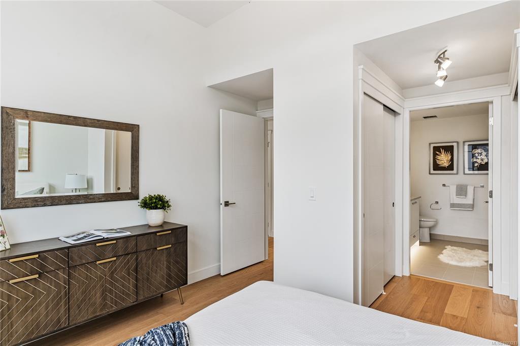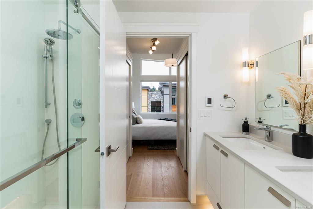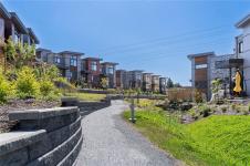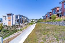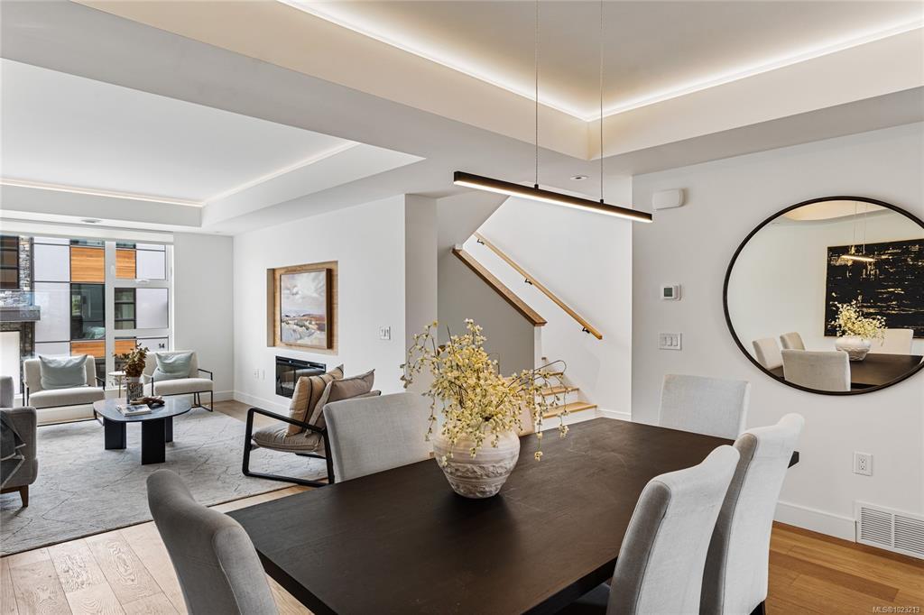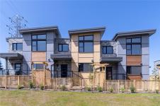 JUST LISTED! Luxury 3-bed, 4-bath, 2000+ sq ft townhome in a quiet enclave surrounded by mature homes & friendly neighbourhood. Contemporary features including soaring rooflines, stone/wood accents, transom windows + LR, DR, media room & office nook. Main level: 9' coffered ceilings, floor-to-ceiling windows, engineered hardwood floors, fireplace, gourmet kitchen w/ quartz counters, wall oven, gas cooktop, XL island, SS appliances, open-concept dining, & powder rm. Upstairs: vaulted 13' ceilings, luxe primary w/ walk-through closet & spa-like ensuite, 2 more beds, full bath & laundry. Lower: 8' ceilings, media/rec room, additionation storage, utility closet & EV-ready garage. Extras: remote blinds, HW on demand, heat pump, organizers & quality fixtures. Fenced yard backing green space w/ water feature, shared garden bed plots & community park. Built by award-winning White Wolf Homes with full New Home Warranty. Mins to shops, trails & downtown Victoria.