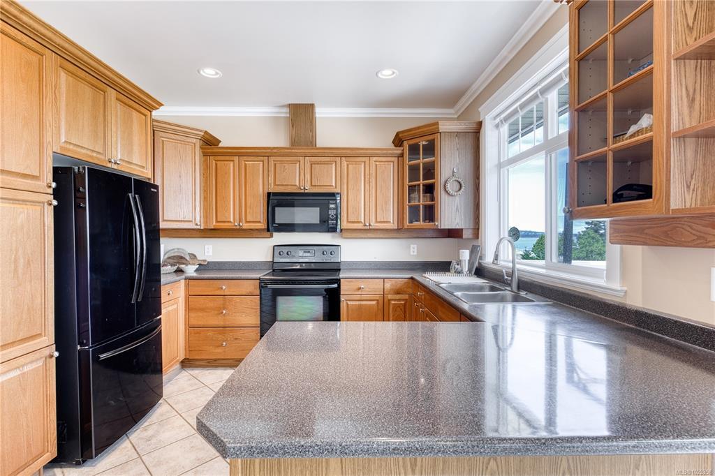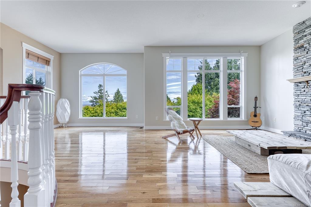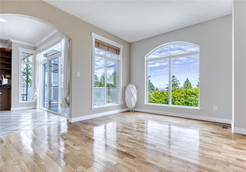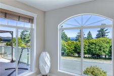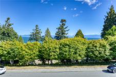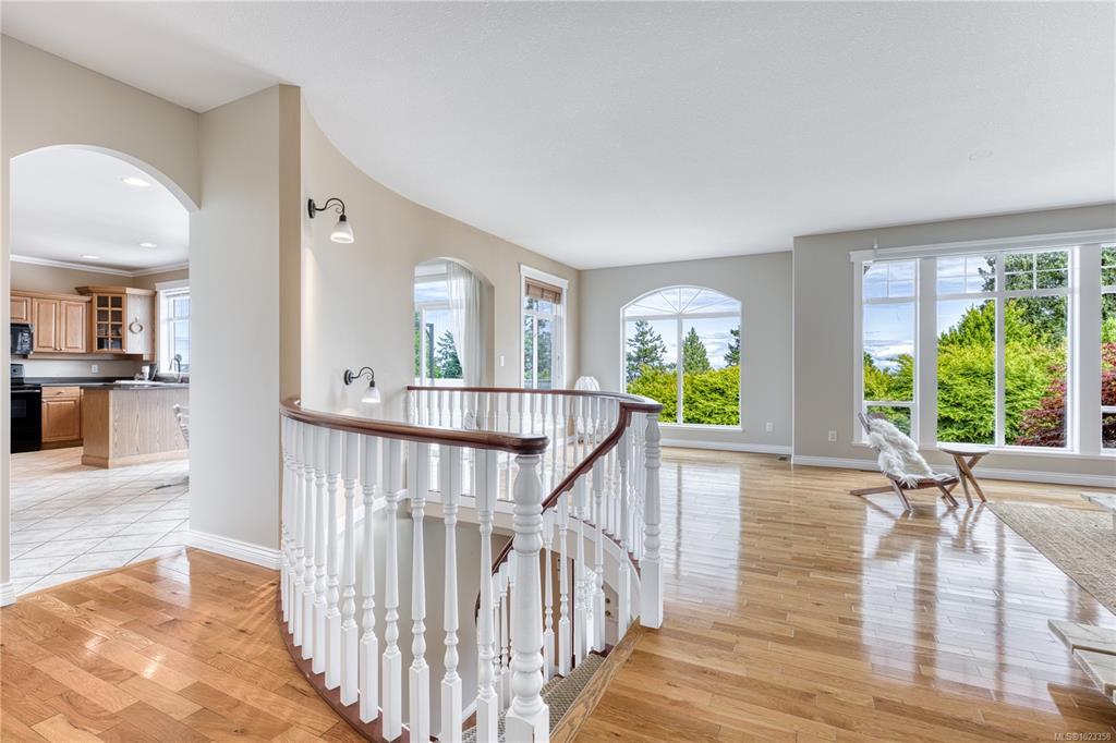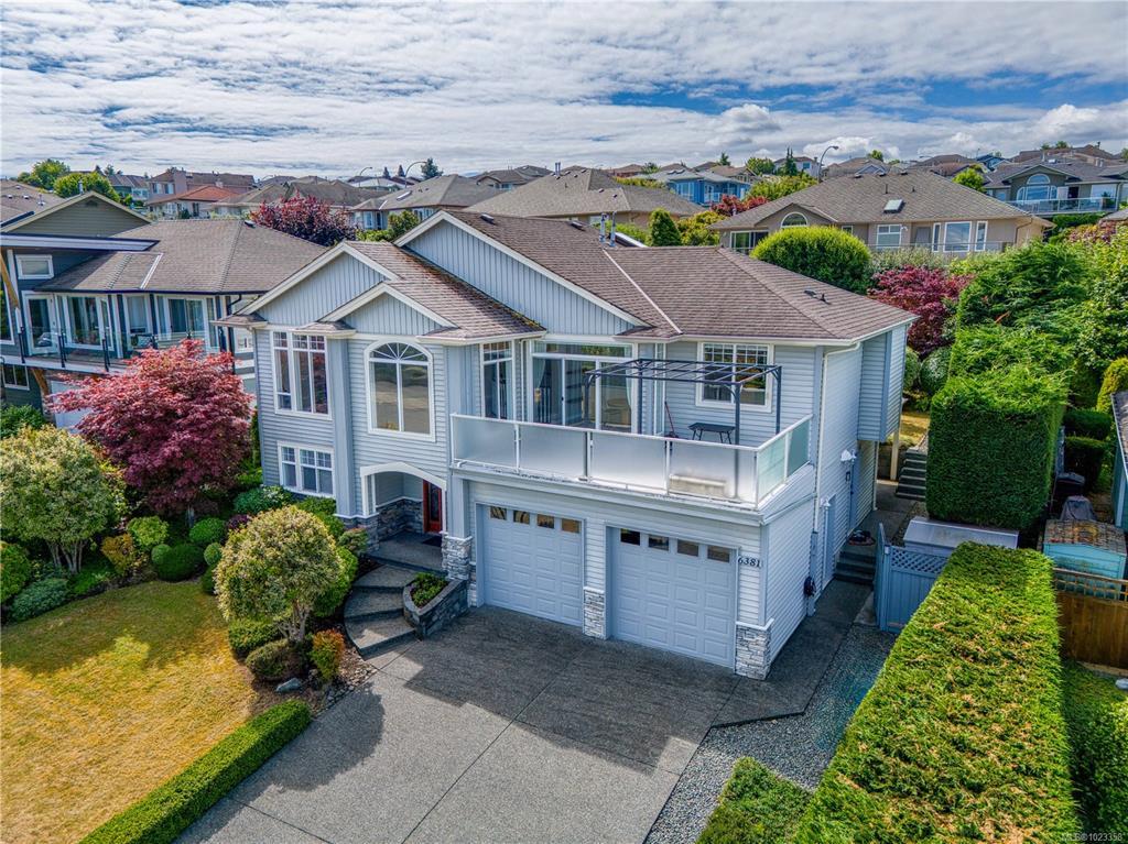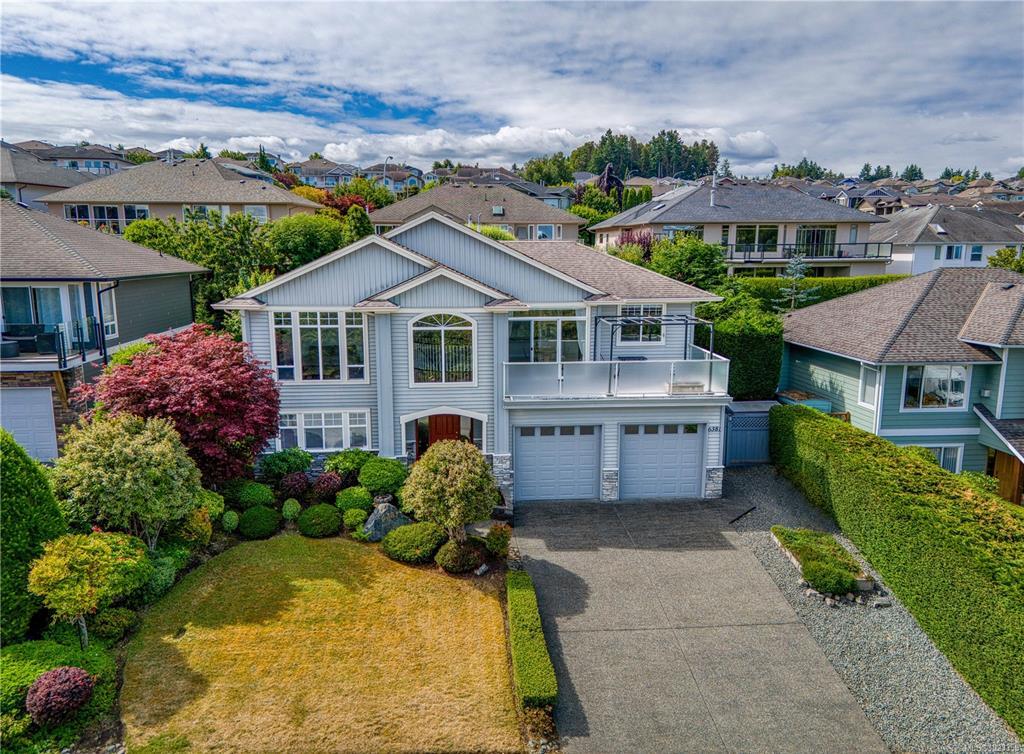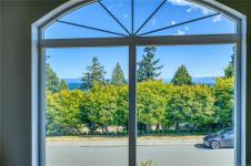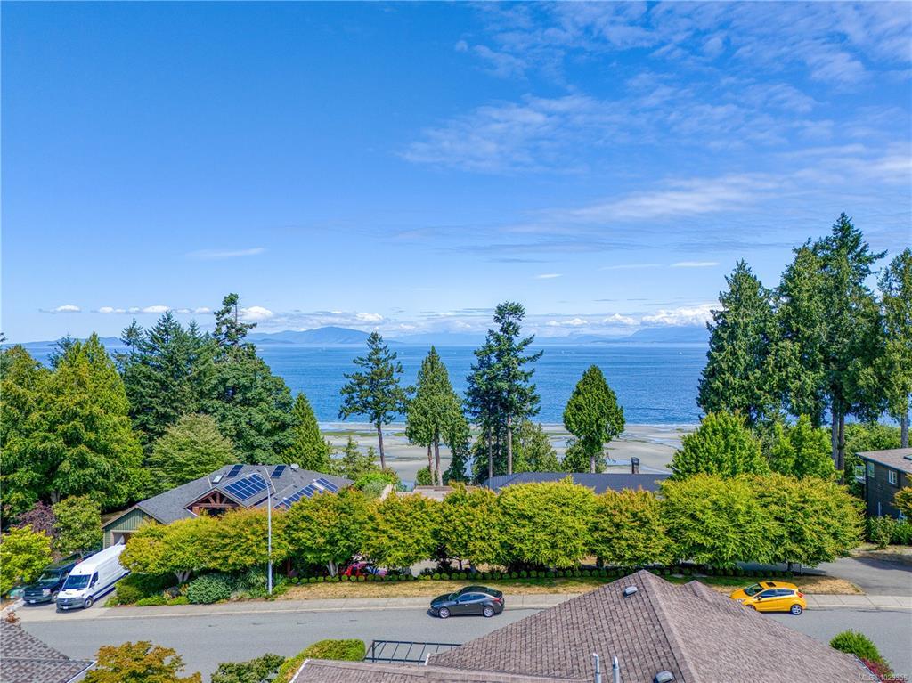 Semi-waterfront Eagle Point home with breathtaking ocean and snow mountains views, directly across from Lewis Beach Park and steps from beach access trails. Minutes from Woodgrove Mall, Costco, and top schools, this 5-bedroom home blends coastal charm with urban convenience. The main level boasts hardwood floors, a gas fireplace, a curved staircase, a dedicated office, two additional flexible-use rooms, and the primary bedroom, which features a walk-in closet, rear deck access, and a luxurious 4-piece ensuite with soaker tub and separate shower. The kitchen includes four appliances and a breakfast bar. The lower level offers a versatile 2-bedroom in-law suite with its own kitchen, laundry, and separate electrical meter—ideal for family, rentals, or Airbnb. The private rear yard, with minimal neighbor visibility, is beautifully landscaped with a covered patio. Extras include a sprinkler system, well maintained tree hedge. All data approximate; verify if fundamental.