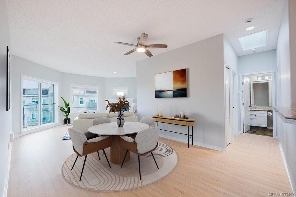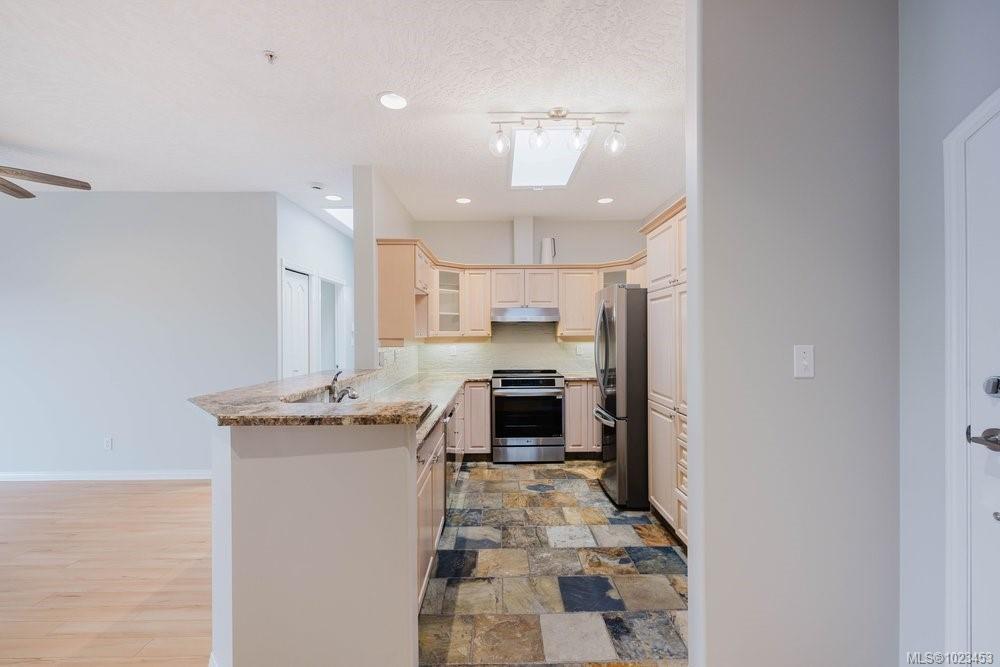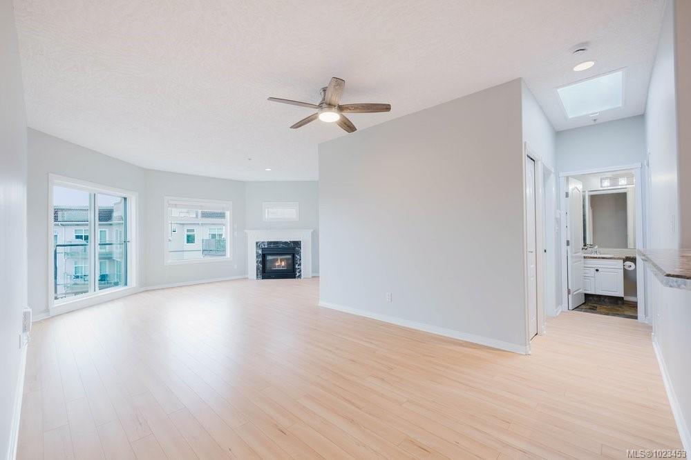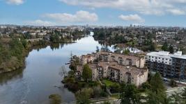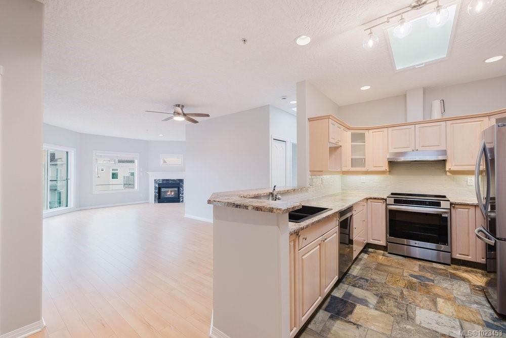 Top-floor 2 bed / 2 bath waterfront home with stunning Gorge Waterway views! High ceilings, two skylights, and water views and east facing create a bright, airy feel. Spacious primary with walk-through custom closet and ensuite, cozy gas fireplace, and balcony access from living room and primary bedroom. See the feature sheet for update details. Fully remediated, well-run strata with private dock, kayak & bike storage, gym, guest suite, workshop, car wash, and more. Secure gated community, minutes to downtown. Waterfront lifestyle at its best.