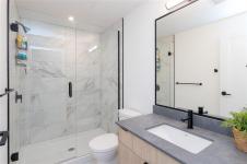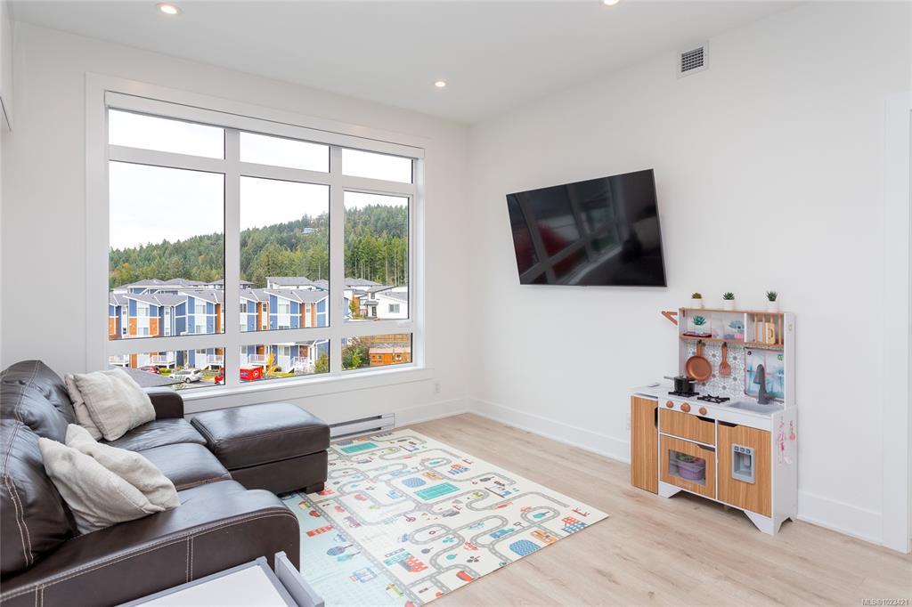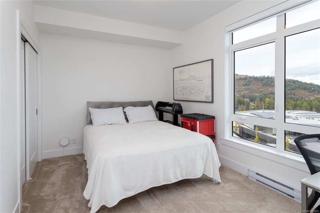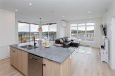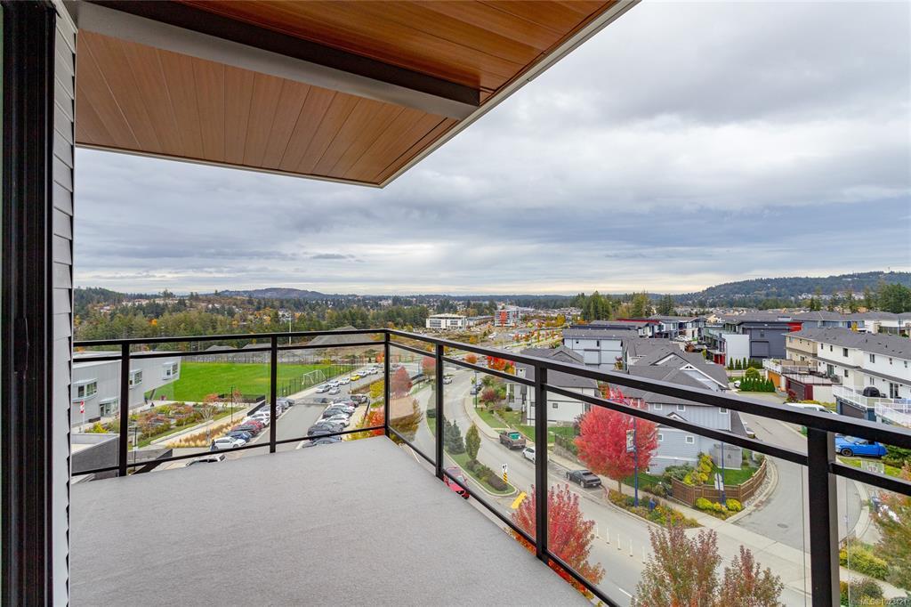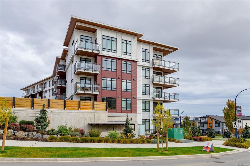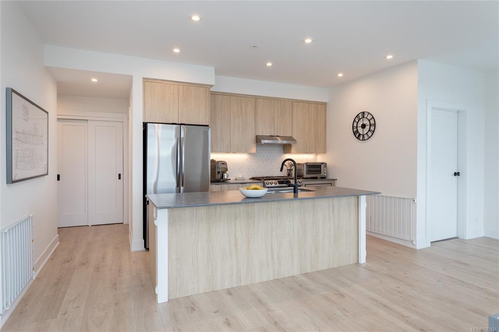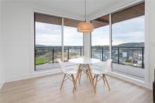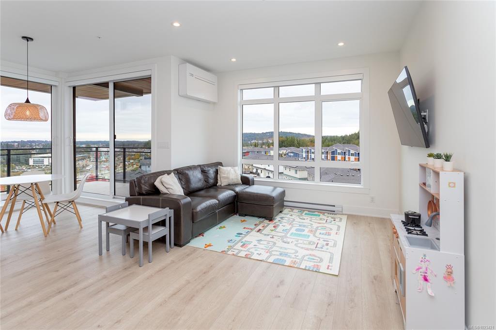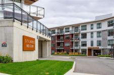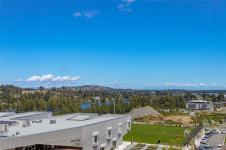 Welcome to Solaris at Westhills, a Built Green Certified community blending sustainability with modern elegance. This well-appointed 2-bedroom plus den, 2-bath condo features 9’ ceilings and lake views. The gourmet kitchen includes gas appliances, island, pantry, cabinetry, stone counters, tiled backsplash, and matte black hardware. The primary suite has a walk-in closet with custom shelving; the den suits office or guest room. Walk-in laundry room with full-size washer and dryer. This smart home provides integrated control for climate, lighting, and security, plus A/C and baseboard heat. Secure building with visitor access. EV-ready stall in a gated parkade, plus car wash, bike/locker storage, and pet wash. Landscaped courtyard with outdoor kitchen, dining areas, seating, and gas firepits. Surrounded by parks, trails, and urban amenities—shopping, dining, movies, cafés, more. Call your realtor now to book a viewing!