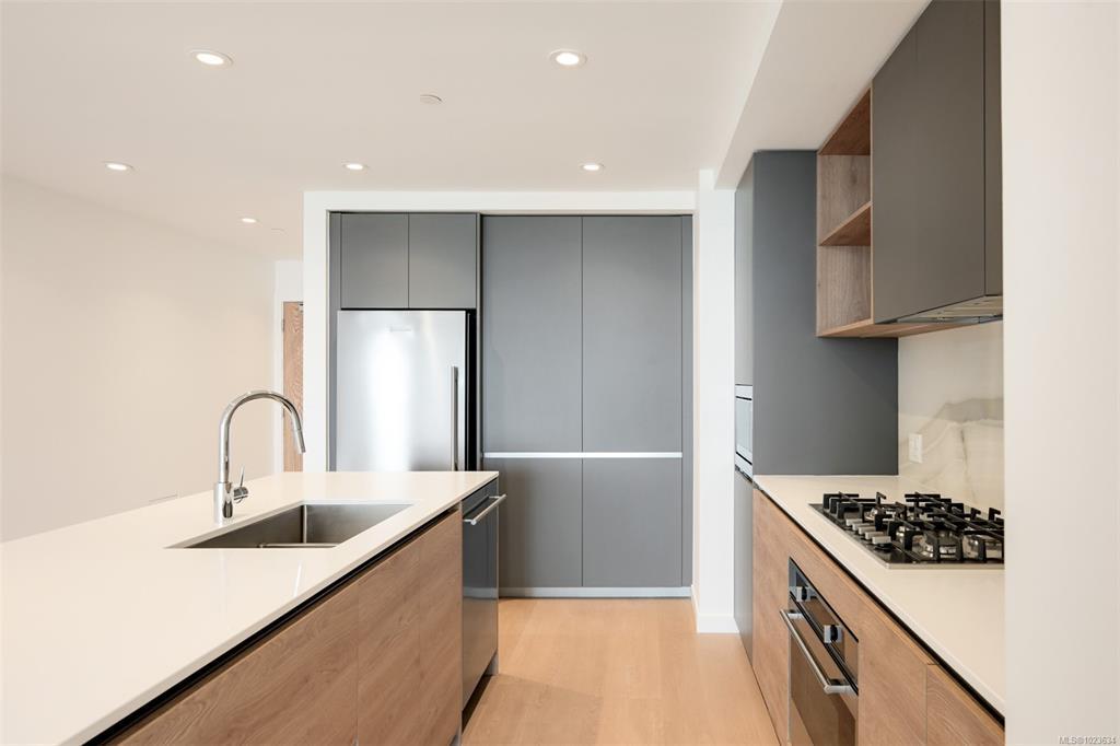 Welcome to Dockside by Bosa Development - 363 Tyee is a 13-storey, concrete building complete and MOVE IN READY. Enjoy Upper Gorge views from your living/dining room. BRAND NEW, designed with livability in mind, this 2 Bed+2 Bath offers 1010 sq.ft of living space and large balcony. The entertainment sized kitchen features Stosa Italian Cabinetry, Quartz Counters, and single slab backsplash. Pair it with high-end appliances: Blomberg Fridge, Dishwasher, Fulgor Milano Oven and Gas Cooktop. Multiple storage cabinets and closets make condo living easy! Resident exclusive amenities include a rooftop patio with BBQ cooking, dining and gas fire pit, an equipped fitness facility, social lounge, pet wash, and bike tuning station. Spanning 15 acres along the Upper Harbour, where Vic West meets downtown Victoria, Bosa Development is bringing purposefully designed homes to Dockside Green, continuing the legacy of this transformational waterfront community. Price + GST.