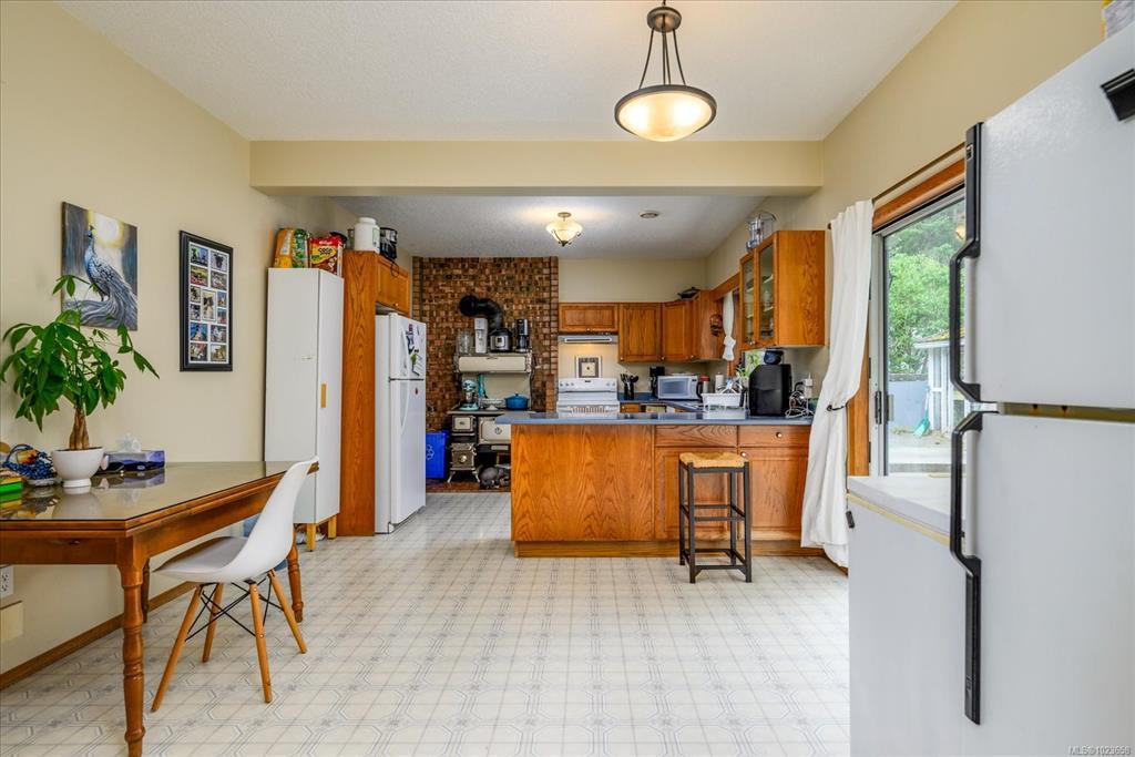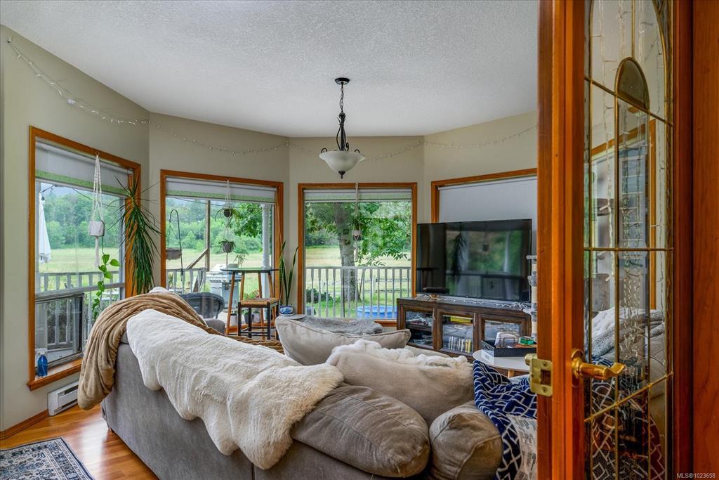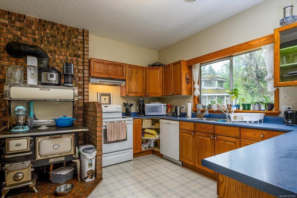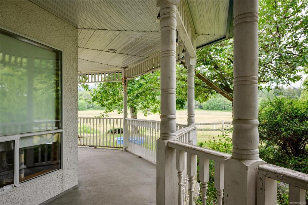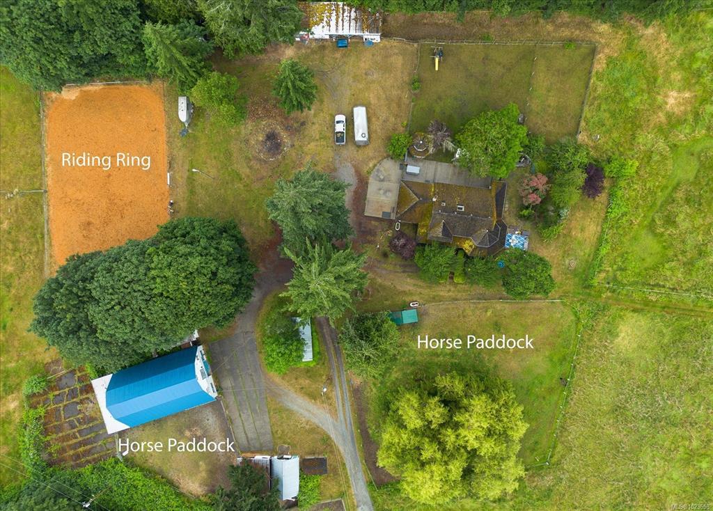 Idyllic 34 acre property in the desirable Jingle Pot area of Nanaimo! At the end of the winding driveway, across cleared fields and a small stream is a 3 bed plus den, 2 bath farmhouse with a wrap around porch, large barn, paddocks, implement shed, outbuilding and riding ring. The homestead is surrounded by mature trees providing both privacy and shade. Every room in the house has beautiful views, especially the picture windows in living room and primary bedroom that look out across the fields over to Mount Benson – the sunset is spectacular! As ALR land there are plenty of options for self sustainable living with hayfields and gardens, plus the barn and outbuildings serve a variety of businesses and hobbies. Come enjoy quiet and solitude just minutes from town.