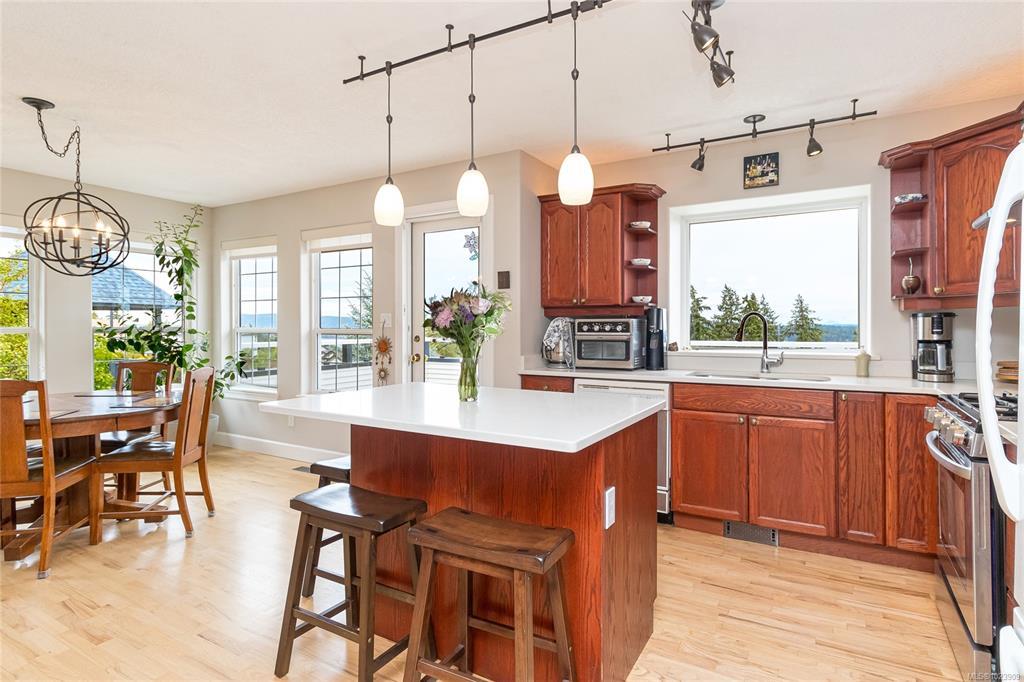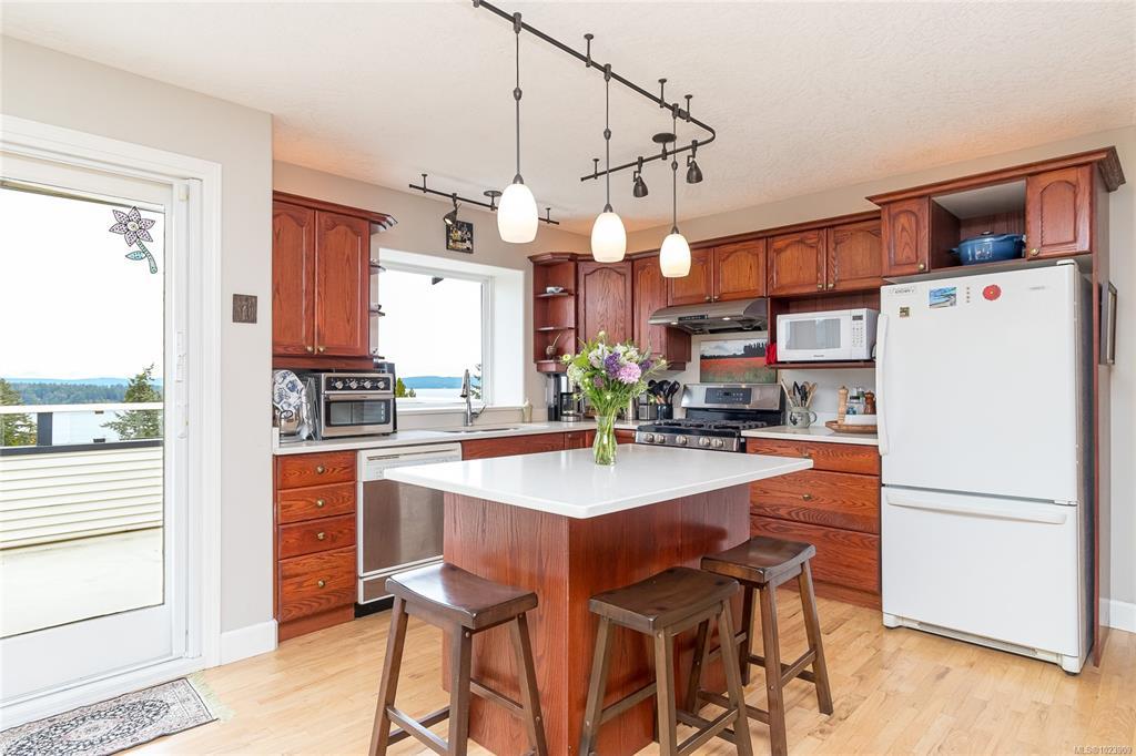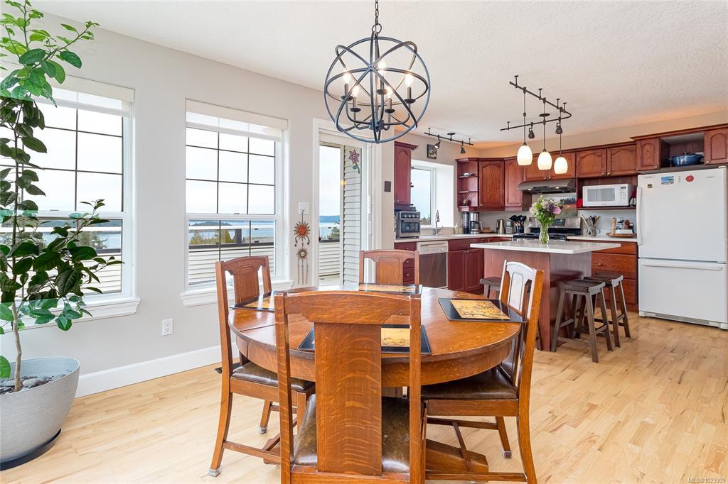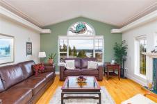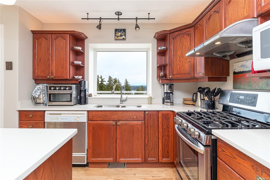 Enjoy sweeping 180° ocean views and stunning sunrises from the front deck of this well-cared-for home. Designed for flexibility, park on Gourlay Place and walk straight into main level living or use the garage entry on Louise Rd; An ideal option for easy access or unloading. Inside, vaulted ceilings, hardwood floors, and a bright open layout create a welcoming space to gather with family and friends. The kitchen and living areas are generous in size, perfect for entertaining, many updates over the years, including countertops and bathroom vanities, adding modern comfort. With room for a family yet convenient for retirees wanting main-level living, this property offers RV parking, a low-maintenance yard, new roof in 2024 and a location close to shopping, golfing, trails and more. A beautiful view, practical design, and warm neighborhood make this home an exceptional find.