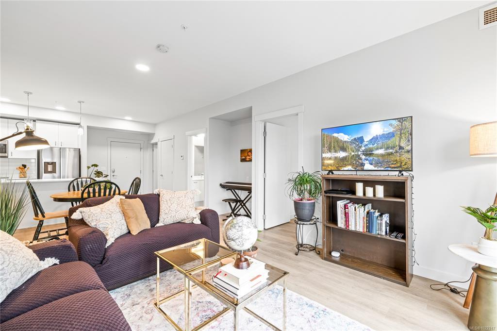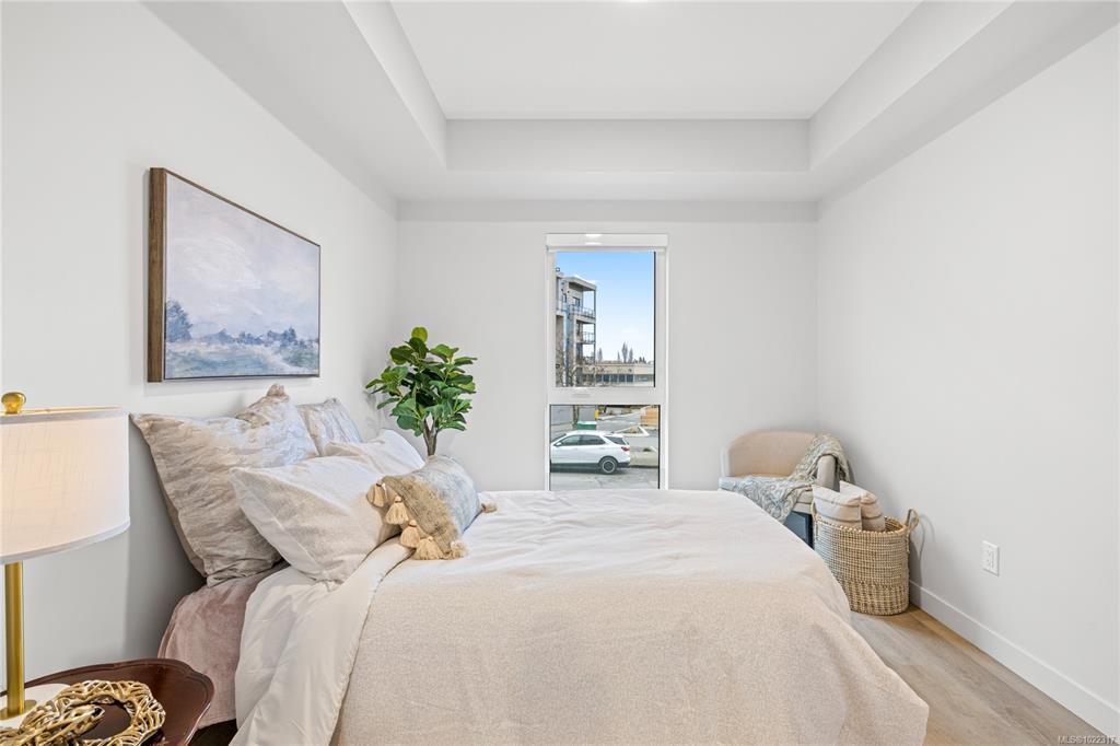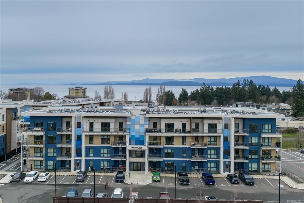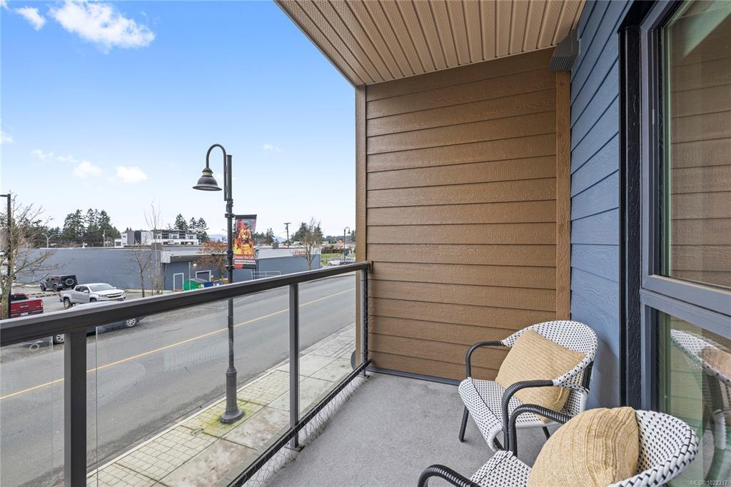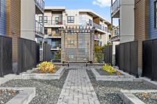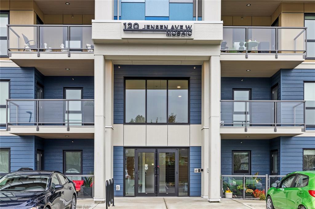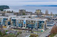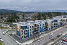 Welcome to Mosaic, a modern 2 bed/2 bath home built in 2023. This light filled first floor unit offers easy access while sitting above street level for added privacy, with open sightlines to the coastal mountains and a peekaboo ocean view. Oversized windows enhance the airy feel, while the stylish kitchen features quartz countertops, soft close cabinetry and a large island. The open floor plan is ideal for entertaining and extends to a covered balcony perfect for morning coffee or summer evenings. Both bedrooms feature walk-in closets, complemented by an in-suite laundry/storage room plus a separate storage locker. Included is a sought after underground parking stall with opt. EV charging upgrade. Designed with efficiency, the home offers a heat pump for heating/cooling, hot water on demand, triple pane windows and smart water shut off. Steps to Parksville’s main beach, groceries, coffee shops, restaurants and trails, this is central living at its best. Pet/rental friendly.