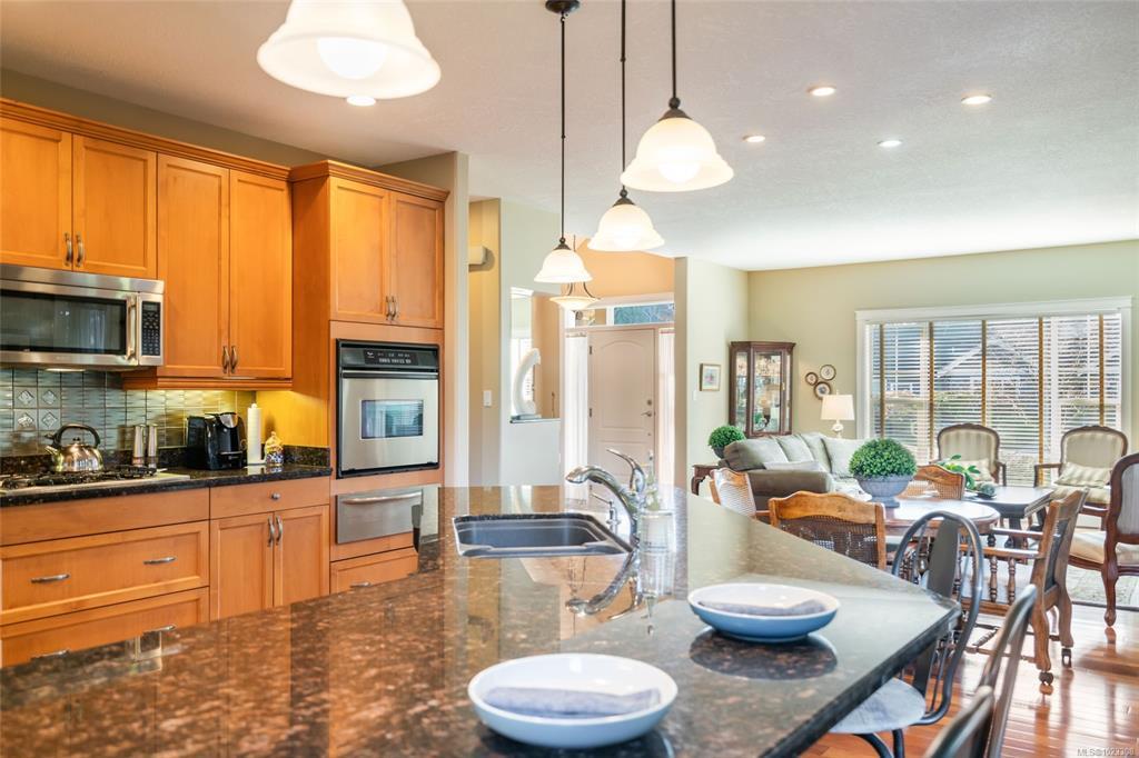 Executive Elegance in Aerie Estates. This beautifully appointed home is ideally located on a meticulously landscaped, expanded lot in the prestigious Aerie Estates community close to Parksville's amenities. A bright foyer with cathedral ceilings welcomes you into an open-concept living space featuring wood floors, oversized windows and a cozy natural gas fireplace. The chef’s kitchen offers a walk-in pantry, granite sink, premium appliances, and generous counter space, perfect for entertaining. The main-level primary suite provides comfort with a walk-in closet and spa-inspired 5-piece ensuite. Upstairs features a spacious family room, dedicated office, two additional bedrooms, and a full bathroom. Enjoy a private, fully fenced backyard with a peaceful patio retreat. Additional highlights include a heat pump, furnace, 4.5-foot crawl space, double garage, security system, and underground sprinklers. An exceptional opportunity in one of Parksville’s most desirable neighborhoods.
