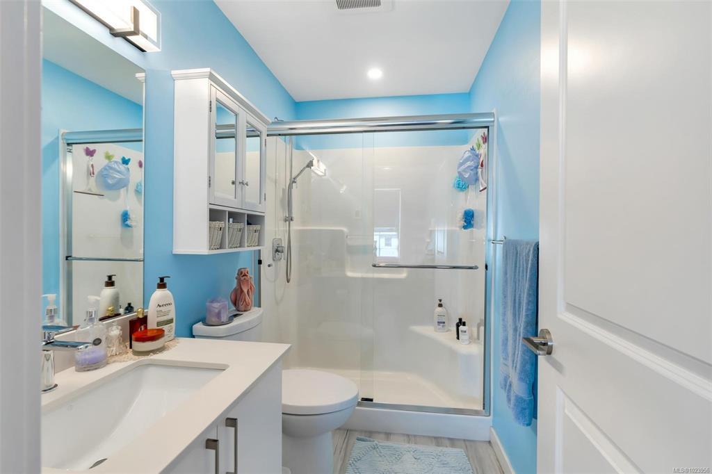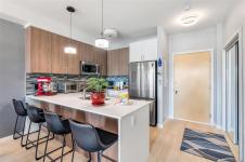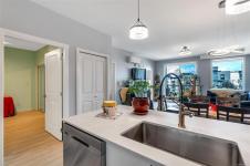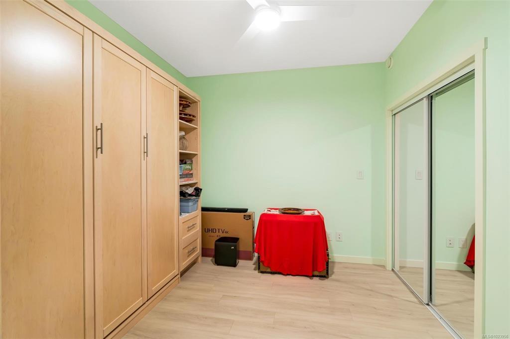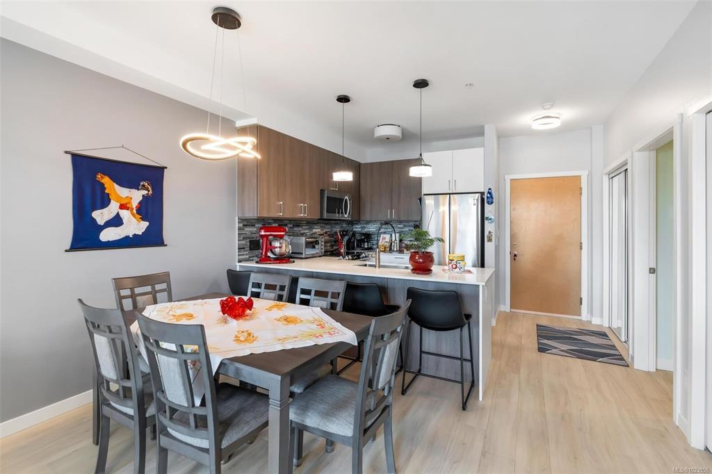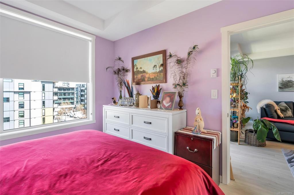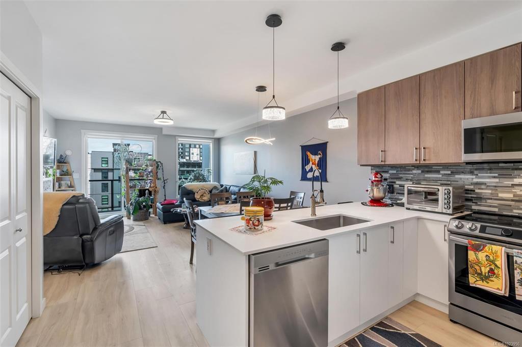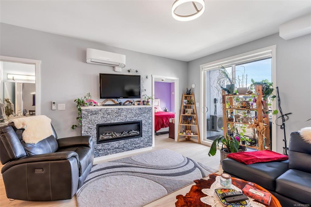 Bright and beautiful 2 bed, 2 bath condo in Pacific Trilogy Two—a modern 6-storey building in the heart of downtown Langford. This like new home features a functional open-concept layout with 9-ft ceilings, a chef’s kitchen with quartz countertops and stainless appliances, and spacious living/dining areas with an electric fireplace and access to a sunny balcony—perfect for your morning coffee. The primary bedroom includes a 3-piece ensuite with built-in closet organizers. Comfort is ensured year-round with an efficient heat pump offering heating and air conditioning. Additional owner upgrades include heated tile floors in both bathrooms, custom Murphy bed, fresh paint, updated tile work, Lutron smart switches, and new LED lighting. Secure parking included with E/V rough in. This award-winning, pet-friendly building also offers a fitness centre, bike storage, and a 91 Walk Score -just minutes to shopping, restaurants, parks, and recreation. Vacant and available for immediate possession.