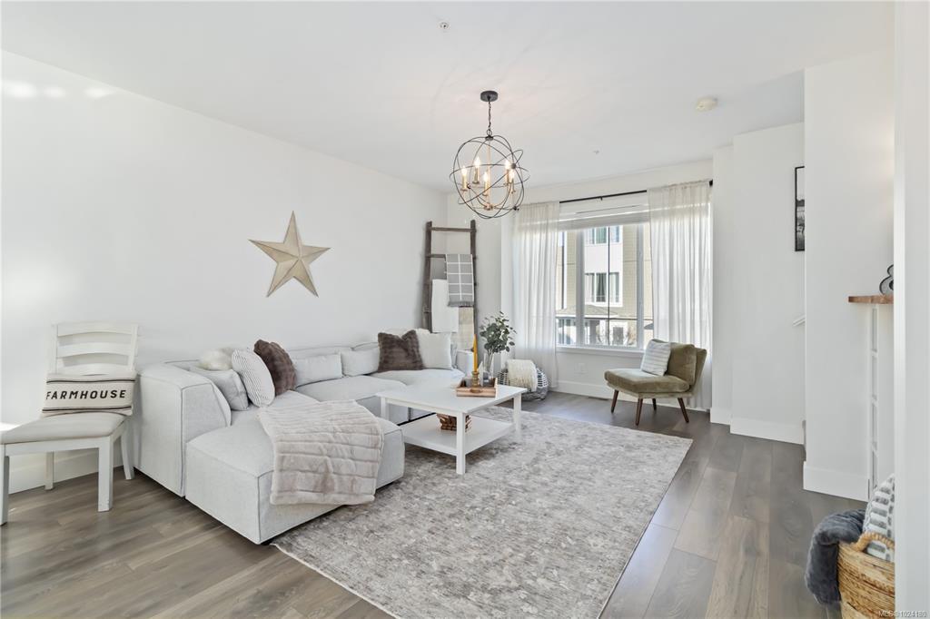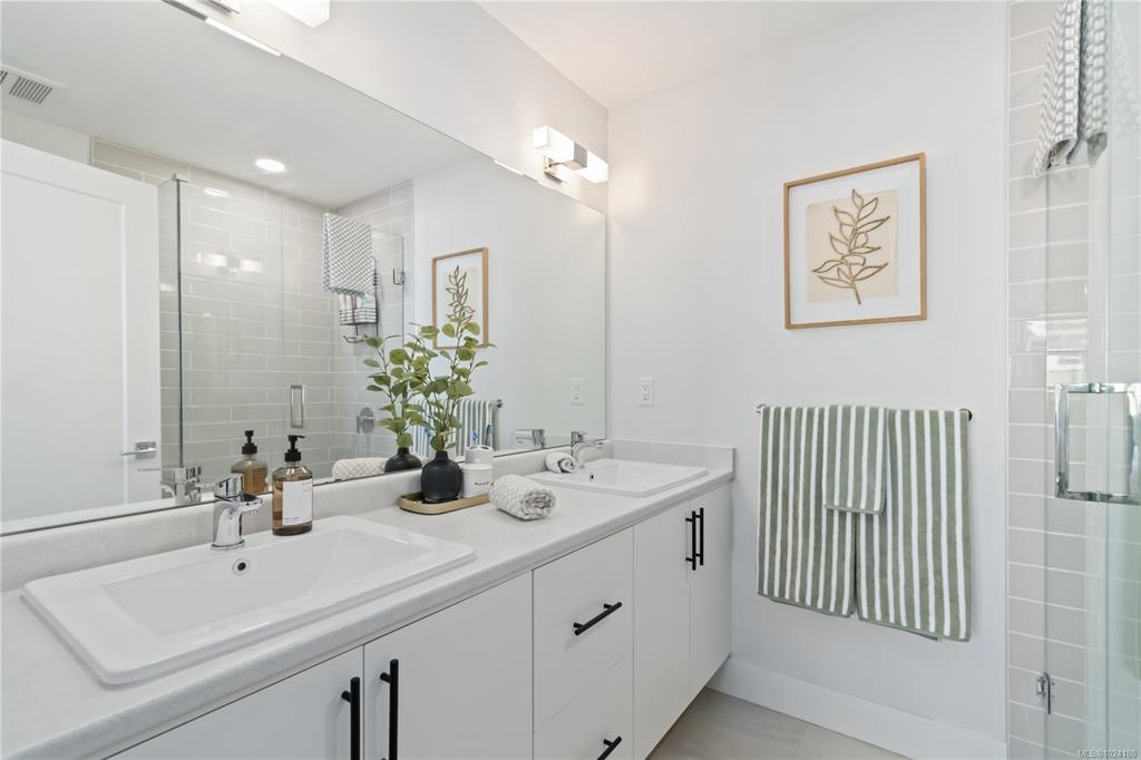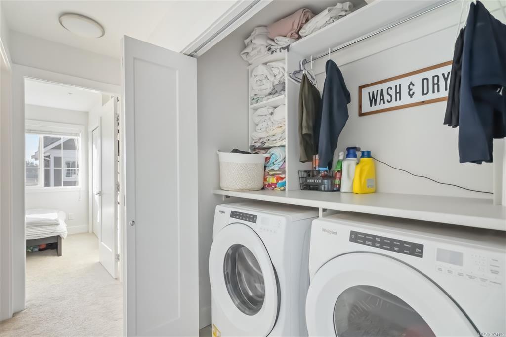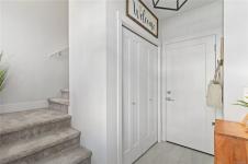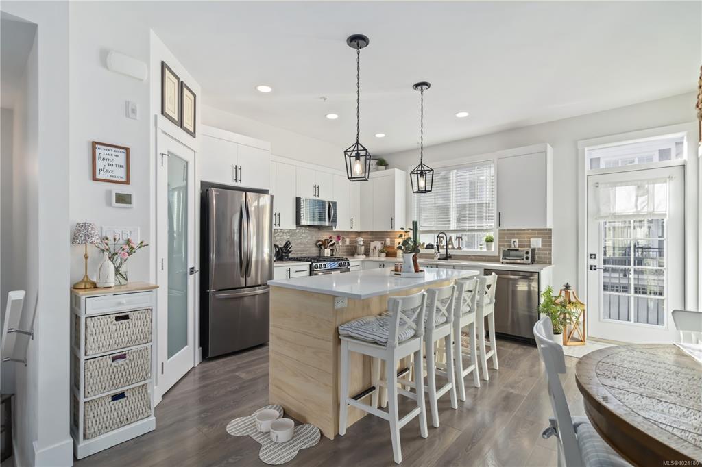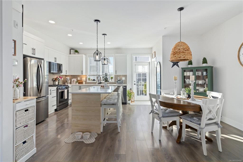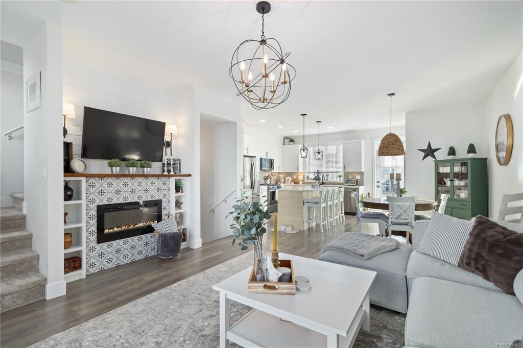 Experience "Compass" in Royal Bay! This 2021 GableCraft luxury townhome is loaded with upgrades. The open main floor features 9' ceilings, a custom built-in electric fireplace with ambiance settings, and a chef's kitchen with a new island, walk-in pantry, and new black stainless appliances (less than 1 yr old) including a gas range. Enjoy a 20'+ sunny balcony with peek-a-boo water views. Upstairs find 3 beds, a laundry room with custom counters/shelving, and a primary suite with walk-in closet and spa-like double vanity ensuite. The lower level offers a 4th bed/den leading to a private fenced yard. Highlights: double garage with EV hookup, gas furnace, gas hot water on demand, and low strata fees ($333/mo) including water/garbage. Walk to the beach, schools, and shopping! Meticulous condition with new home warranty. Best in class—book now! All sizes approx; Buyer to verify.