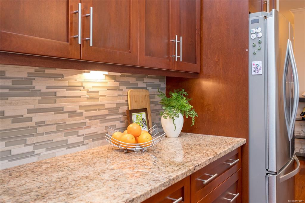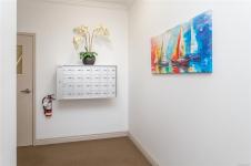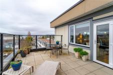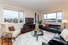 Location, location! This SE corner penthouse offers exquisite coastal living in the heart of friendly Sidney by the Sea, just one block from shops, restaurants & services, and only a few blocks from the waterfront promenade & iconic fishing pier. This 1470 sq.ft. light-filled home sits on the quiet side of the building, offering excellent privacy with no traffic noise and ocean & mountain views from every window. Open-concept layout features a well-appointed kitchen with solid-surface countertops, central island, SS appliances & gas range option. Relax in the spacious living room with a cozy natural gas fireplace. The generous primary bdrm, 3 baths & in-suite storage room (or home office) provide rare flexibility. Entertain on the exceptionally large SE-facing wrap-around balcony, perfect for enjoying city, ocean & mountain views. Additional highlights include a new hot water tank, bike storage, parking stall & private storage locker. Pet-friendly, all ages welcome, rentals permitted.