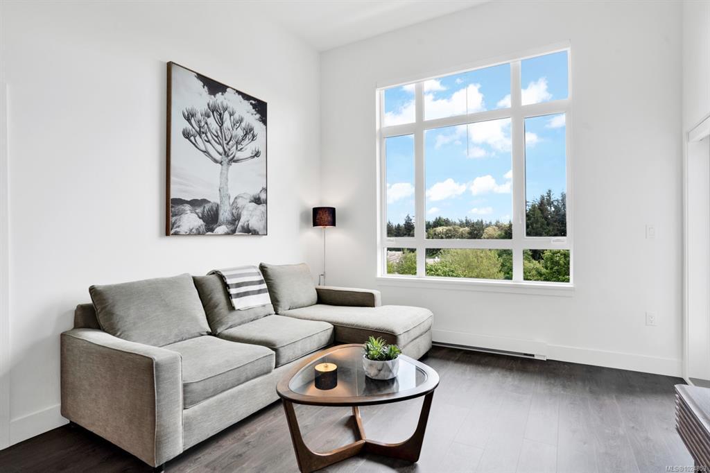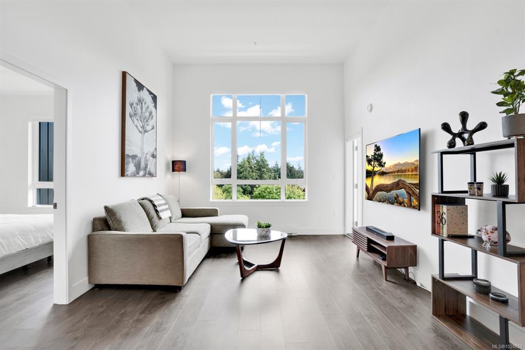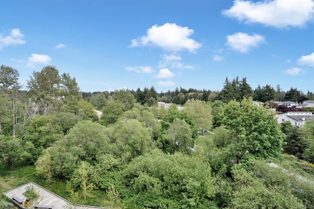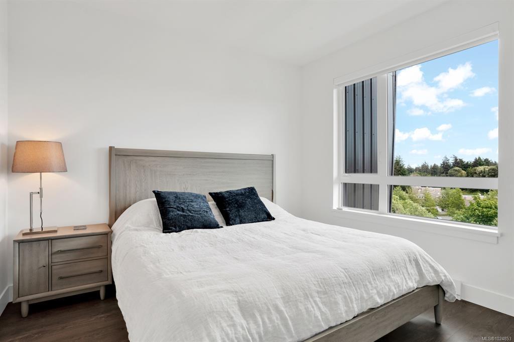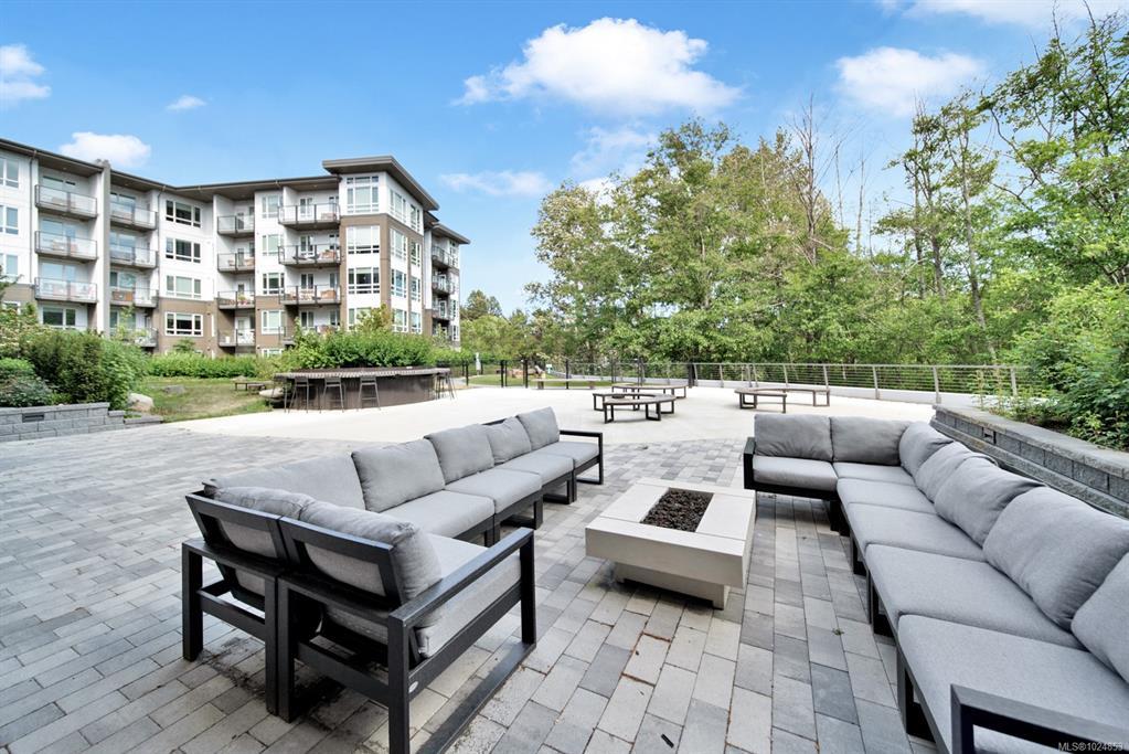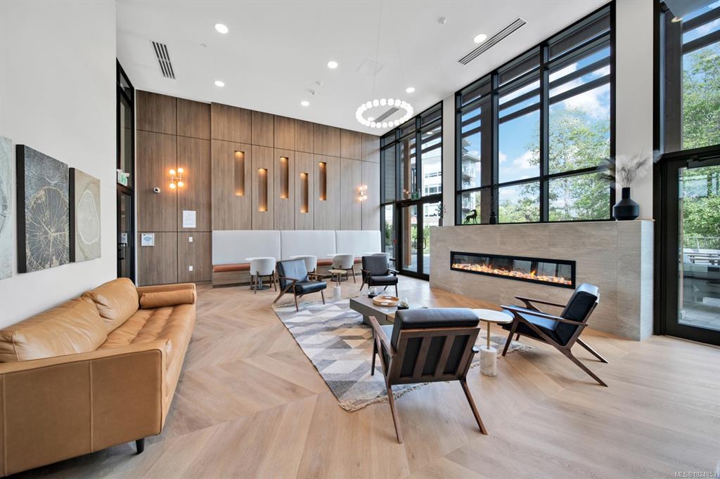 Private, top-floor 2 bed, 2 bath condo at Reunion in Langford’s Belmont community. Nearly 1,000 square feet of well-designed space with elevated ceilings and oversized windows for great natural light. Bedrooms are separated for privacy, plus there's a work-from-home nook. The kitchen features full-height cabinetry, quartz countertops, Whirlpool appliances, and a large island. The primary suite includes a walk-through closet and ensuite with double sinks and glass shower. Private covered balcony has treetop views and a gas BBQ hookup. Full-size in-suite laundry, large pantry storage, secure underground parking, and storage locker included. Pet- and rental-friendly building. Amenities include fireside lounge, chef’s kitchen, gym, outdoor BBQ area, dog wash, dog run/play area, and bike storage. Across from Belmont Market and Westshore Town Centre. Direct access to Galloping Goose Trail and close to parks, lakes, and Bear Mountain.