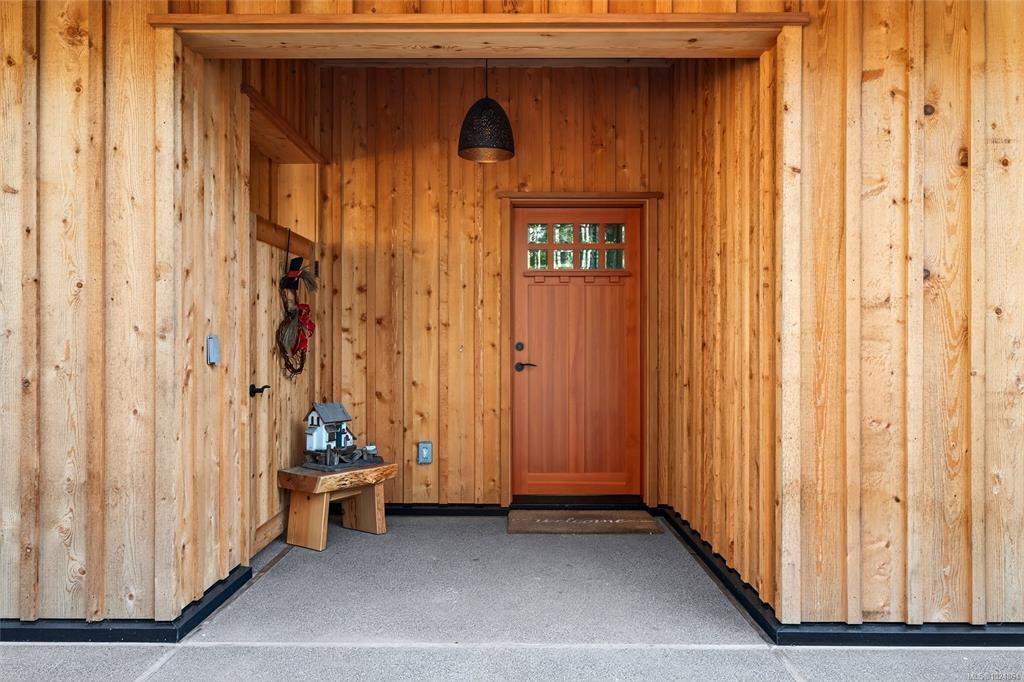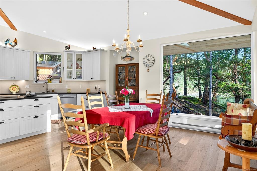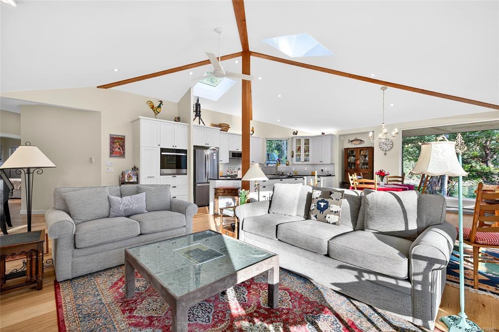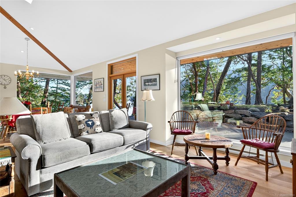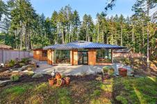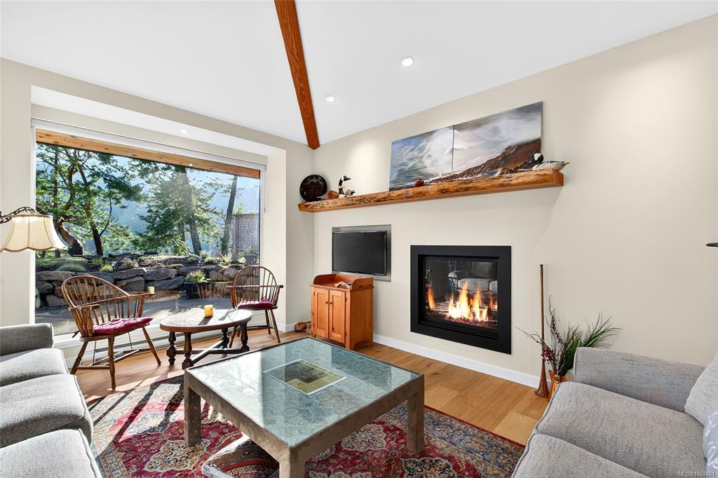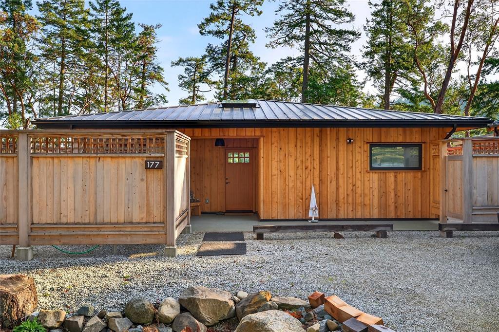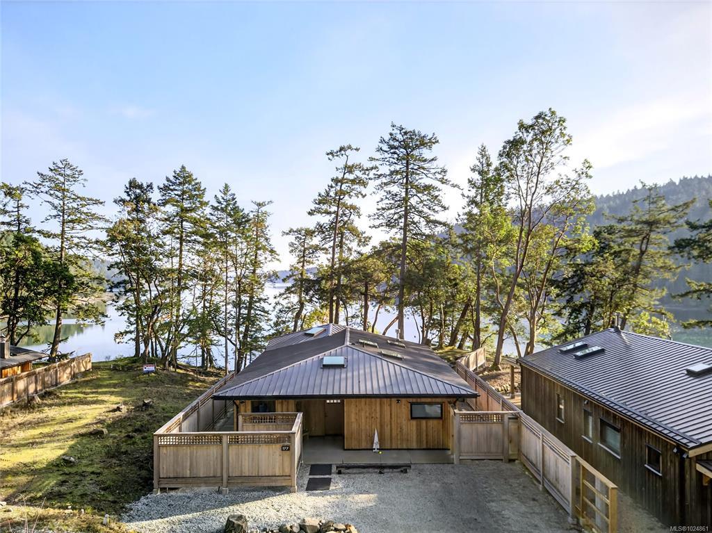 Stunning oceanfront residence showcasing refined West Coast design and quality craftsmanship. This custom-built 2-bedroom, 2-bathroom plus den home is truly turnkey, offering approximately 1,600 square feet of thoughtfully designed living space. An open-concept layout with vaulted ceilings, exposed wood beams, and custom millwork creates warmth and flow, while large windows fill the home with natural light and connect it to the surrounding coastal setting and wildlife.