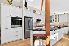 The kitchen features custom cabinetry, a generous island with seating, and stainless steel appliances, seamlessly connecting to the dining and living areas—ideal for everyday living and entertaining.