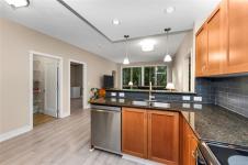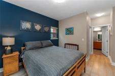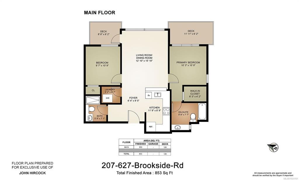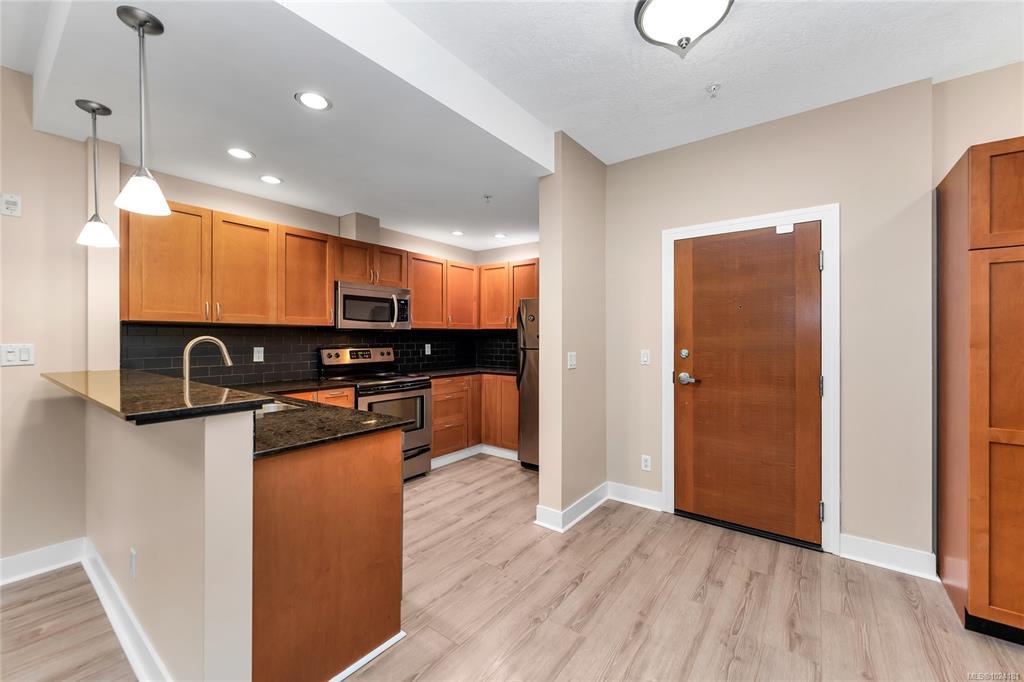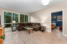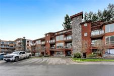 This 2 bedroom 2 bathroom home offers over 850 sq ft. Spacious Kitchen with maple shaker cabinets, stone counters with tile backsplash, stainless appliances, and breakfast bar. Good sized living room with access to the covered deck. Generous master bedroom with walk in closet and full ensuite. Second bedroom and bathroom, insuite laundry room, Fresh paint and flooring. Cozy SOUTH facing corner suite overlooking the bucolic pedestrian wildlife corridor. Steps to the Red Barn Market, Pharmacy, and Olympic View Golf Course. Short stroll to the vibrant Beach Lands Waterfront. Your Realtor can access more information and assist you on your private showing. Please have them call.