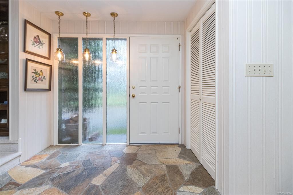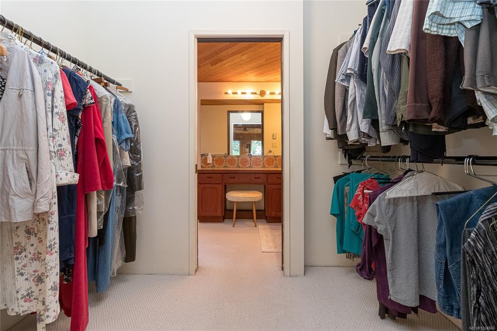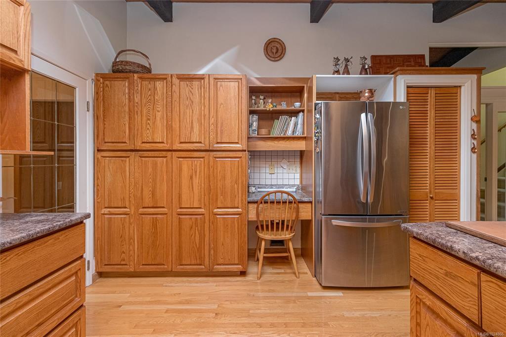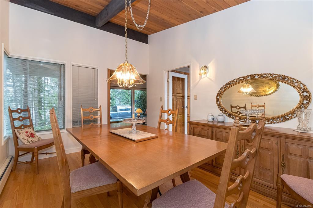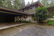 Nestled on a private 1 acre property with some waterviews, this spacious, Westcoast style , split-level home offers room for the whole family in a great neighborhood. The main level offers an office, formal living room with vaulted cedar ceilings and cozy wood-burning fireplace, a formal dining room with large windows, french door & wood floors, perfect for entertaining. The kitchen has an eating area that overlooks the sunken family room, complete with a cozy gas fireplace and wet bar, there is also the laundry & 2 piece bath. The added bonus is a 600 sq ft sunroom with an additional gas fireplace that offers many options, games room, media space, or home gym. The upper level offers 4 generous bedrooms, master with many wood accents, ensuite with a sunken jetted tub,shower & bidet. So much natural wood indoors that adds to the Westcoast design. Wonderful outdoor patio areas, . Also an added bonus of a separate 456 sq ft detached shop, a two-car carport, all surrounded by nature.