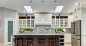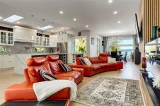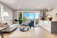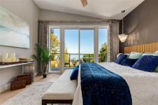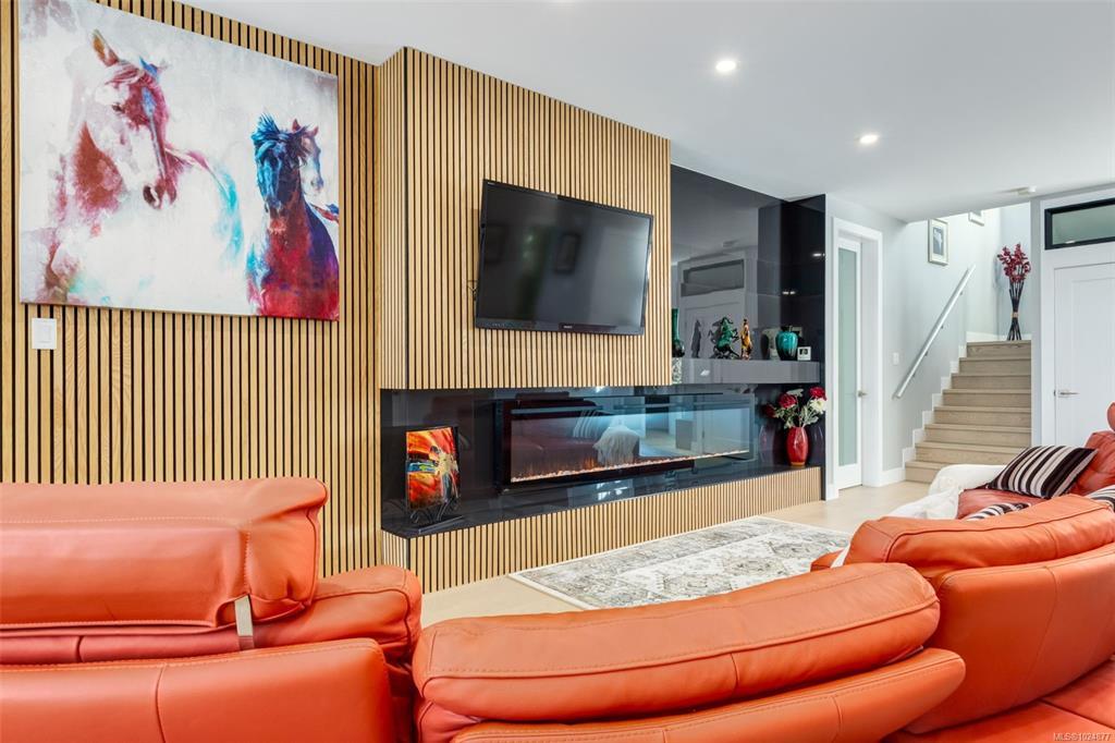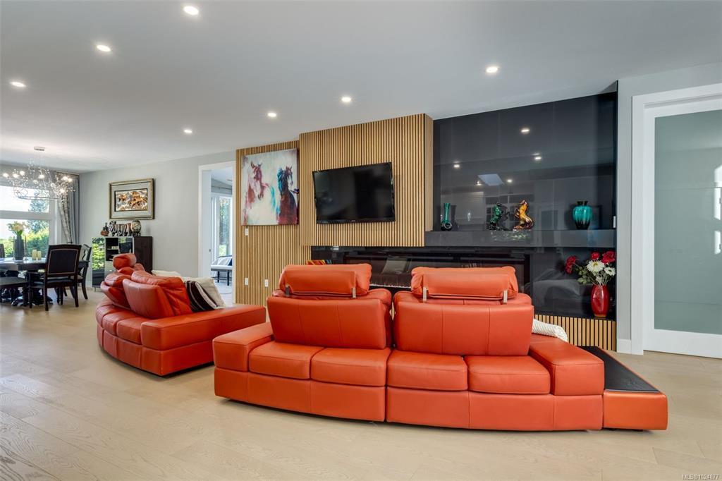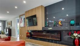 Designed for elegance, this home features four bedrooms, five bathrooms, a gym, office, and generous outdoor living space. The chef's kitchen with a large quartz island flows into an open-concept living area with a striking fireplace and a wall of windows framing the view.