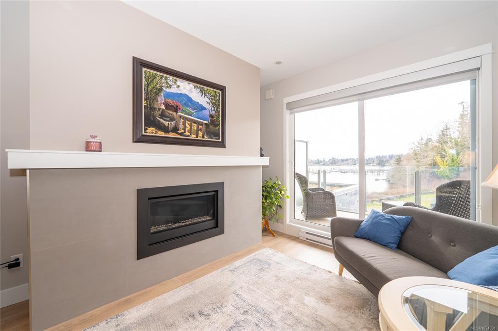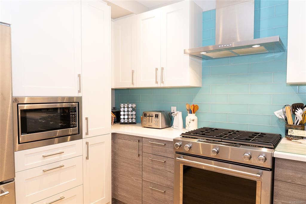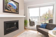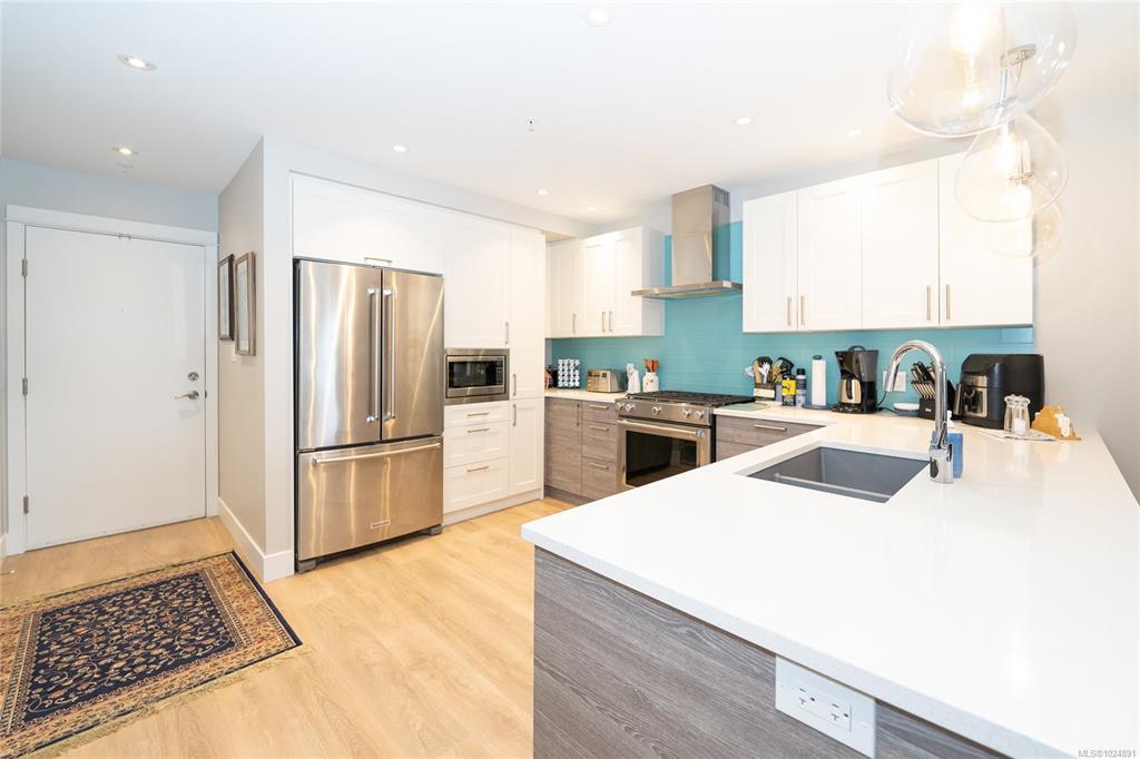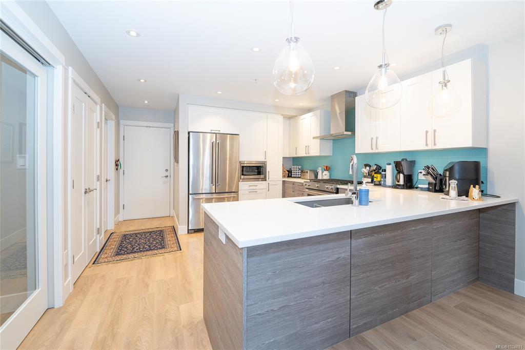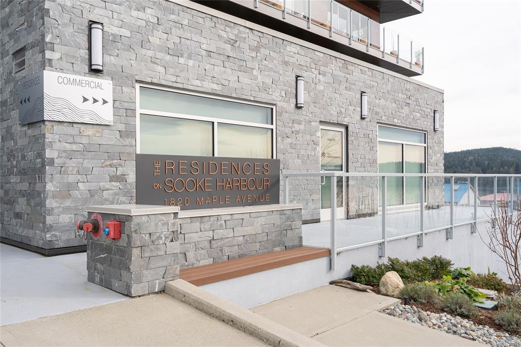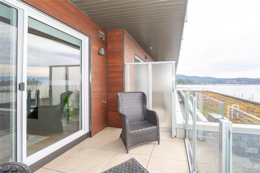 Enjoy refined oceanfront living in this oversized 1-bed, 1.5-bath residence offering just under 900 sq. ft. of thoughtfully designed space. The open-concept layout features a stylish kitchen with stainless KitchenAid appliances, gas range, quartz countertops, and seamless flow to the dining and living areas. Step outside to an expansive 263 sq. ft. patio with gas BBQ hookup—ideal for entertaining while taking in ocean and mountain views. Quality finishes include oak hardwood flooring, 9-ft ceilings, and oversized windows that flood the home with natural light. The king-size primary bedroom connects to a spa-inspired ensuite with dual vanities, soaker tub, glass shower, heated floors, and private water closet. A separate powder room, secured underground parking, and storage locker complete the home. Located in the exclusive Residences on Sooke Harbour, a boutique collection of just 27 oceanfront homes offering a private fitness studio, kayak storage with ocean access, and secured entry.